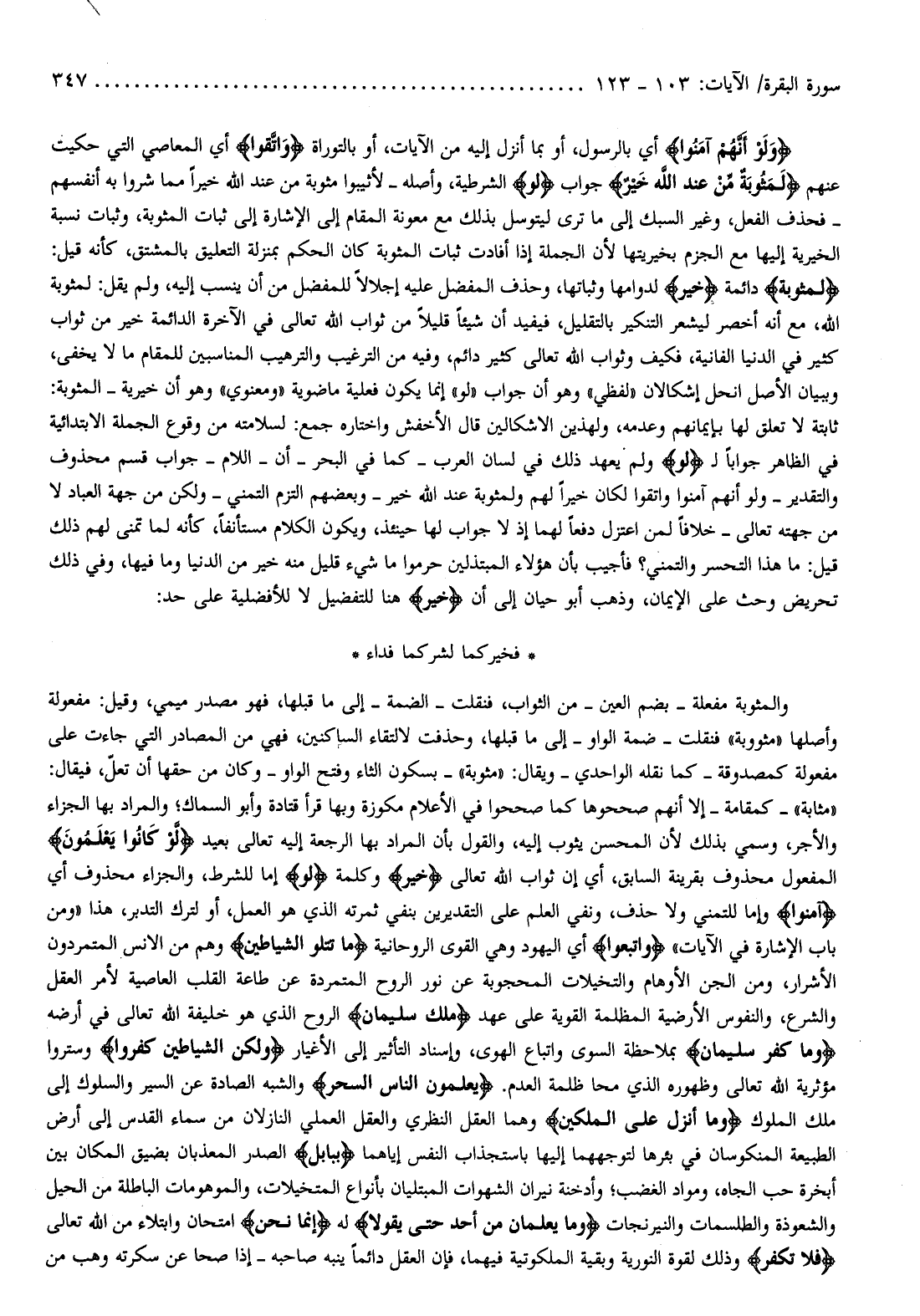 «مثابة» - كمقامة- إلا أنهم صححوها كما صححوا في الأعلام مكوزة وبها قرأ قتادة وأبو السماك والمراد بها الجزاء والأجر، وسمي بذلك لأن المحسن يثوب إليه، والقول بأن المراد بها الرجعة إليه تعالى بعيد لَوْ كانُوا يَعْلَمُونَ المفعول محذوف بقرينة السابق، أي إن ثواب الله تعالى خَيْرٌ وكلمة لَوْ إما للشرط، والجزاء محذوف أي آمَنُوا وإما للتمني ولا حذف، ونفي العلم على التقديرين بنفي ثمرته الذي هو العمل، أو لترك التدبر، هذا «ومن باب الإشارة في الآيات» وَاتَّبَعُوا أي اليهود وهي القوى الروحانية ما تَتْلُوا الشَّياطِينُ وهم من الانس المتمردون الأشرار، ومن الجن الأوهام والتخيلات المحجوبة عن نور الروح المتمردة عن طاعة القلب العاصية لأمر العقل والشرع، والنفوس الأرضية المظلمة القوية على عهد مُلْكِ سُلَيْمانَ الروح الذي هو خليفة الله تعالى في أرضه وَما كَفَرَ سُلَيْمانُ بملاحظة السوي واتباع الهوى، وإسناد التأثير إلى الأغيار وَلكِنَّ الشَّياطِينَ كَفَرُوا وستروا مؤثرية الله تعالى وظهوره الذي محا ظلمة العدم. يُعَلِّمُونَ النَّاسَ السِّحْرَ والشبه الصادة عن السير والسلوك إلى ملك الملوك وَما أُنْزِلَ عَلَى الْمَلَكَيْنِ وهما العقل النظري والعقل العملي النازلان من سماء القدس إلى أرض الطبيعة المنكوسان في بئرها لتوجههما إليها باستجذاب النفس إياهما بِبابِلَ الصدر المعذبان بضيق المكان بين أبخرة حب الجاه، ومواد الغضب وأدخنة نيران الشهوات المبتليان بأنواع المتخيلات، والموهومات الباطلة من الحيل والشعوذة والطلسمات والنيرنجات وَما يُعَلِّمانِ مِنْ أَحَدٍ حَتَّى يَقُولا له إِنَّما نَحْنُ امتحان وابتلاء من الله تعالى فَلا تَكْفُرْ وذلك لقوة النورية وبقية الملكوتية فيهما، فإن العقل دائما ينبه صاحبه- إذا صحا عن سكرته وهب من