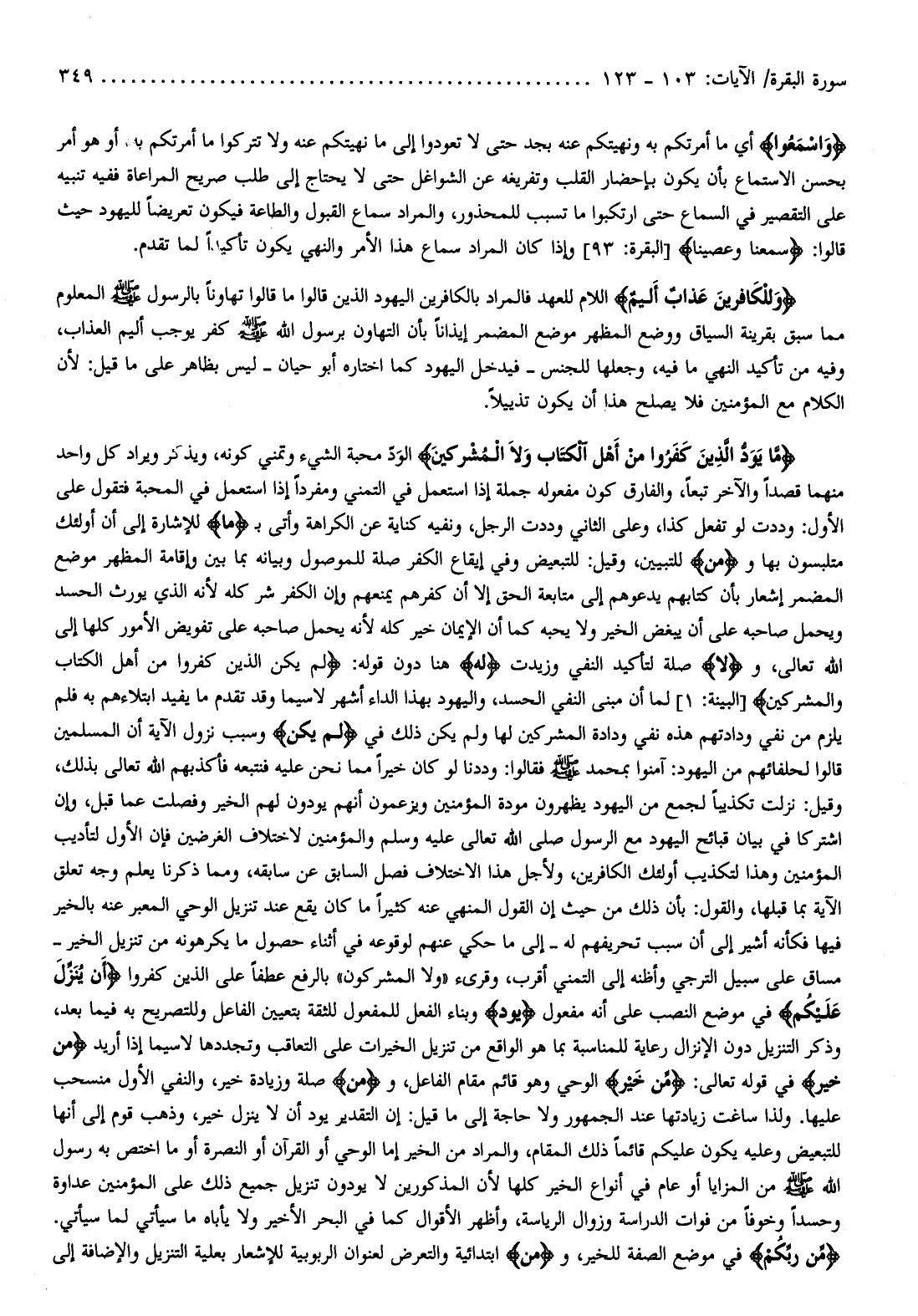 ما يَوَدُّ الَّذِينَ كَفَرُوا مِنْ أَهْلِ الْكِتابِ وَلَا الْمُشْرِكِينَ الودّ محبة الشيء وتمني كونه، ويذكر ويراد كل واحد منهما قصدا والآخر تبعا، والفارق كون مفعوله جملة إذا استعمل في التمني ومفردا إذا استعمل في المحبة فتقول على الأول: وددت لو تفعل كذا، وعلى الثاني وددت الرجل، ونفيه كناية عن الكراهة وأتى ب ما للإشارة إلى أن أولئك متلبسون بها ومِنْ للتبيين، وقيل: للتبعيض وفي إيقاع الكفر صلة للموصول وبيانه بما بين وإقامة المظهر موضع المضمر إشعار بأن كتابهم يدعوهم إلى متابعة الحق إلا أن كفرهم يمنعهم وإن الكفر شر كله لأنه الذي يورث الحسد ويحمل صاحبه على أن يبغض الخير ولا يحبه كما أن الإيمان خير كله لأنه يحمل صاحبه على تفويض الأمور كلها إلى الله تعالى، ولَا صلة لتأكيد النفي وزيدت له هنا دون قوله: لَمْ يَكُنِ الَّذِينَ كَفَرُوا مِنْ أَهْلِ الْكِتابِ وَالْمُشْرِكِينَ [البينة: 1] لما أن مبنى النفي الحسد، واليهود بهذا الداء أشهر لا سيما وقد تقدم ما يفيد ابتلاءهم به فلم يلزم من نفي ودادتهم هذه نفي ودادة المشركين لها ولم يكن ذلك في لَمْ يَكُنِ وسبب نزول الآية أن المسلمين قالوا لحلفائهم من اليهود: آمنوا بمحمد صلّى الله عليه وسلّم فقالوا: وددنا لو كان خيرا مما نحن عليه فنتبعه فأكذبهم الله تعالى بذلك، وقيل: نزلت تكذيبا لجمع من اليهود يظهرون مودة المؤمنين ويزعمون أنهم يودون لهم الخير وفصلت عما قبل، وإن اشتركا في بيان قبائح اليهود مع الرسول صلى الله تعالى عليه وسلم والمؤمنين لاختلاف الغرضين فإن الأول لتأديب المؤمنين وهذا لتكذيب أولئك الكافرين، ولأجل هذا الاختلاف فصل السابق عن سابقه، ومما ذكرنا يعلم وجه تعلق الآية بما قبلها، والقول: بأن ذلك من حيث إن القول المنهي عنه كثيرا ما كان يقع عند تنزيل الوحي المعبر عنه بالخير فيها فكأنه أشير إلى أن سبب تحريفهم له- إلى ما حكي عنهم لوقوعه في أثناء حصول ما يكرهونه من تنزيل الخير- مساق على سبيل الترجي وأظنه إلى التمني أقرب، وقرىء «ولا المشركون» بالرفع عطفا على الذين كفروا أَنْ يُنَزَّلَ عَلَيْكُمْ في موضع النصب على أنه مفعول يَوَدُّ وبناء الفعل للمفعول للثقة بتعيين الفاعل وللتصريح به فيما بعد، وذكر التنزيل دون الإنزال رعاية للمناسبة بما هو الواقع من تنزيل الخيرات على التعاقب وتجددها لا سيما إذا أريد مِنْ خَيْرٍ في قوله تعالى: مِنْ خَيْرٍ الوحي وهو قائم مقام الفاعل، ومِنْ صلة وزيادة خير، والنفي الأول منسحب عليها. ولذا ساغت زيادتها عند الجمهور ولا حاجة إلى ما قيل: إن التقدير يود أن لا ينزل خير، وذهب قوم إلى أنها للتبعيض وعليه يكون عليكم قائما ذلك المقام، والمراد من الخير إما الوحي أو القرآن أو النصرة أو ما اختص به رسول الله صلّى الله عليه وسلّم من المزايا أو عام في أنواع الخير كلها لأن المذكورين لا يودون تنزيل جميع ذلك على المؤمنين عداوة وحسدا وخوفا من فوات الدراسة وزوال الرياسة، وأظهر الأقوال كما في البحر الأخير ولا يأباه ما سيأتي لما سيأتي.