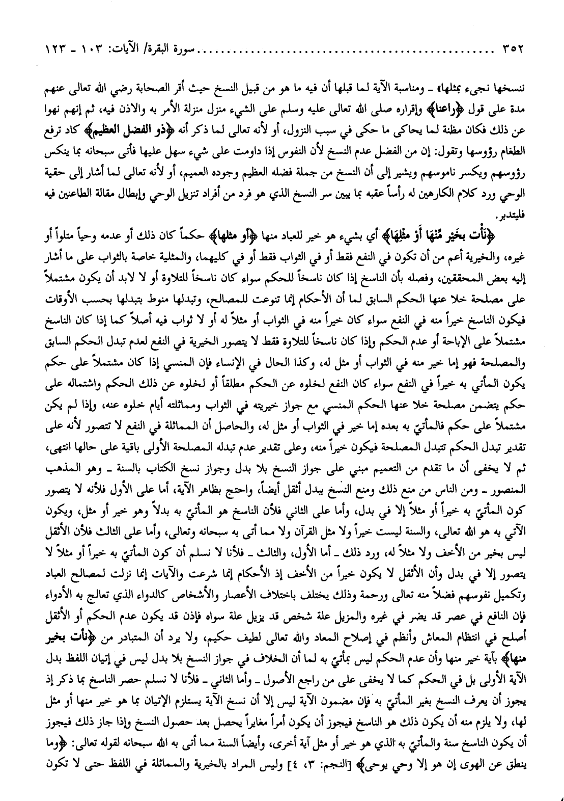 نَأْتِ بِخَيْرٍ مِنْها أَوْ مِثْلِها أي بشيء هو خير للعباد منها أَوْ مِثْلِها حكما كان ذلك أو عدمه وحيا متلوا أو غيره، والخيرية أعم من أن تكون في النفع فقط أو في الثواب فقط أو في كليهما، والمثلية خاصة بالثواب على ما أشار إليه بعض المحققين، وفصله بأن الناسخ إذا كان ناسخا للحكم سواء كان ناسخا للتلاوة أو لا لا بد أن يكون مشتملا على مصلحة خلا عنها الحكم السابق لما أن الأحكام إنما تنوعت للمصالح، وتبدلها منوط بتبدلها بحسب الأوقات فيكون الناسخ خيرا منه في النفع سواء كان خيرا منه في الثواب أو مثلا له أو لا ثواب فيه أصلا كما إذا كان الناسخ مشتملا على الإباحة أو عدم الحكم وإذا كان ناسخا للتلاوة فقط لا يتصور الخيرية في النفع لعدم تبدل الحكم السابق والمصلحة فهو إما خير منه في الثواب أو مثل له، وكذا الحال في الإنساء فإن المنسي إذا كان مشتملا على حكم يكون المأتي به خيرا في النفع سواء كان النفع لخلوه عن الحكم مطلقا أو لخلوه عن ذلك الحكم واشتماله على حكم يتضمن مصلحة خلا عنها الحكم المنسي مع جواز خيريته في الثواب ومماثلته أيام خلوه عنه، وإذا لم يكن مشتملا على حكم فالمأتيّ به بعده إما خير في الثواب أو مثل له، والحاصل أن المماثلة في النفع لا تتصور لأنه على تقدير تبدل الحكم تتبدل المصلحة فيكون خيرا منه، وعلى تقدير عدم تبدله المصلحة الأولى باقية على حالها انتهى، ثم لا يخفى أن ما تقدم من التعميم مبني على جواز النسخ بلا بدل وجواز نسخ الكتاب بالسنة- وهو المذهب المنصور- ومن الناس من منع ذلك ومنع النسخ ببدل أثقل أيضا، واحتج بظاهر الآية، أما على الأول فلأنه لا يتصور كون المأتيّ به خيرا أو مثلا إلا في بدل، وأما على الثاني فلأن الناسخ هو المأتيّ به بدلا وهو خير أو مثل، ويكون الآتي به هو الله تعالى، والسنة ليست خيرا ولا مثل القرآن ولا مما أتى به سبحانه وتعالى، وأما على الثالث فلأن الأثقل ليس بخير من الأخف ولا مثلا له، ورد ذلك- أما الأول، والثالث- فلأنا لا نسلم أن كون المأتيّ به خيرا أو مثلا لا يتصور إلا في بدل وأن الأثقل لا يكون خيرا من الأخف إذ الأحكام إنما شرعت والآيات إنما نزلت لمصالح العباد وتكميل نفوسهم فضلا منه تعالى ورحمة وذلك يختلف باختلاف الأعصار والأشخاص كالدواء الذي تعالج به الأدواء فإن النافع في عصر قد يضر في غيره والمزيل علة شخص قد يزيل علة سواه فإذن قد يكون عدم الحكم أو الأثقل أصلح في انتظام المعاش وأنظم في إصلاح المعاد والله تعالى لطيف حكيم، ولا يرد أن المتبادر من نَأْتِ بِخَيْرٍ مِنْها بآية خير منها وأن عدم الحكم ليس بمأتيّ به لما أن الخلاف في جواز النسخ بلا بدل ليس في إتيان اللفظ بدل الآية الأولى بل في الحكم كما لا يخفى على من راجع الأصول- وأما الثاني- فلأنا لا نسلم حصر الناسخ بما ذكر إذ يجوز أن يعرف النسخ بغير المأتيّ به فإن مضمون الآية ليس إلا أن نسخ الآية يستلزم الإتيان بما هو خير منها أو مثل لها، ولا يلزم منه أن يكون ذلك هو الناسخ فيجوز أن يكون أمرا مغايرا يحصل بعد حصول النسخ وإذا جاز ذلك فيجوز أن يكون الناسخ سنة والمأتيّ به الذي هو خير أو مثل آية أخرى، وأيضا السنة مما أتى به الله سبحانه لقوله تعالى: وَما يَنْطِقُ عَنِ الْهَوى إِنْ هُوَ إِلَّا وَحْيٌ يُوحى [النجم: 3، 4] وليس المراد بالخيرية والمماثلة في اللفظ حتى لا تكون