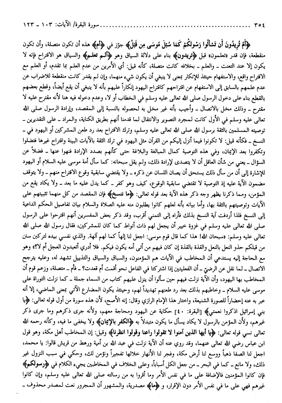 وهو مع الحاجة إليه يستدعي أن المخاطب في الآيات هم المؤمنون، والسباق والسياق والتذييل تشهد له، وعليه يترجح الاتصال- لما نقل عن الرضيّ- أن الفعليتين إذا اشتركتا في الفاعل نحو أقمت أم قعدت؟ - فأم- متصلة، وزعم قوم أن المخاطب بها اليهود، وأن الآية نزلت فيهم حين سألوا أن ينزل عليهم كتاب من السماء جملة- كما نزلت التوراة على موسى عليه السلام- وخاطبهم بذلك بعد رد طعنهم تهديدا لهم، وحينئذ يكون المضارع الآتي بمعنى الماضي، إلا أنه عبر به عنه إحضارا للصورة الشنيعة، واختار هذا الإمام الرازي وقال: إنه الأصح، لأن هذه سورة من أول قوله تعالى: يا بَنِي إِسْرائِيلَ اذْكُرُوا نِعْمَتِيَ [البقرة: 40] حكاية عن اليهود ومحاجة معهم، ولأنه جرى ذكرهم وما جرى ذكر غيرهم، ولأن المؤمن بالرسول لا يكاد يسأل ما يكون متبدلا به الْكُفْرَ بِالْإِيمانِ ولا يخفى ما فيه، وكأنه رحمه الله تعالى نسي قوله تعالى: يا أَيُّهَا الَّذِينَ آمَنُوا لا تَقُولُوا راعِنا وَقُولُوا انْظُرْنا وقيل: إن المخاطب أهل مكة، وهو قول ابن عباس رضي الله تعالى عنهما، وقد روي عنه أن الآية نزلت في عبد الله بن أمية ورهط من قريش قالوا: يا محمد، اجعل لنا الصفا ذهبا ووسع لنا أرض مكة، وفجر لنا الأنهار خلالها تفجيرا ونؤمن لك، وحكي في سبب النزول غير ذلك، ولا مانع- كما في البحر- من جعل الكل أسبابا، وعلى الخلاف في المخاطبين يجيء الكلام في رَسُولَكُمْ فإن كانوا المؤمنين فالإضافة على ما في نفس الأمر وما أقروا به من رسالته صلى الله تعالى عليه وسلم، وإن كانوا غيرهم فهي على ما في نفس الأمر دون الإقرار، وما مصدرية، والمشهور أن المجرور نعت لمصدر محذوف-