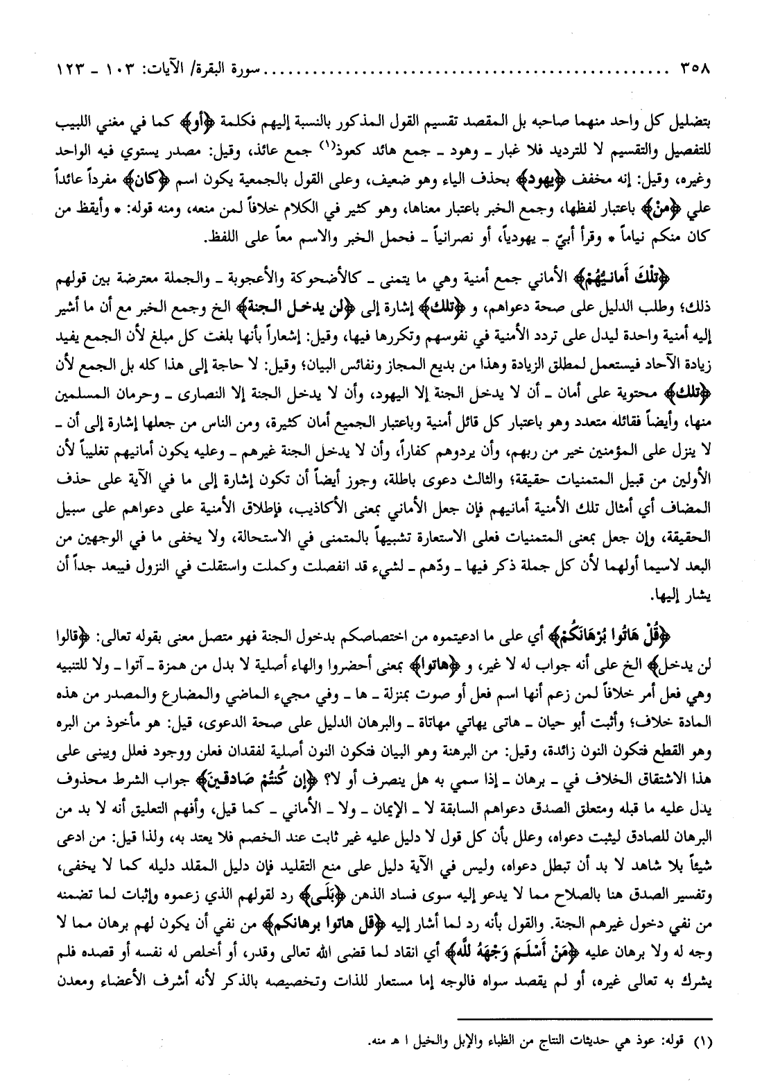 قُلْ هاتُوا بُرْهانَكُمْ أي على ما ادعيتموه من اختصاصكم بدخول الجنة فهو متصل معنى بقوله تعالى: قالُوا لَنْ يَدْخُلَ إلخ على أنه جواب له لا غير، وهاتُوا بمعنى أحضروا والهاء أصلية لا بدل من همزة- آتوا- ولا للتنبيه وهي فعل أمر خلافا لمن زعم أنها اسم فعل أو صوت بمنزلة- ها- وفي مجيء الماضي والمضارع والمصدر من هذه المادة خلاف وأثبت أبو حيان- هاتى يهاتي مهاتاة- والبرهان الدليل على صحة الدعوى، قيل: هو مأخوذ من البرة وهو القطع فتكون النون زائدة، وقيل: من البرهنة وهو البيان فتكون النون أصلية لفقدان فعلن ووجود فعلل ويبنى على هذا الاشتقاق الخلاف في- برهان- إذا سمي به هل ينصرف أو لا؟ إِنْ كُنْتُمْ صادِقِينَ جواب الشرط محذوف يدل عليه ما قبله ومتعلق الصدق دعواهم السابقة لا- الإيمان- ولا- الأماني- كما قيل، وأفهم التعليق أنه لا بد من البرهان للصادق ليثبت دعواه، وعلل بأن كل قول لا دليل عليه غير ثابت عند الخصم فلا يعتد به، ولذا قيل: من ادعى شيئا بلا شاهد لا بد أن تبطل دعواه، وليس في الآية دليل على منع التقليد فإن دليل المقلد دليله كما لا يخفى، وتفسير الصدق هنا بالصلاح مما لا يدعو إليه سوى فساد الذهن بَلى رد لقولهم الذي زعموه وإثبات لما تضمنه من نفي دخول غيرهم الجنة. والقول بأنه رد لما أشار إليه قُلْ هاتُوا بُرْهانَكُمْ من نفي أن يكون لهم برهان مما لا وجه له ولا برهان عليه مَنْ أَسْلَمَ وَجْهَهُ لِلَّهِ أي انقاد لما قضى الله تعالى وقدر، أو أخلص له نفسه أو قصده فلم يشرك به تعالى غيره، أو لم يقصد سواه فالوجه إما مستعار للذات وتخصيصه بالذكر لأنه أشرف الأعضاء ومعدن