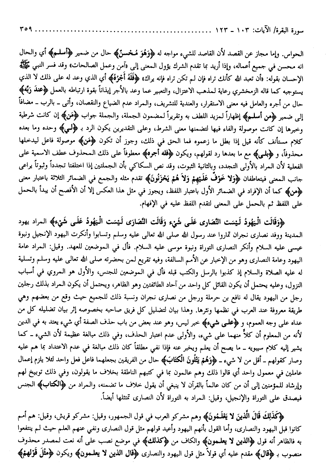 وَقالَتِ الْيَهُودُ لَيْسَتِ النَّصارى عَلى شَيْءٍ وَقالَتِ النَّصارى لَيْسَتِ الْيَهُودُ عَلى شَيْءٍ المراد يهود المدينة ووفد نصارى نجران تماروا عند رسول الله صلّى الله تعالى عليه وسلّم وتسابوا وأنكرت اليهود الإنجيل ونبوة عيسى عليه السلام وأنكر النصارى التوراة ونبوة موسى عليه السلام. فأل في الموضعين للعهد. وقيل: المراد عامة اليهود وعامة النصارى وهو من الإخبار عن الأمم السالفة، وفيه تقريع لمن بحضرته صلى الله تعالى عليه وسلم وتسلية له عليه الصلاة والسلام إذ كذبوا بالرسل والكتب قبله فأل في الموضعين للجنس، والأول هو المروي في أسباب النزول، وعليه يحتمل أن يكون القائل كل واحد من آحاد الطائفتين وهو الظاهر، ويحتمل أن يكون المراد بذلك رجلين رجل من اليهود يقال له نافع بن حرملة ورجل من نصارى نجران ونسبة ذلك للجميع حيث وقع من بعضهم وهي طريقة معروفة عند العرب في نظمها ونثرها. وهذا بيان لتضليل كل فريق صاحبه بخصوصه إثر بيان تضليله كل من عداه على وجه العموم، وعَلى شَيْءٍ خبر ليس، وهو عند بعض من باب حذف الصفة أي شيء يعتد به في الدين لأنه من المعلوم أن كلّا منهما على شيء، والأولى عدم اعتبار الحذف، وفي ذلك مبالغة عظيمة لأن الشيء- كما يشير إليه كلام سيبويه- ما يصح أن يعلم ويخبر عنه فإذا نفي مطلقا كان ذلك مبالغة في عدم الاعتداد بما هم عليه وصار كقولهم- أقل من لا شيء- وَهُمْ يَتْلُونَ الْكِتابَ حال من الفريقين بجعلهما فاعل فعل واحد لئلا يلزم إعمال عاملين في معمول واحد أي قالوا ذلك وهم عالمون بما في كتبهم الناطقة بخلاف ما يقولون، وفي ذلك توبيخ لهم وإرشاد للمؤمنين إلى أن من كان عالما بالقرآن لا ينبغي أن يقول خلاف ما تضمنه، والمراد من الْكِتابَ الجنس فيصدق على التوراة والإنجيل، وقيل: المراد به التوراة لأن النصارى تمتثلها أيضا.