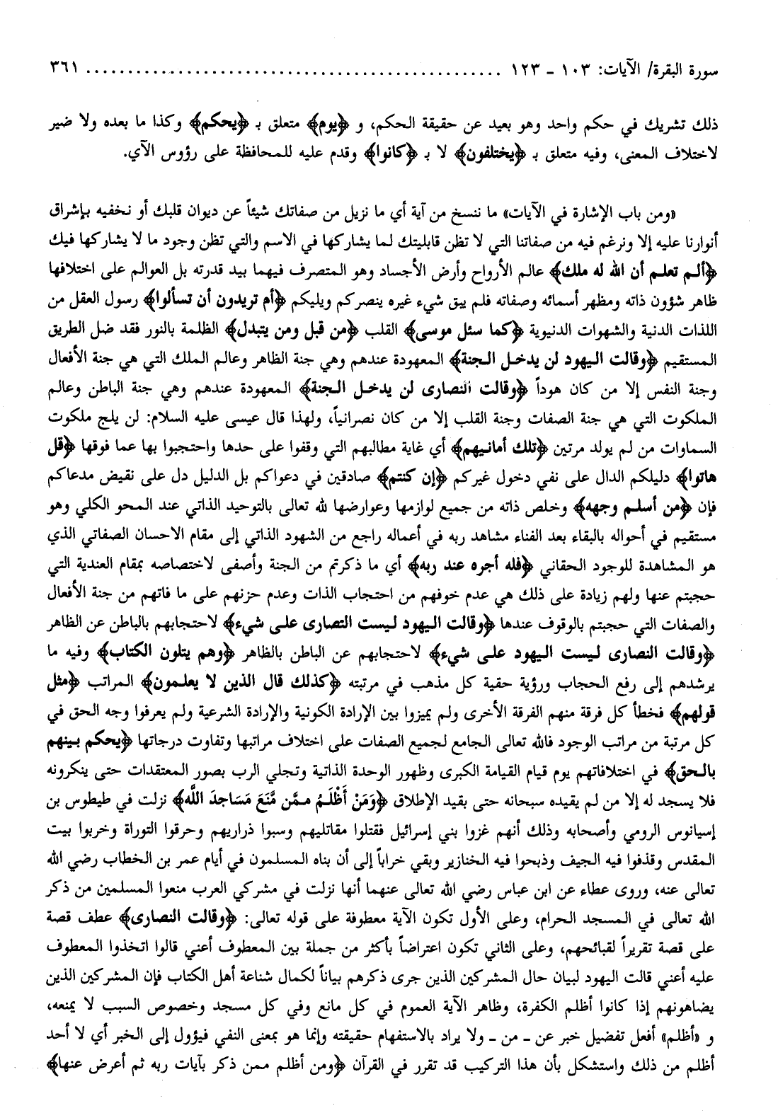 «ومن باب الإشارة في الآيات» ما ننسخ من آية أي ما نزيل من صفاتك شيئا عن ديوان قلبك أو نخفيه بإشراق أنوارنا عليه إلا ونرغم فيه من صفاتنا التي لا تظن قابليتك لما يشاركها في الاسم والتي تظن وجود ما لا يشاركها فيك أَلَمْ تَعْلَمْ أَنَّ اللَّهَ لَهُ مُلْكُ عالم الأرواح وأرض الأجساد وهو المتصرف فيهما بيد قدرته بل العوالم على اختلافها ظاهر شؤون ذاته ومظهر أسمائه وصفاته فلم يبق شيء غيره ينصركم ويليكم أَمْ تُرِيدُونَ أَنْ تَسْئَلُوا رسول العقل من اللذات الدنية والشهوات الدنيوية كَما سُئِلَ مُوسى القلب مِنْ قَبْلُ وَمَنْ يَتَبَدَّلِ الظلمة بالنور فقد ضل الطريق المستقيم وقالت اليهود لن يدخل الجنة المعهودة عندهم وهي جنة الظاهر وعالم الملك التي هي جنة الأفعال وجنة النفس إلا من كان هودا وقالت النصارى لن يدخل الجنة المعهودة عندهم وهي جنة الباطن وعالم الملكوت التي هي جنة الصفات وجنة القلب إلا من كان نصرانيا، ولهذا قال عيسى عليه السلام: لن يلج ملكوت السماوات من لم يولد مرتين تِلْكَ أَمانِيُّهُمْ أي غاية مطالبهم التي وقفوا على حدها واحتجبوا بها عما فوقها قُلْ هاتُوا دليلكم الدال على نفي دخول غيركم إِنْ كُنْتُمْ صادقين في دعواكم بل الدليل دل على نقيض مدعاكم فإن مَنْ أَسْلَمَ وَجْهَهُ وخلص ذاته من جميع لوازمها وعوارضها لله تعالى بالتوحيد الذاتي عند المحو الكلي وهو مستقيم في أحواله بالبقاء بعد الفناء مشاهد ربه في أعماله راجع من الشهود الذاتي إلى مقام الإحسان الصفاتي الذي هو المشاهدة للوجود الحقاني فَلَهُ أَجْرُهُ عِنْدَ رَبِّهِ أي ما ذكرتم من الجنة وأصفى لاختصاصه بمقام العندية التي حجبتم عنها ولهم زيادة على ذلك هي عدم خوفهم من احتجاب الذات وعدم حزنهم على ما فاتهم من جنة الأفعال والصفات التي حجبتم بالوقوف عندها وَقالَتِ الْيَهُودُ لَيْسَتِ النَّصارى عَلى شَيْءٍ لاحتجابهم بالباطن عن الظاهر وَقالَتِ النَّصارى لَيْسَتِ الْيَهُودُ عَلى شَيْءٍ لاحتجابهم عن الباطن بالظاهر وَهُمْ يَتْلُونَ الْكِتابَ وفيه ما يرشدهم إلى رفع الحجاب ورؤية حقية كل مذهب في مرتبته كَذلِكَ قالَ الَّذِينَ لا يَعْلَمُونَ المراتب مِثْلَ قَوْلِهِمْ فخطأ كل فرقة منهم الفرقة الأخرى ولم يميزوا بين الإرادة الكونية والإرادة الشرعية ولم يعرفوا وجه الحق في كل مرتبة من مراتب الوجود فالله تعالى الجامع لجميع الصفات على اختلاف مراتبها وتفاوت درجاتها يَحْكُمُ بَيْنَهُمْ بالحق في اختلافاتهم يوم قيام القيامة الكبرى وظهور الوحدة الذاتية وتجلي الرب بصور المعتقدات حتى ينكرونه فلا يسجد له إلا من لم يقيده سبحانه حتى بقيد الإطلاق وَمَنْ أَظْلَمُ مِمَّنْ مَنَعَ مَساجِدَ اللَّهِ نزلت في طيطوس بن إسيانوس الرومي وأصحابه وذلك أنهم غزوا بني إسرائيل فقتلوا مقاتليهم وسبوا ذراريهم وحرقوا التوراة وخربوا بيت المقدس وقذفوا فيه الجيف وذبحوا فيه الخنازير وبقي خرابا إلى أن بناه المسلمون في أيام عمر بن الخطاب رضي الله تعالى عنه، وروى عطاء عن ابن عباس رضي الله تعالى عنهما أنها نزلت في مشركي العرب منعوا المسلمين من ذكر الله تعالى في المسجد الحرام، وعلى الأول تكون الآية معطوفة على قوله تعالى: وَقالَتِ النَّصارى عطف قصة على قصة تقريرا لقبائحهم، وعلى الثاني تكون اعتراضا بأكثر من جملة بين المعطوف أعني قالوا اتخذوا المعطوف عليه أعني قالت اليهود لبيان حال المشركين الذين جرى ذكرهم بيانا لكمال شناعة أهل الكتاب فإن المشركين الذين يضاهونهم إذا كانوا أظلم الكفرة، وظاهر الآية العموم في كل مانع وفي كل مسجد وخصوص السبب لا يمنعه، و «أظلم» أفعل تفضيل خبر عن- من- ولا يراد بالاستفهام حقيقته وإنما هو بمعنى النفي فيؤول إلى الخبر أي لا أحد أظلم من ذلك واستشكل بأن هذا التركيب قد تقرر في القرآن وَمَنْ أَظْلَمُ مِمَّنْ ذُكِّرَ بِآياتِ رَبِّهِ ثُمَّ أَعْرَضَ عَنْها
