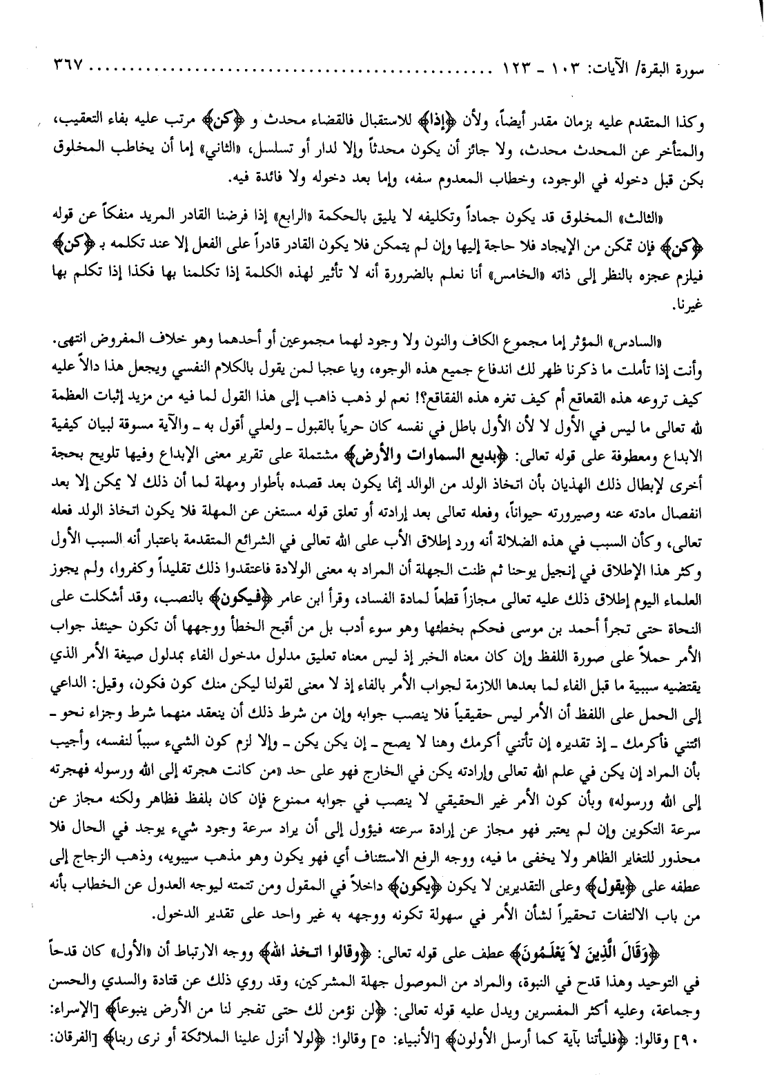 «الثالث» المخلوق قد يكون جمادا وتكليفه لا يليق بالحكمة «الرابع» إذا فرضنا القادر المريد منفكا عن قوله كُنْ فإن تمكن من الإيجاد فلا حاجة إليها وإن لم يتمكن فلا يكون القادر قادرا على الفعل إلا عند تكلمه ب كُنْ فيلزم عجزه بالنظر إلى ذاته «الخامس» أنا نعلم بالضرورة أنه لا تأثير لهذه الكلمة إذا تكلمنا بها فكذا إذا تكلم بها غيرنا.