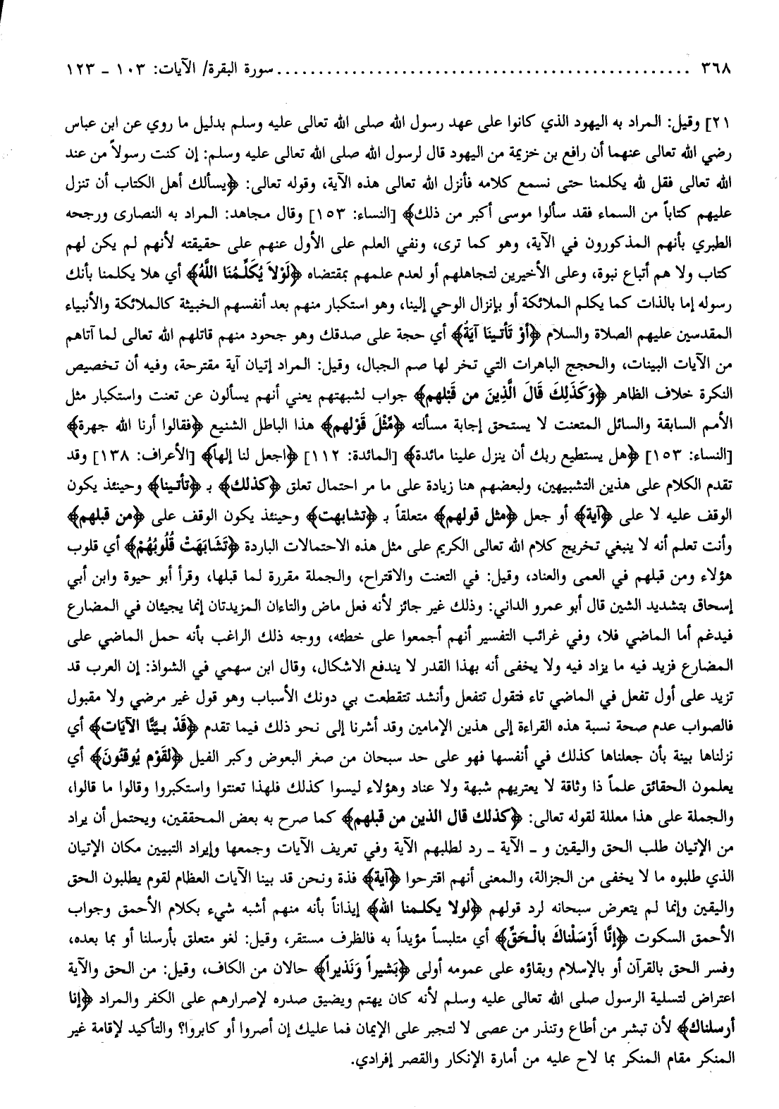 وقوله تعالى: يَسْئَلُكَ أَهْلُ الْكِتابِ أَنْ تُنَزِّلَ عَلَيْهِمْ كِتاباً مِنَ السَّماءِ فَقَدْ سَأَلُوا مُوسى أَكْبَرَ مِنْ ذلِكَ [النساء: 153] وقال مجاهد: المراد به النصارى ورجحه الطبري بأنهم المذكورون في الآية، وهو كما ترى، ونفي العلم على الأول عنهم على حقيقته لأنهم لم يكن لهم كتاب ولا هم أتباع نبوة، وعلى الأخيرين لتجاهلهم أو لعدم علمهم بمقتضاه لَوْلا يُكَلِّمُنَا اللَّهُ أي هلا يكلمنا بأنك رسوله إما بالذات كما يكلم الملائكة أو بإنزال الوحي إلينا، وهو استكبار منهم بعد أنفسهم الخبيثة كالملائكة والأنبياء المقدسين عليهم الصلاة والسلام أَوْ تَأْتِينا آيَةٌ أي حجة على صدقك وهو جحود منهم قاتلهم الله تعالى لما آتاهم من الآيات البينات، والحجج الباهرات التي تخر لها صم الجبال، وقيل: المراد إتيان آية مقترحة، وفيه أن تخصيص النكرة خلاف الظاهر كَذلِكَ قالَ الَّذِينَ مِنْ قَبْلِهِمْ جواب لشبهتهم يعني أنهم يسألون عن تعنت واستكبار مثل الأمم السابقة والسائل المتعنت لا يستحق إجابة مسألته مِثْلَ قَوْلِهِمْ هذا الباطل الشنيع فَقالُوا أَرِنَا اللَّهَ جَهْرَةً [النساء: 153] هَلْ يَسْتَطِيعُ رَبُّكَ أَنْ يُنَزِّلَ عَلَيْنا مائِدَةً [المائدة: 112] اجْعَلْ لَنا إِلهاً [الأعراف: 138] وقد تقدم الكلام على هذين التشبيهين، ولبعضهم هنا زيادة على ما مر احتمال تعلق كَذلِكَ ب تَأْتِينا وحينئذ يكون الوقف عليه لا على آيَةٌ أو جعل مِثْلَ قَوْلِهِمْ متعلقا ب تَشابَهَتْ وحينئذ يكون الوقف على مِنْ قَبْلِهِمْ وأنت تعلم أنه لا ينبغي تخريج كلام الله تعالى الكريم على مثل هذه الاحتمالات الباردة تَشابَهَتْ قُلُوبُهُمْ أي قلوب هؤلاء ومن قبلهم في العمى والعناد، وقيل: في التعنت والاقتراح، والجملة مقررة لما قبلها، وقرأ أبو حيوة وابن أبي إسحاق بتشديد الشين قال أبو عمرو الداني: وذلك غير جائز لأنه فعل ماض والتاءان المزيدتان إنما يجيئان في المضارع فيدغم أما الماضي فلا، وفي غرائب التفسير أنهم أجمعوا على خطئه، ووجه ذلك الراغب بأنه حمل الماضي على المضارع فزيد فيه ما يزاد فيه ولا يخفى أنه بهذا القدر لا يندفع الاشكال، وقال ابن سهمي في الشواذ: إن العرب قد تزيد على أول تفعل في الماضي تاء فتقول تتفعل وأنشد تتقطعت بي دونك الأسباب وهو قول غير مرضي ولا مقبول فالصواب عدم صحة نسبة هذه القراءة إلى هذين الإمامين وقد أشرنا إلى نحو ذلك فيما تقدم قَدْ بَيَّنَّا الْآياتِ أي نزلناها بينة بأن جعلناها كذلك في أنفسها فهو على حد سبحان من صغر البعوض وكبر الفيل لِقَوْمٍ يُوقِنُونَ أي يعلمون الحقائق علما ذا وثاقة لا يعتريهم شبهة ولا عناد وهؤلاء ليسوا كذلك فلهذا تعنتوا واستكبروا وقالوا ما قالوا، والجملة على هذا معللة لقوله تعالى: كَذلِكَ قالَ الَّذِينَ مِنْ قَبْلِهِمْ كما صرح به بعض المحققين، ويحتمل أن يراد من الإتيان طلب الحق واليقين والآية- رد لطلبهم الآية وفي تعريف الآيات وجمعها وإيراد التبيين مكان الإتيان الذي طلبوه ما لا يخفى من الجزالة، والمعنى أنهم اقترحوا آيَةٌ فذة ونحن قد بينا الآيات العظام لقوم يطلبون الحق واليقين وإنما لم يتعرض سبحانه لرد قولهم لَوْلا يُكَلِّمُنَا اللَّهُ إيذانا بأنه منهم أشبه شيء بكلام الأحمق وجواب الأحمق السكوت إِنَّا أَرْسَلْناكَ بِالْحَقِّ أي متلبسا مؤيدا به فالظرف مستقر، وقيل: لغو متعلق بأرسلنا أو بما بعده، وفسر الحق بالقرآن أو بالإسلام وبقاؤه على عمومه أولى بَشِيراً وَنَذِيراً حالان من الكاف، وقيل: من الحق والآية اعتراض لتسلية الرسول صلى الله تعالى عليه وسلم لأنه كان يهتم ويضيق صدره لإصرارهم على الكفر والمراد إِنَّا أَرْسَلْناكَ لأن تبشر من أطاع وتنذر من عصى لا لتجبر على الإيمان فما عليك إن أصروا أو كابروا؟ والتأكيد لإقامة غير المنكر مقام المنكر بما لاح عليه من أمارة الإنكار والقصر إفرادي.