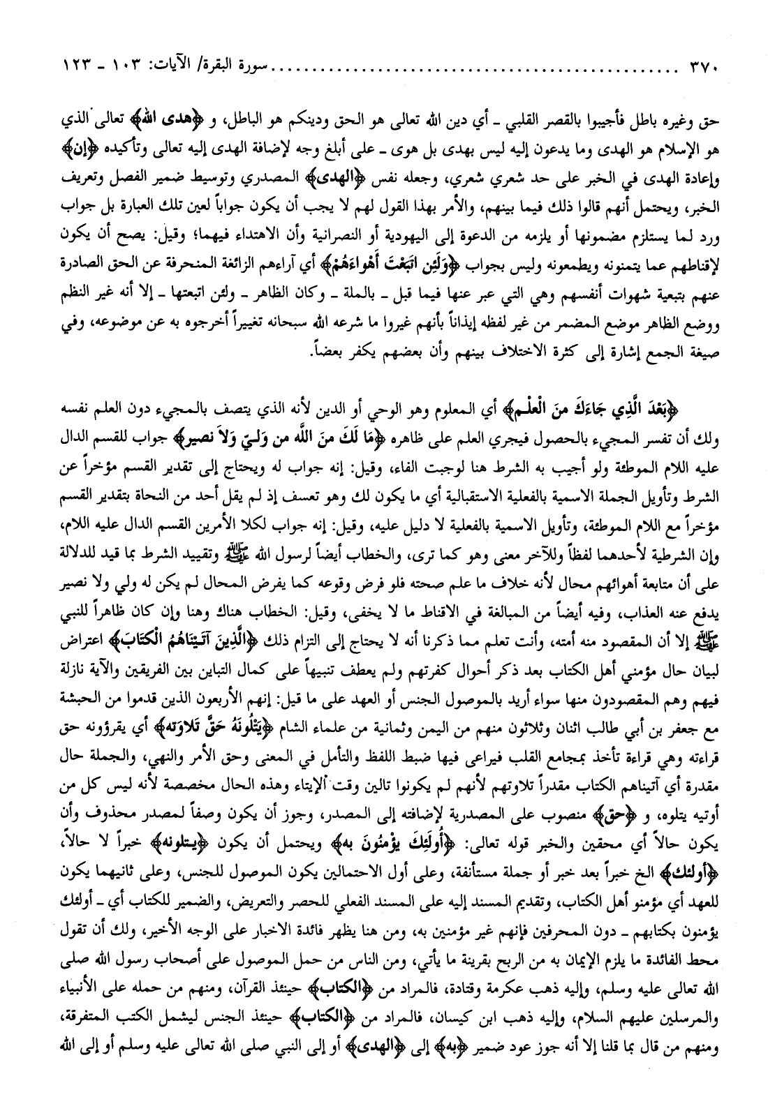 بَعْدَ الَّذِي جاءَكَ مِنَ الْعِلْمِ أي المعلوم وهو الوحي أو الدين لأنه الذي يتصف بالمجيء دون العلم نفسه ولك أن تفسر المجيء بالحصول فيجري العلم على ظاهره ما لَكَ مِنَ اللَّهِ مِنْ وَلِيٍّ وَلا نَصِيرٍ جواب للقسم الدال عليه اللام الموطئة ولو أجيب به الشرط هنا لوجبت الفاء، وقيل: إنه جواب له ويحتاج إلى تقدير القسم مؤخرا عن الشرط وتأويل الجملة الاسمية بالفعلية الاستقبالية أي ما يكون لك وهو تعسف إذ لم يقل أحد من النحاة بتقدير القسم مؤخرا مع اللام الموطئة، وتأويل الاسمية بالفعلية لا دليل عليه، وقيل: إنه جواب لكلا الأمرين القسم الدال عليه اللام، وإن الشرطية لأحدهما لفظا وللآخر معنى وهو كما ترى، والخطاب أيضا لرسول الله صلّى الله عليه وسلّم وتقييد الشرط بما قيد للدلالة على أن متابعة أهوائهم محال لأنه خلاف ما علم صحته فلو فرض وقوعه كما يفرض المحال لم يكن له ولي ولا نصير يدفع عنه العذاب، وفيه أيضا من المبالغة في الاقناط ما لا يخفى، وقيل: الخطاب هناك وهنا وإن كان ظاهرا للنبي صلّى الله عليه وسلّم إلا أن المقصود منه أمته، وأنت تعلم مما ذكرنا أنه لا يحتاج إلى التزام ذلك الَّذِينَ آتَيْناهُمُ الْكِتابَ اعتراض لبيان حال مؤمني أهل الكتاب بعد ذكر أحوال كفرتهم ولم يعطف تنبيها على كمال التباين بين الفريقين والآية نازلة فيهم وهم المقصودون منها سواء أريد بالموصول الجنس أو العهد على ما قيل: إنهم الأربعون الذين قدموا من الحبشة مع جعفر بن أبي طالب اثنان وثلاثون منهم من اليمن وثمانية من علماء الشام يَتْلُونَهُ حَقَّ تِلاوَتِهِ أي يقرؤونه حق قراءته وهي قراءة تأخذ بمجامع القلب فيراعى فيها ضبط اللفظ والتأمل في المعنى وحق الأمر والنهي، والجملة حال مقدرة أي آتيناهم الكتاب مقدرا تلاوتهم لأنهم لم يكونوا تالين وقت الإيتاء وهذه الحال مخصصة لأنه ليس كل من أوتيه يتلوه، وحَقَّ منصوب على المصدرية لإضافته إلى المصدر، وجوز أن يكون وصفا لمصدر محذوف وأن يكون حالا أي محقين والخبر قوله تعالى: أُولئِكَ يُؤْمِنُونَ بِهِ ويحتمل أن يكون يَتْلُونَهُ خبرا لا حالا، أُولئِكَ إلخ خبرا بعد خبر أو جملة مستأنفة، وعلى أول الاحتمالين يكون الموصول للجنس، وعلى ثانيهما يكون للعهد أي مؤمنو أهل الكتاب، وتقديم المسند إليه على المسند الفعلي للحصر والتعريض، والضمير للكتاب أي- أولئك يؤمنون بكتابهم- دون المحرفين فإنهم غير مؤمنين به، ومن هنا يظهر فائدة الاخبار على الوجه الأخير، ولك أن تقول محط الفائدة ما يلزم الإيمان به من الربح بقرينة ما يأتي، ومن الناس من حمل الموصول على أصحاب رسول الله صلى الله تعالى عليه وسلم، وإليه ذهب عكرمة وقتادة، فالمراد من الْكِتابَ حينئذ القرآن، ومنهم من حمله على الأنبياء والمرسلين عليهم السلام، وإليه ذهب ابن كيسان، فالمراد من الْكِتابَ حينئذ الجنس ليشمل الكتب المتفرقة، ومنهم من قال بما قلنا إلا أنه جوز عود ضمير بِهِ إلى الْهُدى أو إلى النبي صلى الله تعالى عليه وسلم أو إلى الله