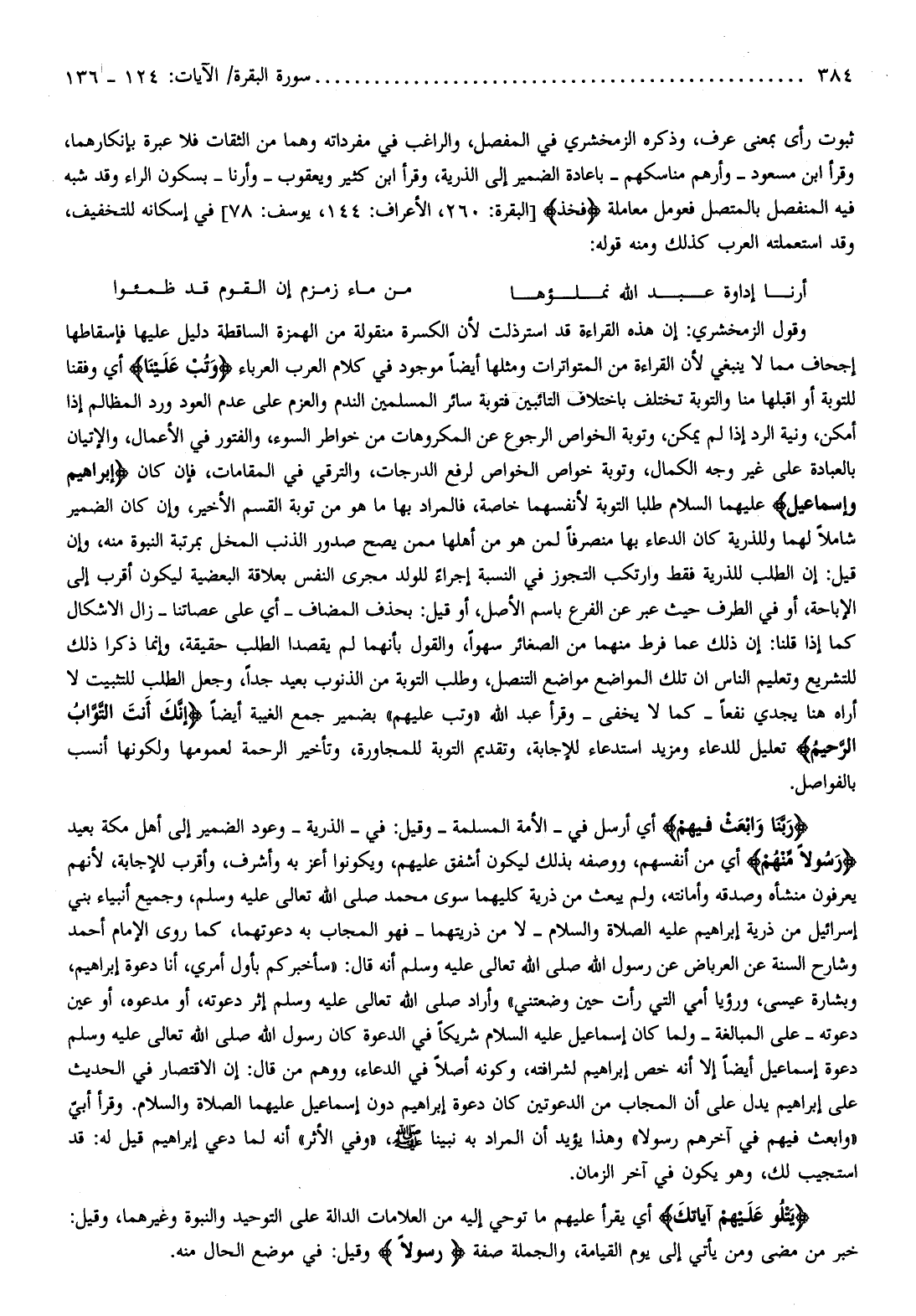 وقول الزمخشري: إن هذه القراءة قد استرذلت لأن الكسرة منقولة من الهمزة الساقطة دليل عليها فإسقاطها إجحاف مما لا ينبغي لأن القراءة من المتواترات ومثلها أيضا موجود في كلام العرب العرباء وَتُبْ عَلَيْنا أي وفقنا للتوبة أو اقبلها منا والتوبة تختلف باختلاف التائبين فتوبة سائر المسلمين الندم والعزم على عدم العود ورد المظالم إذا أمكن، ونية الرد إذا لم يمكن، وتوبة الخواص الرجوع عن المكروهات من خواطر السوء، والفتور في الأعمال، والإتيان بالعبادة على غير وجه الكمال، وتوبة خواص الخواص لرفع الدرجات، والترقي في المقامات، فإن كان إبراهيم وإسماعيل عليهما السلام طلبا التوبة لأنفسهما خاصة، فالمراد بها ما هو من توبة القسم الأخير، وإن كان الضمير شاملا لهما وللذرية كان الدعاء بها منصرفا لمن هو من أهلها ممن يصح صدور الذنب المخل بمرتبة النبوة منه، وإن قيل: إن الطلب للذرية فقط وارتكب التجوز في النسبة إجراء للولد مجرى النفس بعلاقة البعضية ليكون أقرب إلى الإباحة، أو في الطرف حيث عبر عن الفرع باسم الأصل، أو قيل: بحذف المضاف- أي على عصاتنا- زال الاشكال كما إذا قلنا: إن ذلك عما فرط منهما من الصغائر سهوا، والقول بأنهما لم يقصدا الطلب حقيقة، وإنما ذكرا ذلك للتشريع وتعليم الناس ان تلك المواضع مواضع التنصل، وطلب التوبة من الذنوب بعيد جدا، وجعل الطلب للتثبيت لا أراه هنا يجدي نفعا- كما لا يخفى- وقرأ عبد الله «وتب عليهم» بضمير جمع الغيبة أيضا إِنَّكَ أَنْتَ التَّوَّابُ الرَّحِيمُ تعليل للدعاء ومزيد استدعاء للإجابة، وتقديم التوبة للمجاورة، وتأخير الرحمة لعمومها ولكونها أنسب بالفواصل.