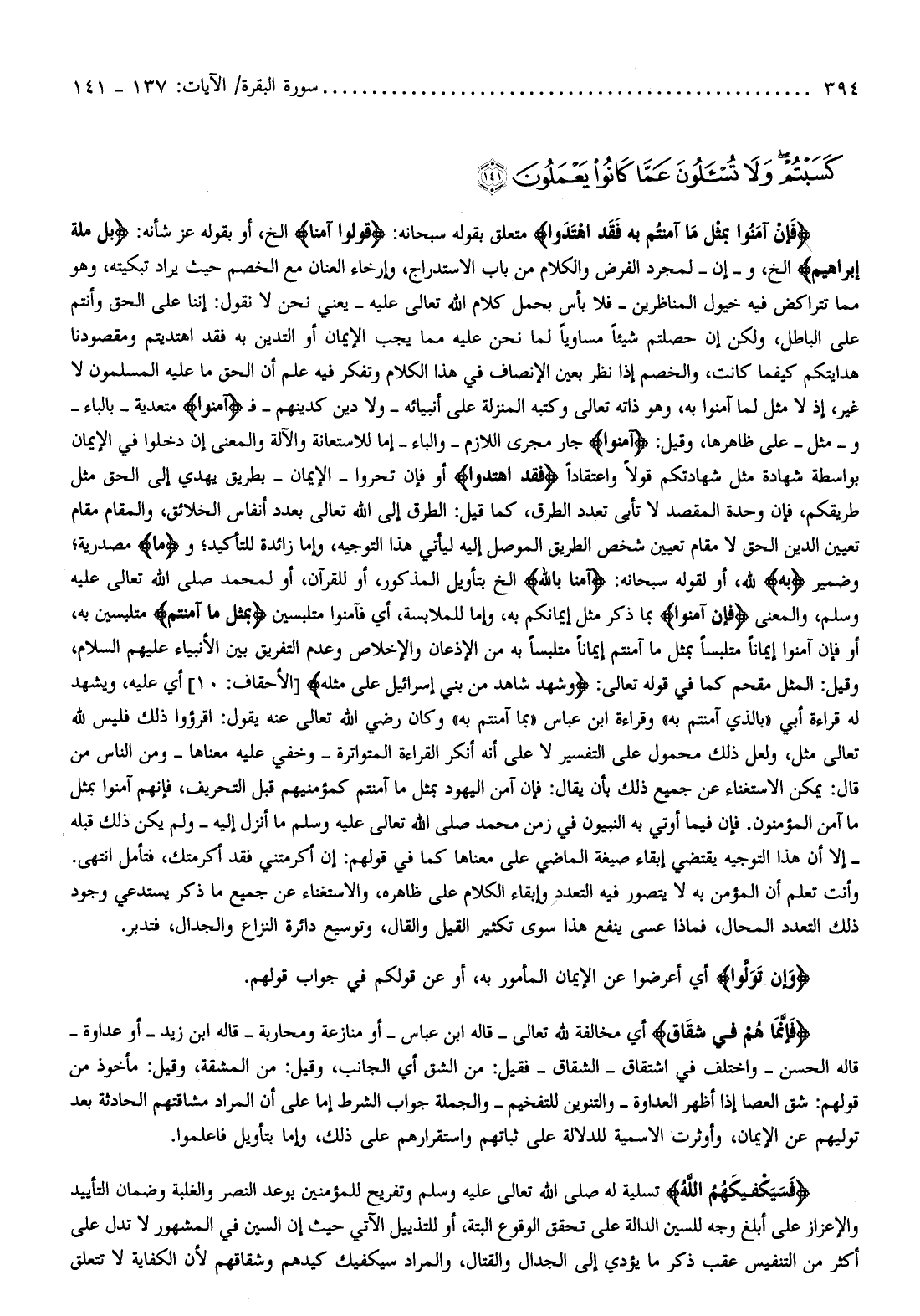 فَإِنْ آمَنُوا بِمِثْلِ ما آمَنْتُمْ بِهِ فَقَدِ اهْتَدَوْا متعلق بقوله سبحانه: قُولُوا آمَنَّا إلخ، أو بقوله عز شأنه: بَلْ مِلَّةَ إِبْراهِيمَ إلخ، وإن- لمجرد الفرض والكلام من باب الاستدراج، وإرخاء العنان مع الخصم حيث يراد تبكيته، وهو مما تتراكض فيه خيول المناظرين- فلا بأس بحمل كلام الله تعالى عليه- يعني نحن لا نقول: إننا على الحق وأنتم على الباطل، ولكن إن حصلتم شيئا مساويا لما نحن عليه مما يجب الإيمان أو التدين به فقد اهتديتم ومقصودنا هدايتكم كيفما كانت، والخصم إذا نظر بعين الإنصاف في هذا الكلام وتفكر فيه علم أن الحق ما عليه المسلمون لا غير، إذ لا مثل لما آمنوا به، وهو ذاته تعالى وكتبه المنزلة على أنبيائه- ولا دين كدينهم- ف آمَنُوا متعدية- بالباء- ومثل- على ظاهرها، وقيل: آمَنُوا جار مجرى اللازم- والباء- إما للاستعانة والآلة والمعنى إن دخلوا في الإيمان بواسطة شهادة مثل شهادتكم قولا واعتقادا فَقَدِ اهْتَدَوْا أو فإن تحروا- الإيمان- بطريق يهدي إلى الحق مثل طريقكم، فإن وحدة المقصد لا تأبى تعدد الطرق، كما قيل: الطرق إلى الله تعالى بعدد أنفاس الخلائق، والمقام مقام تعيين الدين الحق لا مقام تعيين شخص الطريق الموصل إليه ليأتي هذا التوجيه، وإما زائدة للتأكيد وما مصدرية وضمير بِهِ لله، أو لقوله سبحانه: آمَنَّا بِاللَّهِ إلخ بتأويل المذكور، أو للقرآن، أو لمحمد صلى الله تعالى عليه وسلم، والمعنى فَإِنْ آمَنُوا بما ذكر مثل إيمانكم به، وإما للملابسة، أي فآمنوا متلبسين بِمِثْلِ ما آمَنْتُمْ متلبسين به، أو فإن آمنوا إيمانا متلبسا بمثل ما آمنتم إيمانا متلبسا به من الإذعان والإخلاص وعدم التفريق بين الأنبياء عليهم السلام، وقيل: المثل مقحم كما في قوله تعالى: وَشَهِدَ شاهِدٌ مِنْ بَنِي إِسْرائِيلَ عَلى مِثْلِهِ [الأحقاف: 10] أي عليه، ويشهد له قراءة أبي «بالذي آمنتم به» وقراءة ابن عباس «بما آمنتم به» وكان رضي الله تعالى عنه يقول: اقرؤوا ذلك فليس لله تعالى مثل، ولعل ذلك محمول على التفسير لا على أنه أنكر القراءة المتواترة- وخفي عليه معناها- ومن الناس من قال: يمكن الاستغناء عن جميع ذلك بأن يقال: فإن آمن اليهود بمثل ما آمنتم كمؤمنيهم قبل التحريف، فإنهم آمنوا بمثل ما آمن المؤمنون. فإن فيما أوتي به النبيون في زمن محمد صلى الله تعالى عليه وسلم ما أنزل إليه- ولم يكن ذلك قبله- إلا أن هذا التوجيه يقتضي إبقاء صيغة الماضي على معناها كما في قولهم: إن أكرمتني فقد أكرمتك، فتأمل انتهى.