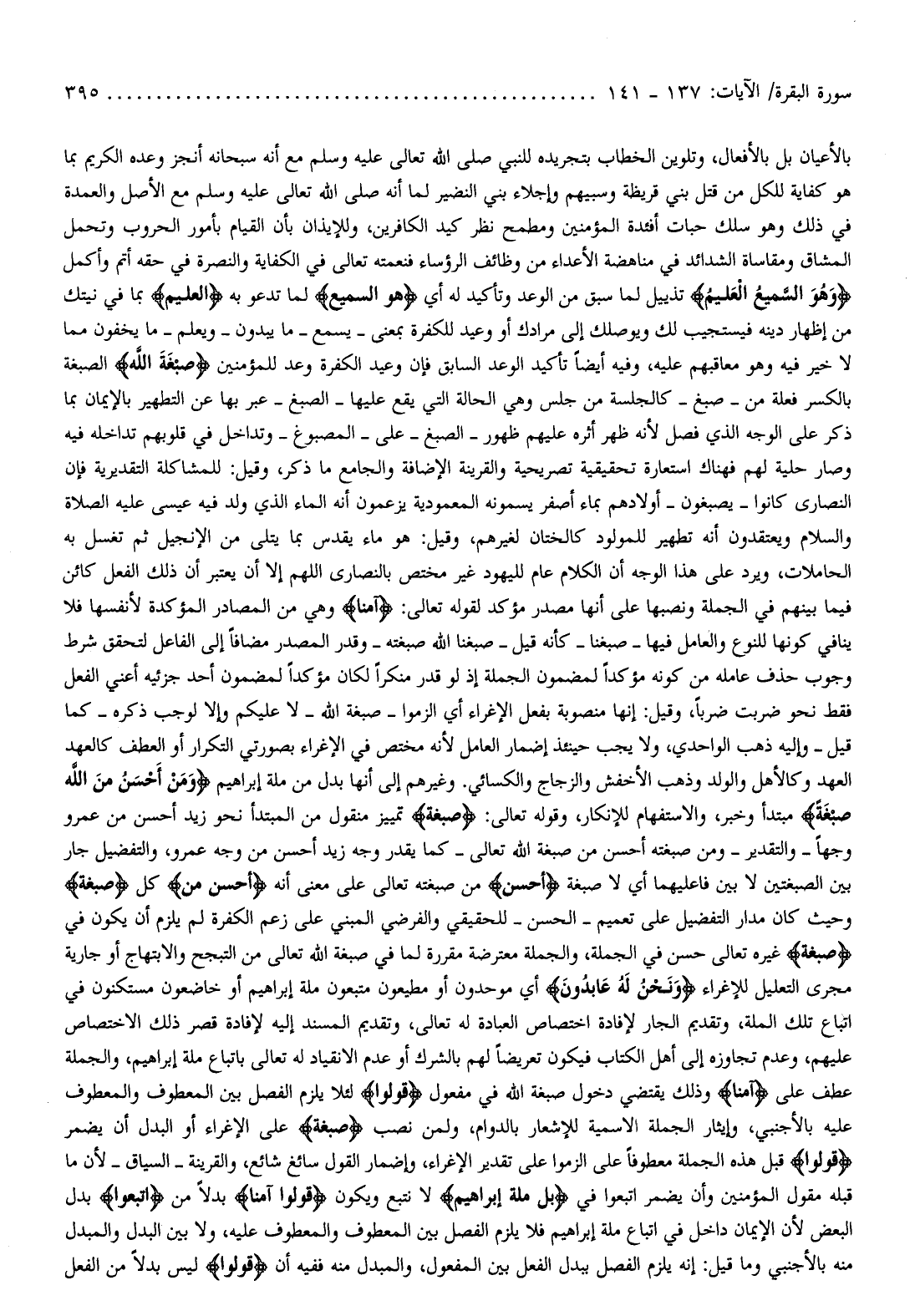 بالأعيان بل بالأفعال، وتلوين الخطاب بتجريده للنبي صلى الله تعالى عليه وسلم مع أنه سبحانه أنجز وعده الكريم بما هو كفاية للكل من قتل بني قريظة وسبيهم وإجلاء بني النضير لما أنه صلى الله تعالى عليه وسلم مع الأصل والعمدة في ذلك وهو سلك حبات أفئدة المؤمنين ومطمح نظر كيد الكافرين، وللإيذان بأن القيام بأمور الحروب وتحمل المشاق ومقاساة الشدائد في مناهضة الأعداء من وظائف الرؤساء فنعمته تعالى في الكفاية والنصرة في حقه أتم وأكمل وَهُوَ السَّمِيعُ الْعَلِيمُ تذييل لما سبق من الوعد وتأكيد له أي هُوَ السَّمِيعُ لما تدعو به الْعَلِيمُ بما في نيتك من إظهار دينه فيستجيب لك ويوصلك إلى مرادك أو وعيد للكفرة بمعنى- يسمع- ما يبدون- ويعلم- ما يخفون مما لا خير فيه وهو معاقبهم عليه، وفيه أيضا تأكيد الوعد السابق فإن وعيد الكفرة وعد للمؤمنين صِبْغَةَ اللَّهِ الصبغة بالكسر فعلة من- صبغ- كالجلسة من جلس وهي الحالة التي يقع عليها- الصبغ- عبر بها عن التطهير بالإيمان بما ذكر على الوجه الذي فصل لأنه ظهر أثره عليهم ظهور- الصبغ- على- المصبوغ- وتداخل في قلوبهم تداخله فيه وصار حلية لهم فهناك استعارة تحقيقية تصريحية والقرينة الإضافة والجامع ما ذكر، وقيل: للمشاكلة التقديرية فإن النصارى كانوا- يصبغون- أولادهم بماء أصفر يسمونه المعمودية يزعمون أنه الماء الذي ولد فيه عيسى عليه الصلاة والسلام ويعتقدون أنه تطهير للمولود كالختان لغيرهم، وقيل: هو ماء يقدس بما يتلى من الإنجيل ثم تغسل به الحاملات، ويرد على هذا الوجه أن الكلام عام لليهود غير مختص بالنصارى اللهم إلا أن يعتبر أن ذلك الفعل كائن فيما بينهم في الجملة ونصبها على أنها مصدر مؤكد لقوله تعالى: آمَنَّا وهي من المصادر المؤكدة لأنفسها فلا ينافي كونها للنوع والعامل فيها- صبغنا- كأنه قيل- صبغنا الله صبغته- وقدر المصدر مضافا إلى الفاعل لتحقق شرط وجوب حذف عامله من كونه مؤكدا لمضمون الجملة إذ لو قدر منكرا لكان مؤكدا لمضمون أحد جزئيه أعني الفعل فقط نحو ضربت ضربا، وقيل: إنها منصوبة بفعل الإغراء أي الزموا- صبغة الله- لا عليكم وإلا لوجب ذكره- كما قيل- وإليه ذهب الواحدي، ولا يجب حينئذ إضمار العامل لأنه مختص في الإغراء بصورتي التكرار أو العطف كالعهد العهد وكالأهل والولد وذهب الأخفش والزجاج والكسائي. وغيرهم إلى أنها بدل من ملة إبراهيم وَمَنْ أَحْسَنُ مِنَ اللَّهِ صِبْغَةً مبتدأ وخبر، والاستفهام للإنكار، وقوله تعالى: صِبْغَةَ تمييز منقول من المبتدأ نحو زيد أحسن من عمرو وجها- والتقدير- ومن صبغته أحسن من صبغة الله تعالى- كما يقدر وجه زيد أحسن من وجه عمرو، والتفضيل جار بين الصبغتين لا بين فاعليهما أي لا صبغة أَحْسَنُ من صبغته تعالى على معنى أنه أَحْسَنُ مِنَ كل صِبْغَةَ وحيث كان مدار التفضيل على تعميم- الحسن- للحقيقي والفرضي المبني على زعم الكفرة لم يلزم أن يكون في صِبْغَةَ غيره تعالى حسن في الجملة، والجملة معترضة مقررة لما في صبغة الله تعالى من التبجح والابتهاج أو جارية مجرى التعليل للإغراء وَنَحْنُ لَهُ عابِدُونَ أي موحدون أو مطيعون متبعون ملة إبراهيم أو خاضعون مستكنون في اتباع تلك الملة، وتقديم الجار لإفادة اختصاص العبادة له تعالى، وتقديم المسند إليه لإفادة قصر ذلك الاختصاص عليهم، وعدم تجاوزه إلى أهل الكتاب فيكون تعريضا لهم بالشرك أو عدم الانقياد له تعالى باتباع ملة إبراهيم، والجملة عطف على آمَنَّا وذلك يقتضي دخول صبغة الله في مفعول قُولُوا لئلا يلزم الفصل بين المعطوف والمعطوف عليه بالأجنبي، وإيثار الجملة الاسمية للإشعار بالدوام، ولمن نصب صِبْغَةَ على الإغراء أو البدل أن يضمر قُولُوا قبل هذه الجملة معطوفا على الزموا على تقدير الإغراء، وإضمار القول سائغ شائع، والقرينة- السياق- لأن ما قبله مقول المؤمنين وأن يضمر اتبعوا في بَلْ مِلَّةَ إِبْراهِيمَ لا نتبع ويكون قُولُوا آمَنَّا بدلا من اتبعوا بدل البعض لأن الإيمان داخل