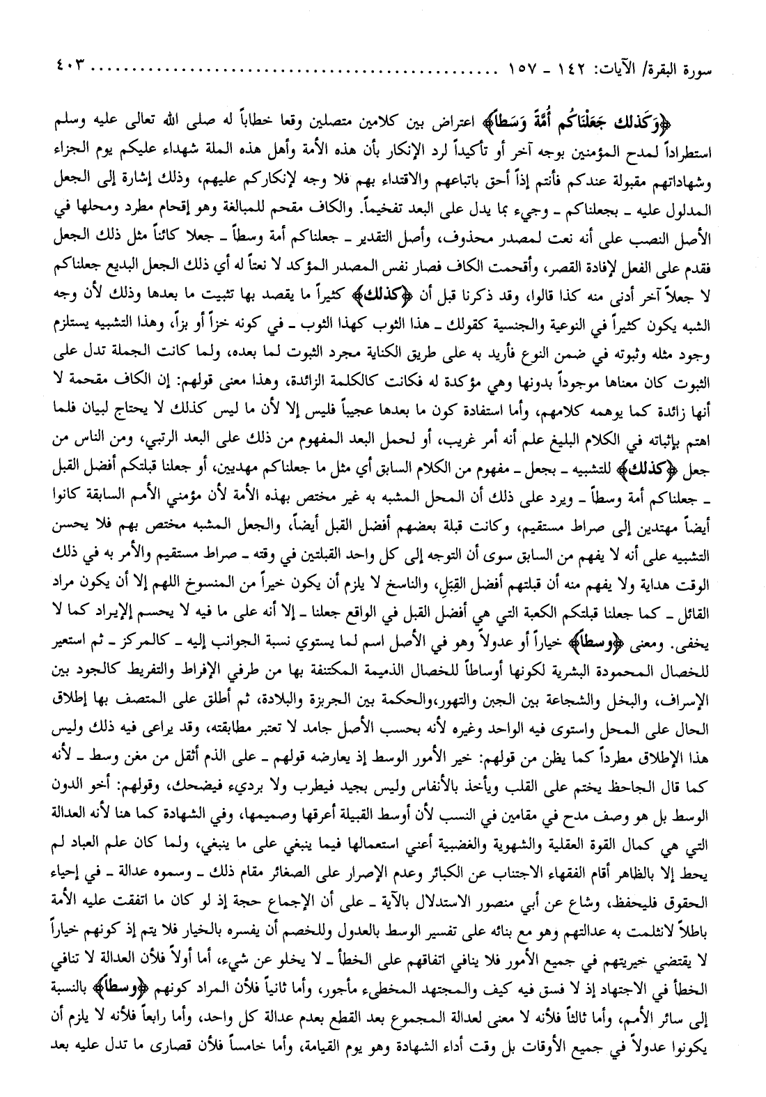وَكَذلِكَ جَعَلْناكُمْ أُمَّةً وَسَطاً اعتراض بين كلامين متصلين وقعا خطابا له صلى الله تعالى عليه وسلم استطرادا لمدح المؤمنين بوجه آخر أو تأكيدا لرد الإنكار بأن هذه الأمة وأهل هذه الملة شهداء عليكم يوم الجزاء وشهاداتهم مقبولة عندكم فأنتم إذا أحق باتباعهم والاقتداء بهم فلا وجه لإنكاركم عليهم، وذلك إشارة إلى الجعل المدلول عليه- بجعلناكم- وجيء بما يدل على البعد تفخيما. والكاف مقحم للمبالغة وهو إقحام مطرد ومحلها في الأصل النصب على أنه نعت لمصدر محذوف، وأصل التقدير- جعلناكم أمة وسطا- جعلا كائنا مثل ذلك الجعل فقدم على الفعل لإفادة القصر، وأقحمت الكاف فصار نفس المصدر المؤكد لا نعتا له أي ذلك الجعل البديع جعلناكم لا جعلا آخر أدنى منه كذا قالوا، وقد ذكرنا قبل أن كَذلِكَ كثيرا ما يقصد بها تثبيت ما بعدها وذلك لأن وجه الشبه يكون كثيرا في النوعية والجنسية كقولك- هذا الثوب كهذا الثوب- في كونه خزا أو بزا، وهذا التشبيه يستلزم وجود مثله وثبوته في ضمن النوع فأريد به على طريق الكناية مجرد الثبوت لما بعده، ولما كانت الجملة تدل على الثبوت كان معناها موجودا بدونها وهي مؤكدة له فكانت كالكلمة الزائدة، وهذا معنى قولهم: إن الكاف مقحمة لا أنها زائدة كما يوهمه كلامهم، وأما استفادة كون ما بعدها عجيبا فليس إلا لأن ما ليس كذلك لا يحتاج لبيان فلما اهتم بإثباته في الكلام البليغ علم أنه أمر غريب، أو لحمل البعد المفهوم من ذلك على البعد الرتبي، ومن الناس من جعل كَذلِكَ للتشبيه- بجعل- مفهوم من الكلام السابق أي مثل ما جعلناكم مهديين، أو جعلنا قبلتكم أفضل القبل- جعلناكم أمة وسطا- ويرد على ذلك أن المحل المشبه به غير مختص بهذه الأمة لأن مؤمني الأمم السابقة كانوا أيضا مهتدين إلى صراط مستقيم، وكانت قبلة بعضهم أفضل القبل أيضا، والجعل المشبه مختص بهم فلا يحسن التشبيه على أنه لا يفهم من السابق سوى أن التوجه إلى كل واحد القبلتين في وقته- صراط مستقيم والأمر به في ذلك الوقت هداية ولا يفهم منه أن قبلتهم أفضل القبل، والناسخ لا يلزم أن يكون خيرا من المنسوخ اللهم إلا أن يكون مراد القائل- كما جعلنا قبلتكم الكعبة التي هي أفضل القبل في الواقع جعلنا- إلا أنه على ما فيه لا يحسم الإيراد كما لا يخفى. ومعنى وَسَطاً خيارا أو عدولا وهو في الأصل اسم لما يستوي نسبة الجوانب إليه- كالمركز- ثم استعير للخصال المحمودة البشرية لكونها أوساطا للخصال الذميمة المكتنفة بها من طرفي الإفراط والتفريط كالجود بين الإسراف، والبخل والشجاعة بين الجبن والتهور، والحكمة بين الجربزة والبلادة، ثم أطلق على المتصف بها إطلاق الحال على المحل واستوى فيه الواحد وغيره لأنه بحسب الأصل جامد لا تعتبر مطابقته، وقد يراعى فيه ذلك وليس هذا الإطلاق مطردا كما يظن من قولهم: خير الأمور الوسط إذ يعارضه قولهم- على الذم أثقل من مغن وسط- لأنه كما قال الجاحظ يختم على القلب ويأخذ بالأنفاس وليس بجيد فيطرب ولا برديء فيضحك، وقولهم: أخو الدون الوسط بل هو وصف مدح في مقامين في النسب لأن أوسط القبيلة أعرقها وصميمها، وفي الشهادة كما هنا لأنه العدالة التي هي كمال القوة العقلية والشهوية والغضبية أعني استعمالها فيما ينبغي على ما ينبغي، ولما كان علم العباد لم يحط إلا بالظاهر أقام الفقهاء الاجتناب عن الكبائر وعدم الإصرار على الصغائر مقام ذلك- وسموه عدالة- في إحياء الحقوق فليحفظ، وشاع عن أبي منصور الاستدلال بالآية- على أن الإجماع حجة إذ لو كان ما اتفقت عليه الأمة باطلا لا نثلمت به عدالتهم وهو مع بنائه على تفسير الوسط بالعدول وللخصم أن يفسره بالخيار