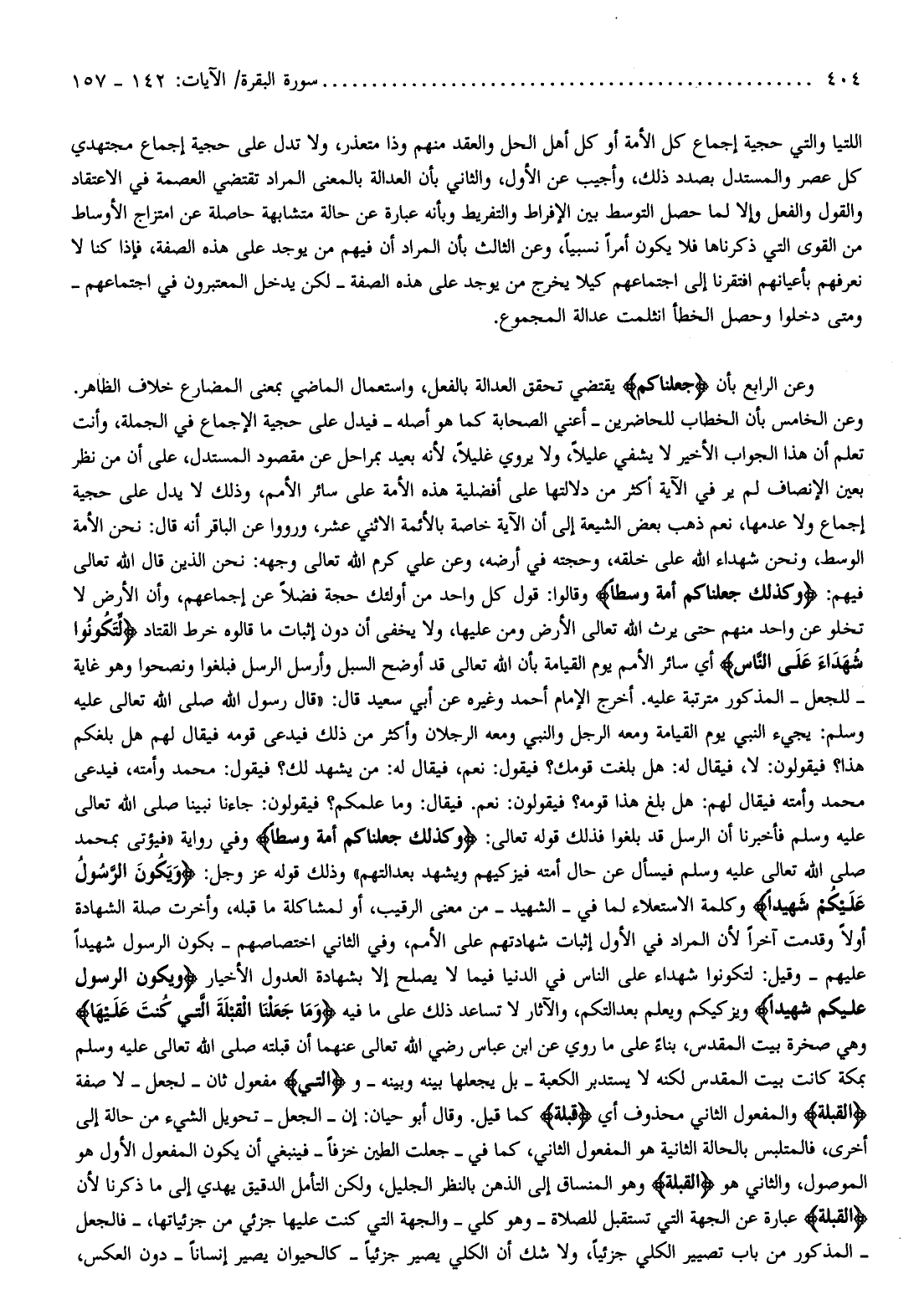اللتيا والتي حجية إجماع كل الأمة أو كل أهل الحل والعقد منهم وذا متعذر، ولا تدل على حجية إجماع مجتهدي كل عصر والمستدل بصدد ذلك، وأجيب عن الأول، والثاني بأن العدالة بالمعنى المراد تقتضي العصمة في الاعتقاد والقول والفعل وإلا لما حصل التوسط بين الإفراط والتفريط وبأنه عبارة عن حالة متشابهة حاصلة عن امتزاج الأوساط من القوى التي ذكرناها فلا يكون أمرا نسبيا، وعن الثالث بأن المراد أن فيهم من يوجد على هذه الصفة، فإذا كنا لا نعرفهم بأعيانهم افتقرنا إلى اجتماعهم كيلا يخرج من يوجد على هذه الصفة- لكن يدخل المعتبرون في اجتماعهم- ومتى دخلوا وحصل الخطأ انثلمت عدالة المجموع.