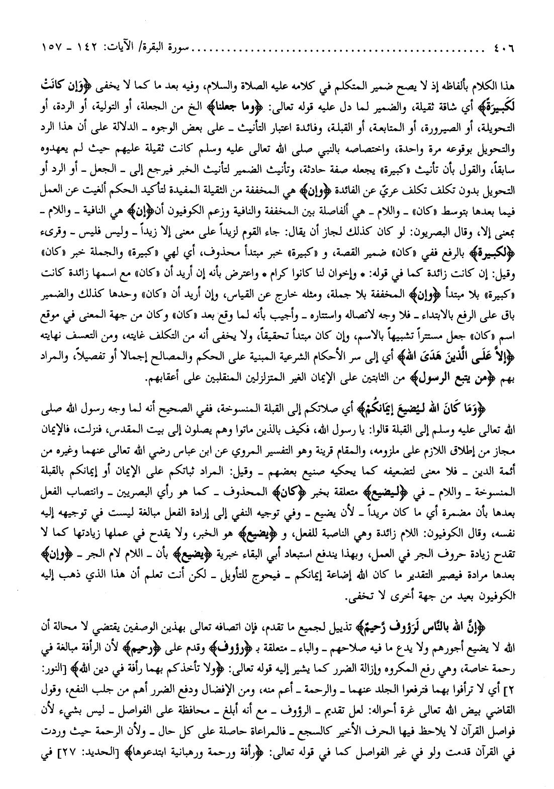 تكلف تكلف عريّ عن الفائدة وَإِنْ هي المخففة من الثقيلة المفيدة لتأكيد الحكم ألغيت عن العمل فيما بعدها بتوسط «كان» - واللام- هي الفاصلة بين المخففة والنافية وزعم الكوفيون أن إِنْ هي النافية- واللام- بمعنى إلا، وقال البصريون: لو كان كذلك لجاز أن يقال: جاء القوم لزيدا على معنى إلا زيدا- وليس فليس- وقرىء لَكَبِيرَةً بالرفع ففي «كان» ضمير القصة، و «كبيرة» خبر مبتدأ محذوف، أي لهي «كبيرة» والجملة خبر «كان» وقيل: إن كانت زائدة كما في قوله: وإخوان لنا كانوا كرام واعترض بأنه إن أريد أن «كان» مع اسمها زائدة كانت «كبيرة» بلا مبتدأ وَإِنْ المخففة بلا جملة، ومثله خارج عن القياس، وإن أريد أن «كان» وحدها كذلك والضمير باق على الرفع بالابتداء- فلا وجه لاتصاله واستتاره- وأجيب بأنه لما وقع بعد «كان» وكان من جهة المعنى في موقع اسم «كان» جعل مستترا تشبيها بالاسم، وإن كان مبتدأ تحقيقا، ولا يخفى أنه من التكلف غايته، ومن التعسف نهايته إِلَّا عَلَى الَّذِينَ هَدَى اللَّهُ أي إلى سر الأحكام الشرعية المبنية على الحكم والمصالح إجمالا أو تفصيلا، والمراد بهم مَنْ يَتَّبِعُ الرَّسُولَ من الثابتين على الإيمان الغير المتزلزلين المنقلبين على أعقابهم.