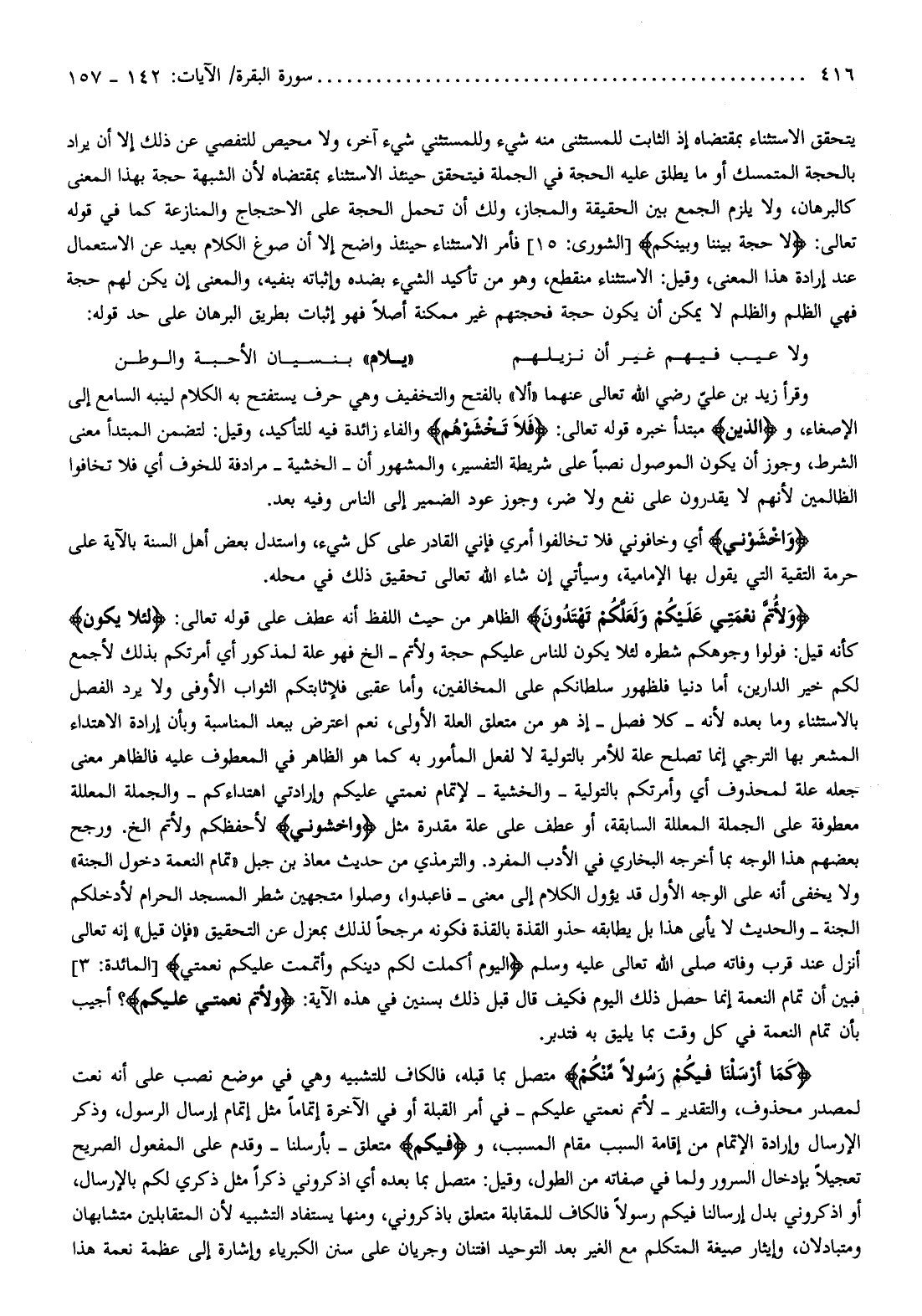 وَلِأُتِمَّ نِعْمَتِي عَلَيْكُمْ وَلَعَلَّكُمْ تَهْتَدُونَ الظاهر من حيث اللفظ أنه عطف على قوله تعالى: لِئَلَّا يَكُونَ كأنه قيل: فولوا وجوهكم شطره لئلا يكون للناس عليكم حجة ولأتم- إلخ فهو علة لمذكور أي أمرتكم بذلك لأجمع لكم خير الدارين، أما دنيا فلظهور سلطانكم على المخالفين، وأما عقبى فلإثابتكم الثواب الأوفى ولا يرد الفصل بالاستثناء وما بعده لأنه- كلا فصل- إذ هو من متعلق العلة الأولى، نعم اعترض ببعد المناسبة وبأن إرادة الاهتداء المشعر بها الترجي إنما تصلح علة للأمر بالتولية لا لفعل المأمور به كما هو الظاهر في المعطوف عليه فالظاهر معنى جعله علة لمحذوف أي وأمرتكم بالتولية- والخشية- لإتمام نعمتي عليكم وإرادتي اهتداءكم- والجملة المعللة معطوفة على الجملة المعللة السابقة، أو عطف على علة مقدرة مثل وَاخْشَوْنِي لأحفظكم ولأتم إلخ. ورجح بعضهم هذا الوجه بما أخرجه البخاري في الأدب المفرد. والترمذي من حديث معاذ بن جبل «تمام النعمة دخول الجنة» ولا يخفى أنه على الوجه الأول قد يؤول الكلام إلى معنى- فاعبدوا، وصلوا متجهين شطر المسجد الحرام لأدخلكم الجنة- والحديث لا يأبى هذا بل يطابقه حذو القذة بالقذة فكونه مرجحا لذلك بمعزل عن التحقيق «فإن قيل» إنه تعالى أنزل عند قرب وفاته صلى الله تعالى عليه وسلم الْيَوْمَ أَكْمَلْتُ لَكُمْ دِينَكُمْ وَأَتْمَمْتُ عَلَيْكُمْ نِعْمَتِي [المائدة: 3] فبين أن تمام النعمة إنما حصل ذلك اليوم فكيف قال قبل ذلك بسنين في هذه الآية: وَلِأُتِمَّ نِعْمَتِي عَلَيْكُمْ؟ أجيب بأن تمام النعمة في كل وقت بما يليق به فتدبر.