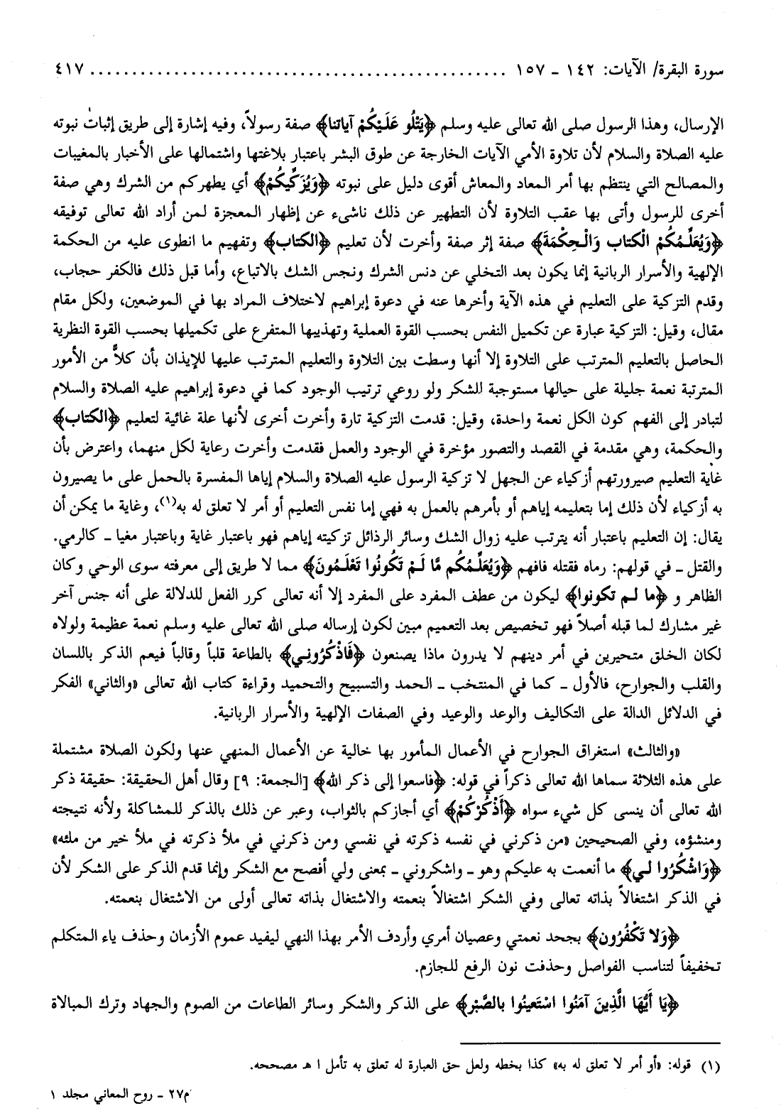 والقتل- في قولهم: رماه فقتله فافهم وَيُعَلِّمُكُمْ ما لَمْ تَكُونُوا تَعْلَمُونَ مما لا طريق إلى معرفته سوى الوحي وكان الظاهر وما لَمْ تَكُونُوا ليكون من عطف المفرد على المفرد إلا أنه تعالى كرر الفعل للدلالة على أنه جنس آخر غير مشارك لما قبله أصلا فهو تخصيص بعد التعميم مبين لكون إرساله صلى الله تعالى عليه وسلم نعمة عظيمة ولولاه لكان الخلق متحيرين في أمر دينهم لا يدرون ماذا يصنعون فَاذْكُرُونِي بالطاعة قلبا وقالبا فيعم الذكر باللسان والقلب والجوارح، فالأول- كما في المنتخب- الحمد والتسبيح والتحميد وقراءة كتاب الله تعالى «والثاني» الفكر في الدلائل الدالة على التكاليف والوعد والوعيد وفي الصفات الإلهية والأسرار الربانية.