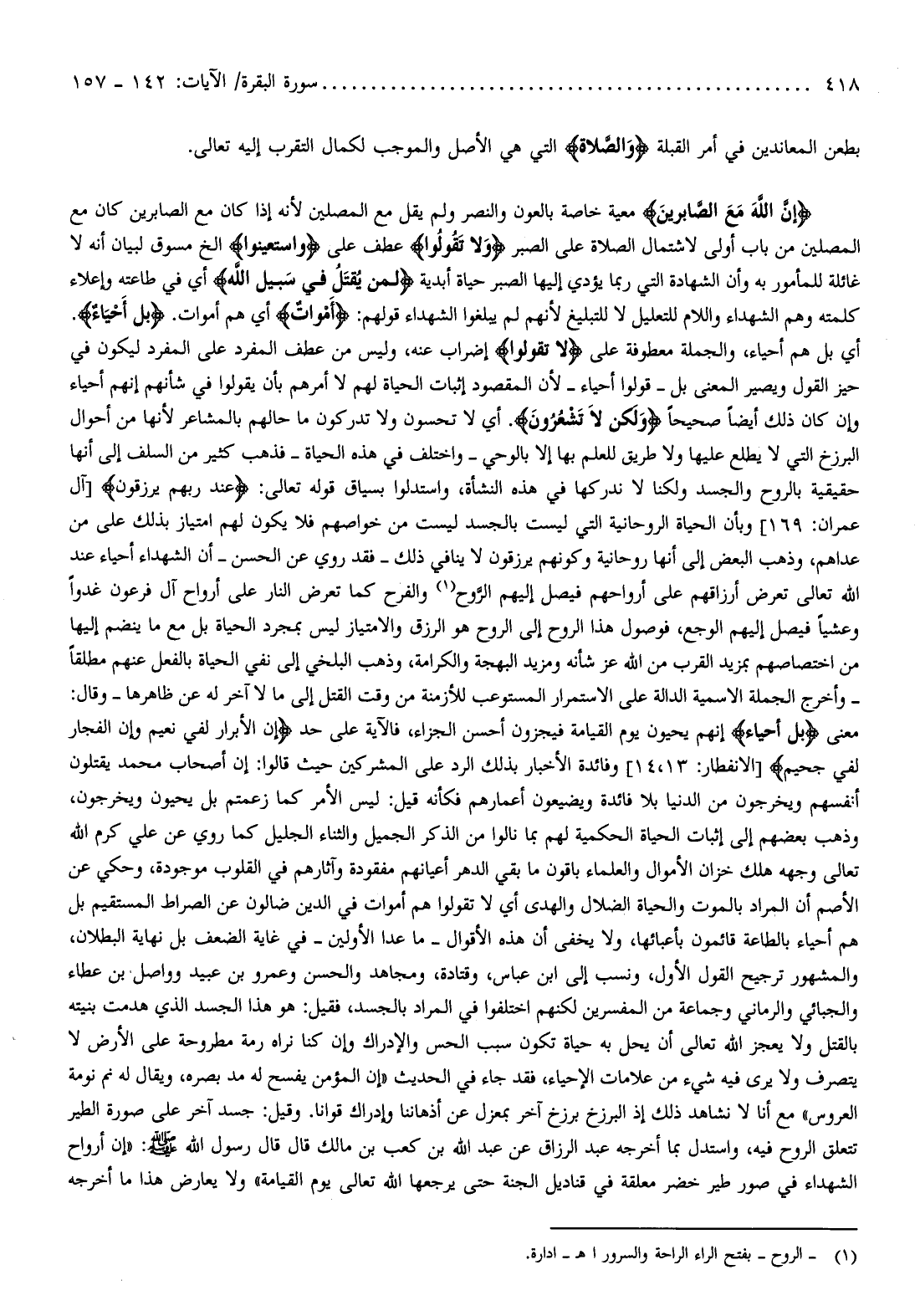 إِنَّ اللَّهَ مَعَ الصَّابِرِينَ معية خاصة بالعون والنصر ولم يقل مع المصلين لأنه إذا كان مع الصابرين كان مع المصلين من باب أولى لاشتمال الصلاة على الصبر وَلا تَقُولُوا عطف على اسْتَعِينُوا إلخ مسوق لبيان أنه لا غائلة للمأمور به وأن الشهادة التي ربما يؤدي إليها الصبر حياة أبدية لِمَنْ يُقْتَلُ فِي سَبِيلِ اللَّهِ أي في طاعته وإعلاء كلمته وهم الشهداء واللام للتعليل لا للتبليغ لأنهم لم يبلغوا الشهداء قولهم: أَمْواتٌ أي هم أموات. بَلْ أَحْياءٌ.