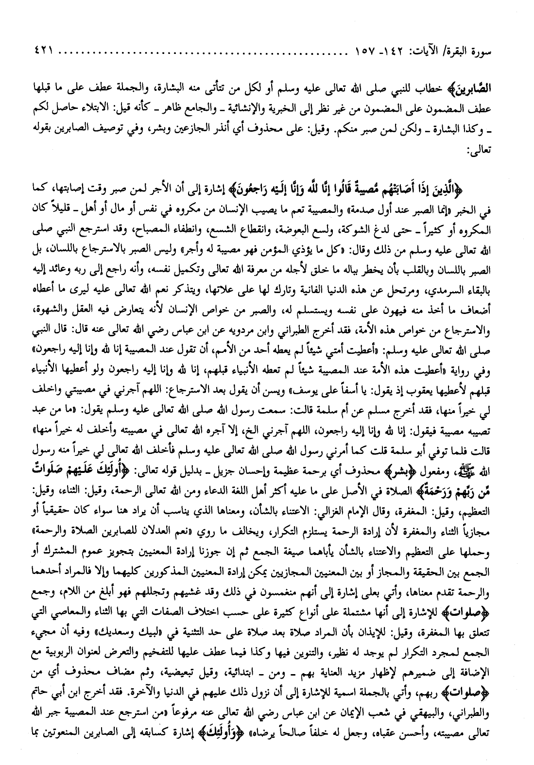 ومفعول بَشِّرِ محذوف أي برحمة عظيمة وإحسان جزيل- بدليل قوله تعالى: أُولئِكَ عَلَيْهِمْ صَلَواتٌ مِنْ رَبِّهِمْ وَرَحْمَةٌ الصلاة في الأصل على ما عليه أكثر أهل اللغة الدعاء ومن الله تعالى الرحمة، وقيل: الثناء، وقيل: