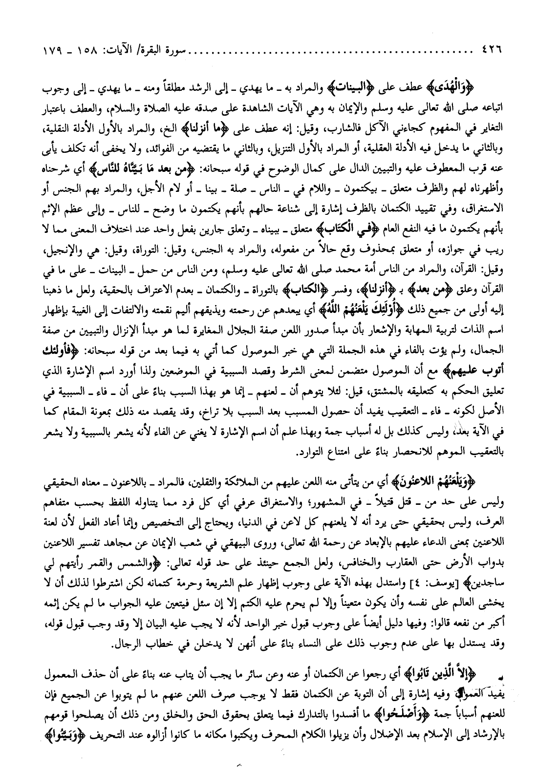 وَالْهُدى عطف على الْبَيِّناتِ والمراد به- ما يهدي- إلى الرشد مطلقا ومنه- ما يهدي- إلى وجوب اتباعه صلى الله تعالى عليه وسلم والإيمان به وهي الآيات الشاهدة على صدقه عليه الصلاة والسلام، والعطف باعتبار التغاير في المفهوم كجاءني الآكل فالشارب، وقيل: إنه عطف على ما أَنْزَلْنا إلخ، والمراد بالأول الأدلة النقلية، وبالثاني ما يدخل فيه الأدلة العقلية، أو المراد بالأول التنزيل، وبالثاني ما يقتضيه من الفوائد، ولا يخفى أنه تكلف يأبى عنه قرب المعطوف عليه والتبيين الدال على كمال الوضوح في قوله سبحانه: مِنْ بَعْدِ ما بَيَّنَّاهُ لِلنَّاسِ أي شرحناه وأظهرناه لهم والظرف متعلق- بيكتمون- واللام في- الناس- صلة- بينا- أو لام الأجل، والمراد بهم الجنس أو الاستغراق، وفي تقييد الكتمان بالظرف إشارة إلى شناعة حالهم بأنهم يكتمون ما وضح- للناس- وإلى عظم الإثم بأنهم يكتمون ما فيه النفع العام فِي الْكِتابِ متعلق- ببيناه- وتعلق جارين بفعل واحد عند اختلاف المعنى مما لا ريب في جوازه، أو متعلق بمحذوف وقع حالا من مفعوله، والمراد به الجنس، وقيل: التوراة، وقيل: هي والإنجيل، وقيل: القرآن، والمراد من الناس أمة محمد صلى الله تعالى عليه وسلم، ومن الناس من حمل- البينات- على ما في القرآن وعلق مِنْ بَعْدِ ب أَنْزَلْنا، وفسر الْكِتابِ بالتوراة- والكتمان- بعدم الاعتراف بالحقية، ولعل ما ذهبنا إليه أولى من جميع ذلك أُولئِكَ يَلْعَنُهُمُ اللَّهُ أي يبعدهم عن رحمته ويذيقهم أليم نقمته والالتفات إلى الغيبة بإظهار اسم الذات لتربية المهابة والإشعار بأن مبدأ صدور اللعن صفة الجلال المغايرة لما هو مبدأ الإنزال والتبيين من صفة الجمال، ولم يؤت بالفاء في هذه الجملة التي هي خبر الموصول كما أتي به فيما بعد من قوله سبحانه: فَأُولئِكَ أَتُوبُ عَلَيْهِمْ مع أن الموصول متضمن لمعنى الشرط وقصد السببية في الموضعين ولذا أورد اسم الإشارة الذي تعليق الحكم به كتعليقه بالمشتق، قيل: لئلا يتوهم أن- لعنهم- إنما هو بهذا السبب بناء على أن- فاء- السببية في الأصل لكونه- فاء- التعقيب يفيد أن حصول المسبب بعد السبب بلا تراخ، وقد يقصد منه ذلك بمعونة المقام كما في الآية بعد، وليس كذلك بل له أسباب جمة وبهذا علم أن اسم الإشارة لا يغني عن الفاء لأنه يشعر بالسببية ولا يشعر بالتعقيب الموهم للانحصار بناء على امتناع التوارد.
