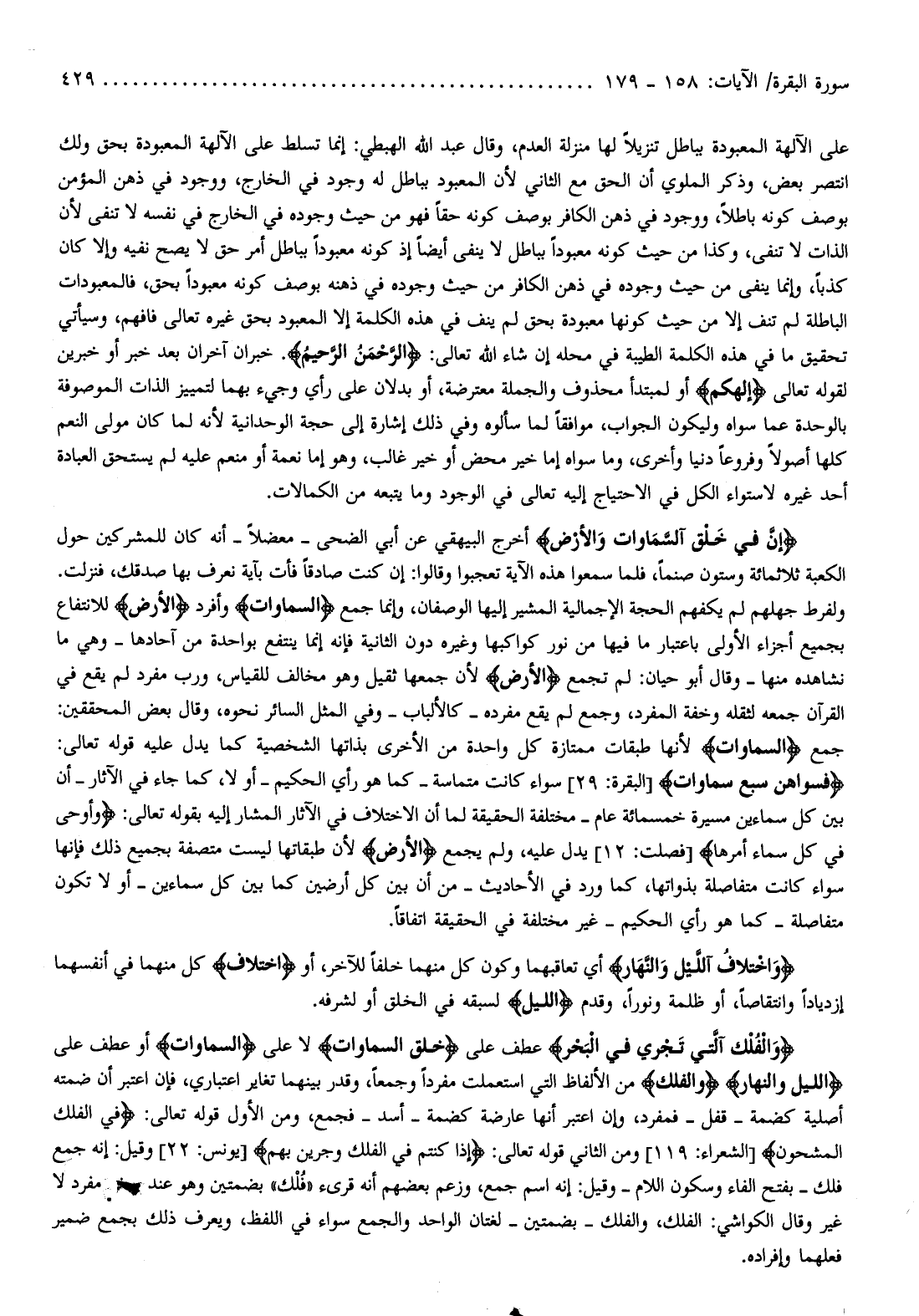 على الآلهة المعبودة بباطل تنزيلا لها منزلة العدم، وقال عبد الله الهبطي: إنما تسلط على الآلهة المعبودة بحق ولك انتصر بعض، وذكر الملوي أن الحق مع الثاني لأن المعبود بباطل له وجود في الخارج، ووجود في ذهن المؤمن بوصف كونه باطلا، ووجود في ذهن الكافر بوصف كونه حقا فهو من حيث وجوده في الخارج في نفسه لا تنفى لأن الذات لا تنفى، وكذا من حيث كونه معبودا بباطل لا ينفى أيضا إذ كونه معبودا بباطل أمر حق لا يصح نفيه وإلا كان كذبا، وإنما ينفى من حيث وجوده في ذهن الكافر من حيث وجوده في ذهنه بوصف كونه معبودا بحق، فالمعبودات الباطلة لم تنف إلا من حيث كونها معبودة بحق لم ينف في هذه الكلمة إلا المعبود بحق غيره تعالى فافهم، وسيأتي تحقيق ما في هذه الكلمة الطيبة في محله إن شاء الله تعالى: الرَّحْمنُ الرَّحِيمُ. خبران آخران بعد خبر أو خبرين لقوله تعالى إِلهُكُمْ أو لمبتدأ محذوف والجملة معترضة، أو بدلان على رأي وجيء بهما لتمييز الذات الموصوفة بالوحدة عما سواه وليكون الجواب، موافقا لما سألوه وفي ذلك إشارة إلى حجة الوحدانية لأنه لما كان مولى النعم كلها أصولا وفروعا دنيا وأخرى، وما سواه إما خير محض أو خير غالب، وهو إما نعمة أو منعم عليه لم يستحق العبادة أحد غيره لاستواء الكل في الاحتياج إليه تعالى في الوجود وما يتبعه من الكمالات.