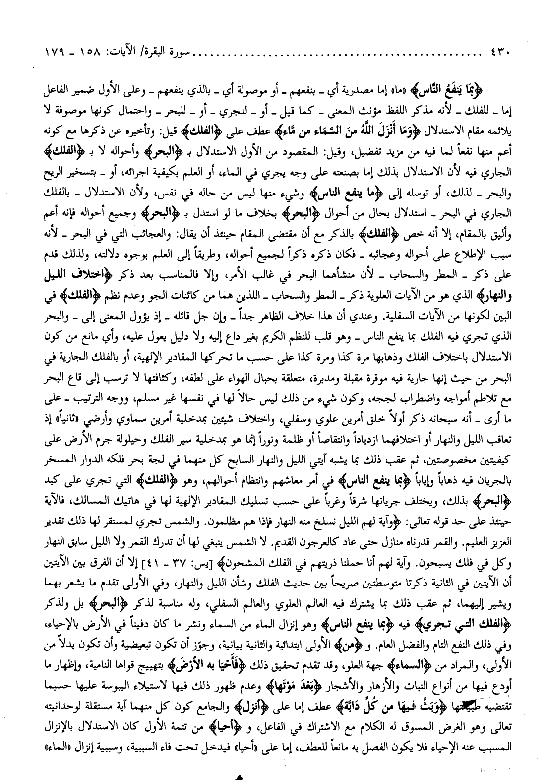 بِما يَنْفَعُ النَّاسَ «ما» إما مصدرية أي- بنفعهم- أو موصولة أي- بالذي ينفعهم- وعلى الأول ضمير الفاعل إما- للفلك- لأنه مذكر اللفظ مؤنث المعنى- كما قيل- أو- للجري- أو- للبحر- واحتمال كونها موصوفة لا يلائمه مقام الاستدلال وَما أَنْزَلَ اللَّهُ مِنَ السَّماءِ مِنْ ماءٍ عطف على الْفُلْكِ قيل: وتأخيره عن ذكرها مع كونه أعم منها نفعا لما فيه من مزيد تفضيل، وقيل: المقصود من الأول الاستدلال ب الْبَحْرِ وأحواله لا ب الْفُلْكِ الجاري فيه لأن الاستدلال بذلك إما بصنعته على وجه يجري في الماء، أو العلم بكيفية اجرائه، أو- بتسخير الريح والبحر- لذلك، أو توسله إلى بِما يَنْفَعُ النَّاسَ وشيء منها ليس من حاله في نفس، ولأن الاستدلال- بالفلك الجاري في البحر- استدلال بحال من أحوال الْبَحْرِ بخلاف ما لو استدل ب الْبَحْرِ وجميع أحواله فإنه أعم وأليق بالمقام، إلا أنه خص الْفُلْكِ بالذكر مع أن مقتضى المقام حينئذ أن يقال: والعجائب التي في البحر- لأنه سبب الإطلاع على أحواله وعجائبه- فكان ذكره ذكرا لجميع أحواله، وطريقا إلى العلم بوجوه دلالته، ولذلك قدم على ذكر- المطر والسحاب- لأن منشأهما البحر في غالب الأمر، وإلا فالمناسب بعد ذكر اخْتِلافِ اللَّيْلِ وَالنَّهارِ الذي هو من الآيات العلوية ذكر- المطر والسحاب- اللذين هما من كائنات الجو وعدم نظم الْفُلْكِ في البين لكونها من الآيات السفلية. وعندي أن هذا خلاف الظاهر جدا- وإن جل قائله- إذ يؤول المعنى إلى- والبحر الذي تجري فيه الفلك بما ينفع الناس- وهو قلب للنظم الكريم بغير داع إليه ولا دليل يعول عليه، وأي مانع من كون الاستدلال باختلاف الفلك وذهابها مرة كذا ومرة كذا على حسب ما تحركها المقادير الإلهية، أو بالفلك الجارية في البحر من حيث إنها جارية فيه موقرة مقبلة ومدبرة، متعلقة بحبال الهواء على لطفه، وكثافتها لا ترسب إلى قاع البحر مع تلاطم أمواجه واضطراب لججه، وكون شيء من ذلك ليس حالا لها في نفسها غير مسلم، ووجه الترتيب- على ما أرى- أنه سبحانه ذكر أولا خلق أمرين علوي وسفلي، واختلاف شيئين بمدخلية أمرين سماوي وأرضي «ثانيا» إذ تعاقب الليل والنهار أو اختلافهما ازديادا وانتقاصا أو ظلمة ونورا إنما هو بمدخلية سير الفلك وحيلولة جرم الأرض على كيفيتين مخصوصتين، ثم عقب ذلك بما يشبه آيتي الليل والنهار السابح كل منهما في لجة بحر فلكه الدوار المسخر بالجريان فيه ذهابا وإيابا بِما يَنْفَعُ النَّاسَ في أمر معاشهم وانتظام أحوالهم، وهو الْفُلْكِ التي تجري على كبد الْبَحْرِ بذلك، ويختلف جريانها شرقا وغربا على حسب تسليك المقادير الإلهية لها في هاتيك المسالك، فالآية حينئذ على حد قوله تعالى: وَآيَةٌ لَهُمُ اللَّيْلُ نَسْلَخُ مِنْهُ النَّهارَ فَإِذا هُمْ مُظْلِمُونَ. وَالشَّمْسُ تَجْرِي لِمُسْتَقَرٍّ لَها ذلِكَ تَقْدِيرُ الْعَزِيزِ الْعَلِيمِ. وَالْقَمَرَ قَدَّرْناهُ مَنازِلَ حَتَّى عادَ كَالْعُرْجُونِ الْقَدِيمِ. لَا الشَّمْسُ يَنْبَغِي لَها أَنْ تُدْرِكَ الْقَمَرَ وَلَا اللَّيْلُ سابِقُ النَّهارِ وَكُلٌّ فِي فَلَكٍ يَسْبَحُونَ. وَآيَةٌ لَهُمْ أَنَّا حَمَلْنا ذُرِّيَّتَهُمْ فِي الْفُلْكِ الْمَشْحُونِ [يس: 37- 41] إلا أن الفرق بين الآيتين أن الآيتين في الثانية ذكرتا متوسطتين صريحا بين حديث الفلك وشأن الليل والنهار، وفي الأولى تقدم ما يشعر بهما ويشير إليهما، ثم عقب ذلك بما يشترك فيه العالم العلوي والعالم السفلي، وله مناسبة لذكر الْبَحْرِ بل ولذكر الْفُلْكِ الَّتِي تَجْرِي فيه بِما يَنْفَعُ النَّاسَ وهو إنزال الماء من السماء ونشر ما كان دفينا في الأرض بالإحياء، وفي ذلك النفع التام والفضل العام. ومِنَ الأولى ابتدائية والثانية بيانية، وجوّز أن