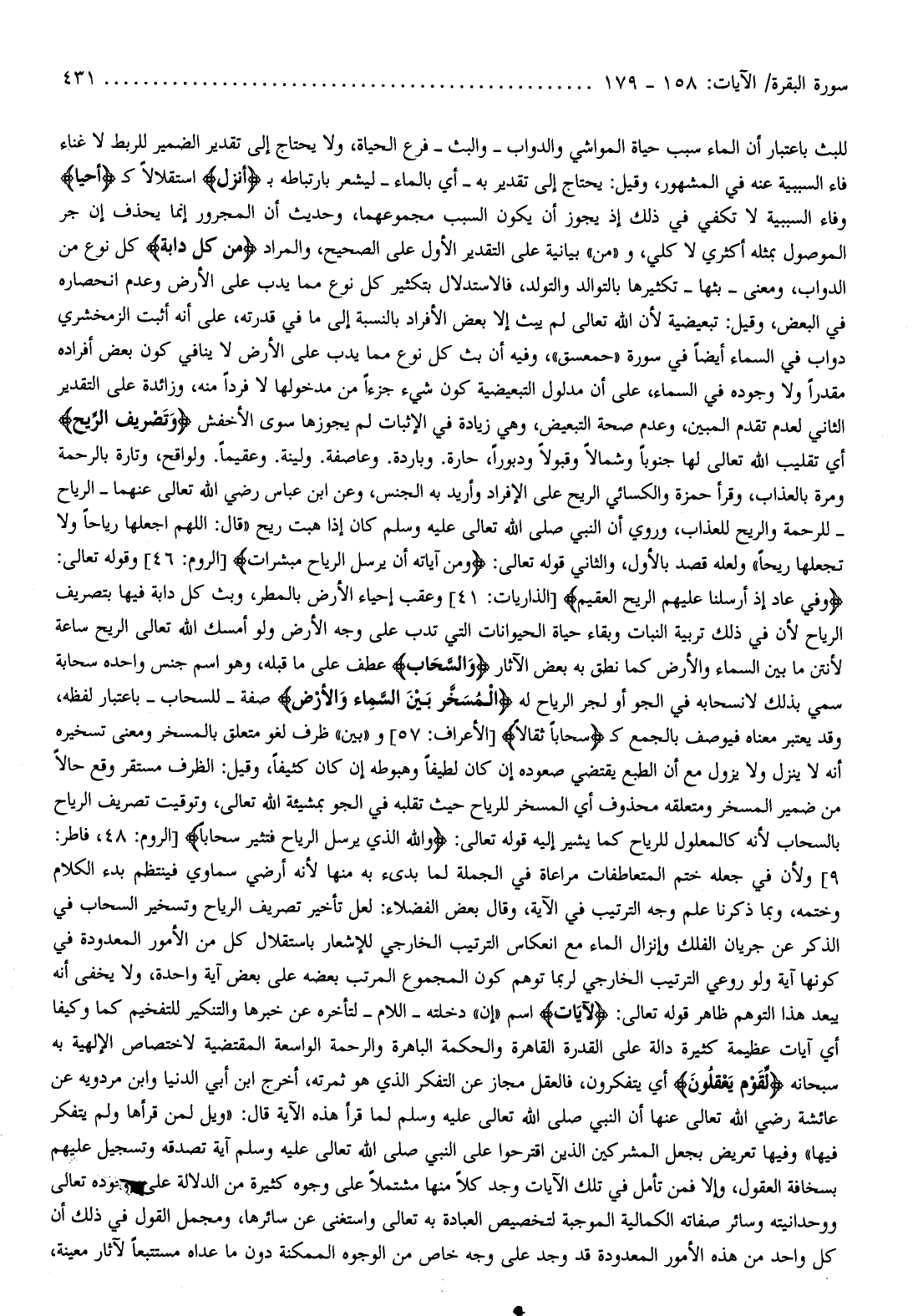للبث باعتبار أن الماء سبب حياة المواشي والدواب- والبث- فرع الحياة، ولا يحتاج إلى تقدير الضمير للربط لا غناء فاء السببية عنه في المشهور، وقيل: يحتاج إلى تقدير به- أي بالماء- ليشعر بارتباطه ب أَنْزَلَ استقلالا كأحيا وفاء السببية لا تكفي في ذلك إذ يجوز أن يكون السبب مجموعهما، وحديث أن المجرور إنما يحذف إن جر الموصول بمثله أكثري لا كلي، و «من» بيانية على التقدير الأول على الصحيح، والمراد مِنْ كُلِّ دَابَّةٍ كل نوع من الدواب، ومعنى- بثها- تكثيرها بالتوالد والتولد، فالاستدلال بتكثير كل نوع مما يدب على الأرض وعدم انحصاره في البعض، وقيل: تبعيضية لأن الله تعالى لم يبث إلا بعض الأفراد بالنسبة إلى ما في قدرته، على أنه أثبت الزمخشري دواب في السماء أيضا في سورة «حمعسق» ، وفيه أن بث كل نوع مما يدب على الأرض لا ينافي كون بعض أفراده مقدرا ولا وجوده في السماء، على أن مدلول التبعيضية كون شيء جزءا من مدخولها لا فردا منه، وزائدة على التقدير الثاني لعدم تقدم المبين، وعدم صحة التبعيض، وهي زيادة في الإثبات لم يجوزها سوى الأخفش وَتَصْرِيفِ الرِّياحِ أي تقليب الله تعالى لها جنوبا وشمالا وقبولا ودبورا، حارة. وباردة. وعاصفة. ولينة. وعقيما. ولواقح، وتارة بالرحمة ومرة بالعذاب، وقرأ حمزة والكسائي الريح على الإفراد وأريد به الجنس، وعن ابن عباس رضي الله تعالى عنهما- الرياح- للرحمة والريح للعذاب،