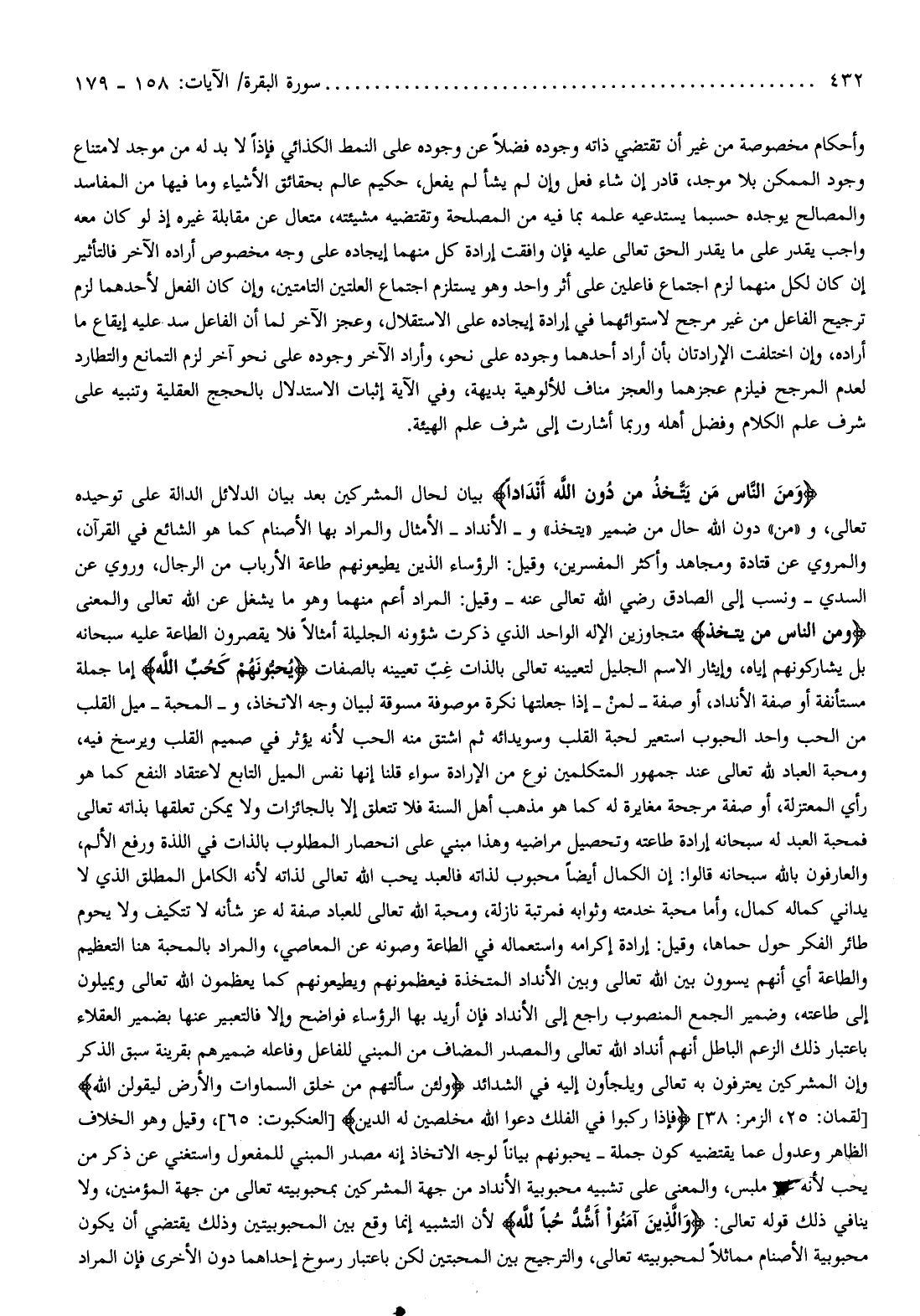 وقيل: المراد أعم منهما وهو ما يشغل عن الله تعالى والمعنى وَمِنَ النَّاسِ مَنْ يَتَّخِذُ متجاوزين الإله الواحد الذي ذكرت شؤونه الجليلة أمثالا فلا يقصرون الطاعة عليه سبحانه بل يشاركونهم إياه، وإيثار الاسم الجليل لتعيينه تعالى بالذات غبّ تعيينه بالصفات يُحِبُّونَهُمْ كَحُبِّ اللَّهِ إما جملة مستأنفة أو صفة الأنداد، أو صفة- لمن- إذا جعلتها نكرة موصوفة مسوقة لبيان وجه الاتخاذ، والمحبة- ميل القلب من الحب واحد الحبوب استعير لحبة القلب وسويدائه ثم اشتق منه الحب لأنه يؤثر في صميم القلب ويرسخ فيه، ومحبة العباد لله تعالى عند جمهور المتكلمين نوع من الإرادة سواء قلنا إنها نفس الميل التابع لاعتقاد النفع كما هو رأي المعتزلة، أو صفة مرجحة مغايرة له كما هو مذهب أهل السنة فلا تتعلق إلا بالجائزات ولا يمكن تعلقها بذاته تعالى فمحبة العبد له سبحانه إرادة طاعته وتحصيل مراضيه وهذا مبني على انحصار المطلوب بالذات في اللذة ورفع الألم، والعارفون بالله سبحانه قالوا: إن الكمال أيضا محبوب لذاته فالعبد يحب الله تعالى لذاته لأنه الكامل المطلق الذي لا يداني كماله كمال، وأما محبة خدمته وثوابه فمرتبة نازلة، ومحبة الله تعالى للعباد صفة له عز شأنه لا تتكيف ولا يحوم طائر الفكر حول حماها، وقيل: إرادة إكرامه واستعماله في الطاعة وصونه عن المعاصي، والمراد بالمحبة هنا التعظيم والطاعة أي أنهم يسوون بين الله تعالى وبين الأنداد المتخذة فيعظمونهم ويطيعونهم كما يعظمون الله تعالى ويميلون إلى طاعته، وضمير الجمع المنصوب راجع إلى الأنداد فإن أريد بها الرؤساء فواضح وإلا فالتعبير عنها بضمير العقلاء باعتبار ذلك الزعم الباطل أنهم أنداد الله تعالى والمصدر المضاف من المبني للفاعل وفاعله ضميرهم بقرينة سبق الذكر وإن المشركين يعترفون به تعالى ويلجأون إليه في الشدائد وَلَئِنْ سَأَلْتَهُمْ مَنْ خَلَقَ السَّماواتِ وَالْأَرْضَ لَيَقُولُنَّ اللَّهُ