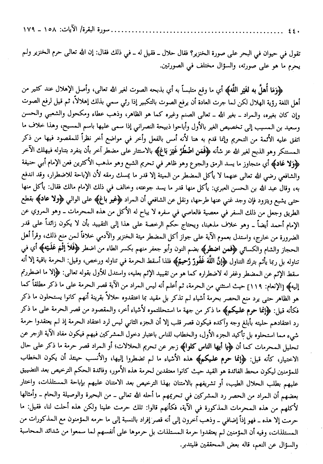 وَما أُهِلَّ بِهِ لِغَيْرِ اللَّهِ أي ما وقع متلبسا به أي بذبحه الصوت لغير الله تعالى، وأصل الإهلال عند كثير من أهل اللغة رؤية الهلال لكن لما جرت العادة أن يرفع الصوت بالتكبير إذا رئي سمي بذلك إهلالا، ثم قيل لرفع الصوت وإن كان بغيره، والمراد- بغير الله- تعالى الصنم وغيره كما هو الظاهر، وذهب عطاء ومكحول والشعبي والحسن وسعيد بن المسيب إلى تخصيص الغير بالأول وأباحوا ذبيحة النصراني إذا سمى عليها باسم المسيح، وهذا خلاف ما اتفق عليه الأئمة من التحريم وإنما قدم به هنا لأنه أمس بالفعل وأخر في مواضع أخر نظرا للمقصود فيها من ذكر المستنكر وهو الذبح لغير الله عز شأنه فَمَنِ اضْطُرَّ غَيْرَ باغٍ بالاستتار على مضطر آخر بأن ينفرد بتناوله فيهلك الآخر وَلا عادٍ أي متجاوز ما يسد الرمق والجوع وهو ظاهر في تحريم الشبع وهو مذهب الأكثرين فعن الإمام أبي حنيفة والشافعي رضي الله تعالى عنهما لا يأكل المضطر من الميتة إلا قدر ما يمسك رمقه لأن الإباحة للاضطرار، وقد اندفع به، وقال عبد الله بن الحسن العبري: يأكل منها قدر ما يسد جوعته، وخالف في ذلك الإمام مالك فقال: يأكل منها حتى يشبع ويتزود فإن وجد غني عنها طرحها، ونقل عن الشافعي أن المراد غَيْرَ باغٍ على الوالي وَلا عادٍ بقطع الطريق وجعل من ذلك السفر في معصية فالعاصي في سفره لا يباح له الأكل من هذه المحرمات- وهو المروي عن الإمام أحمد أيضا- وهو خلاف مذهبنا، ويحتاج حكم الرخصة على هذا إلى التقييد بأن لا يكون زائدا على قدر الضرورة من خارج، واستدل بعموم الآية على جواز أكل المضطر ميتة الخنزير والآدمي خلافا لمن منع ذلك، وقرأ أهل الحجاز والشام والكسائي فَمَنِ اضْطُرَّ بضم النون وأبو جعفر منهم بكسر الطاء من اضطر فَلا إِثْمَ عَلَيْهِ أي في تناوله بل ربما يأثم بترك التناول إِنَّ اللَّهَ غَفُورٌ رَحِيمٌ فلذا أسقط الحرمة في تناوله ورخص، وقيل: الحرمة باقية إلا أنه سقط الإثم عن المضطر وغفر له لاضطراره كما هو من تقييد الإثم بعليه، واستدل للأول بقوله تعالى: إِلَّا مَا اضْطُرِرْتُمْ إِلَيْهِ [الإنعام: 119] حيث استثني من الحرمة، ثم أعلم أنه ليس المراد من الآية قصر الحرمة على ما ذكر مطلقا كما هو الظاهر حتى يرد منع الحصر بحرمة أشياء لم تذكر بل مقيد بما اعتقدوه حلالا بقرينة أنهم كانوا يستحلون ما ذكر فكأنه قيل: إِنَّما حَرَّمَ عَلَيْكُمُ ما ذكر من جهة ما استحللتموه لأشياء أخر، والمقصود من قصر الحرمة على ما ذكر رد اعتقادهم حليته بأبلغ وجه وآكده فيكون قصر قلب إلا أن الجزء الثاني ليس لرد اعتقاد الحرمة إذ لم يعتقدوا حرمة شيء مما استحلوه بل تأكيد الجزء الأول، والخطاب للناس باعتبار دخول المشركين فيهم فيكون مفاد الآية الزجر عن تحليل المحرمات كما أن يا أَيُّهَا النَّاسُ كُلُوا زجر عن تحريم الحلالات أو المراد قصر حرمة ما ذكر على حال الاختيار، كأنه قيل: إِنَّما حَرَّمَ عَلَيْكُمُ هذه الأشياء ما لم تضطروا إليها، والأنسب حينئذ أن يكون الخطاب للمؤمنين ليكون محط الفائدة هو القيد حيث كانوا معتقدين لحرمة هذه الأمور، وفائدة الحكم الترخيص بعد التضييق عليهم بطلب الحلال الطيب، أو تشريفهم بالامتنان بهذا الترخيص بعد الامتنان عليهم بإباحة المستلذات، واختار بعضهم أن المراد من الحصر رد المشركين في تحريمهم ما أحله الله تعالى- من البحيرة والوصيلة والحام- وأمثالها لأكلهم من هذه المحرمات المذكورة في الآية، فكأنهم قالوا: تلك حرمت علينا ولكن هذه أحلت لنا، فقيل: ما حرمت إلا هذه- فهو إذا إضافي- وذهب آخرون إلى أنه قصر إفراد بالنسبة إلى ما حرمه المؤمنون مع المذكورات من المستلذات، وفيه أن المؤمنين لم يعتقدوا حرمة المستلذات بل حرموها على أنفسهم لما سمعوا من شدائد المحاسبة والسؤال عن النعم، قاله بعض المحققين فليتدبر.