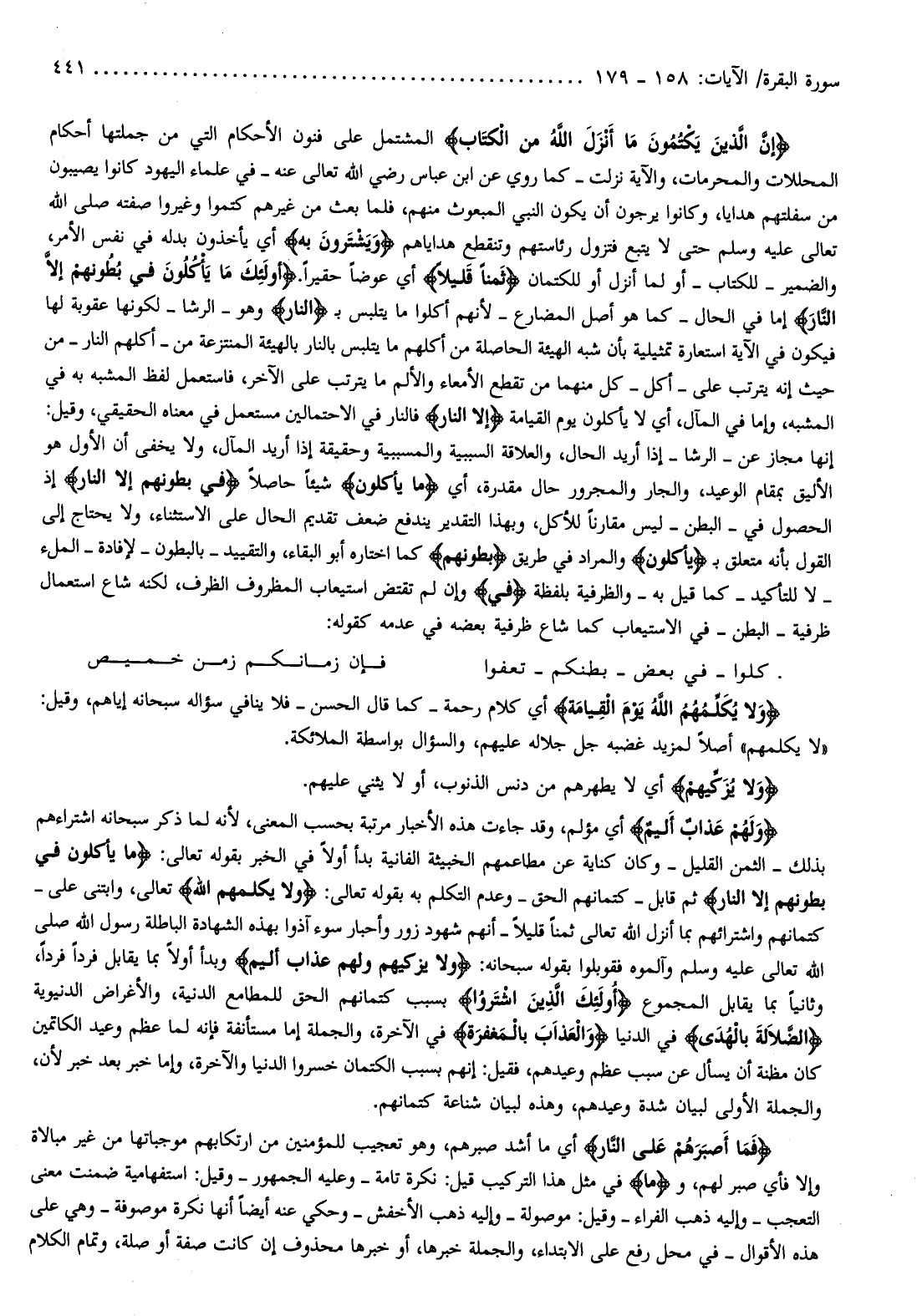 - أو لما أنزل أو للكتمان ثَمَناً قَلِيلًا أي عوضا حقيرا. أُولئِكَ ما يَأْكُلُونَ فِي بُطُونِهِمْ إِلَّا النَّارَ إما في الحال- كما هو أصل المضارع- لأنهم أكلوا ما يتلبس ب النَّارَ وهو- الرشا- لكونها عقوبة لها فيكون في الآية استعارة تمثيلية بأن شبه الهيئة الحاصلة من أكلهم ما يتلبس بالنار بالهيئة المنتزعة من- أكلهم النار- من حيث إنه يترتب على- أكل- كل منهما من تقطع الأمعاء والألم ما يترتب على الآخر، فاستعمل لفظ المشبه به في المشبه، وإما في المآل، أي لا يأكلون يوم القيامة إِلَّا النَّارَ فالنار في الاحتمالين مستعمل في معناه الحقيقي، وقيل: