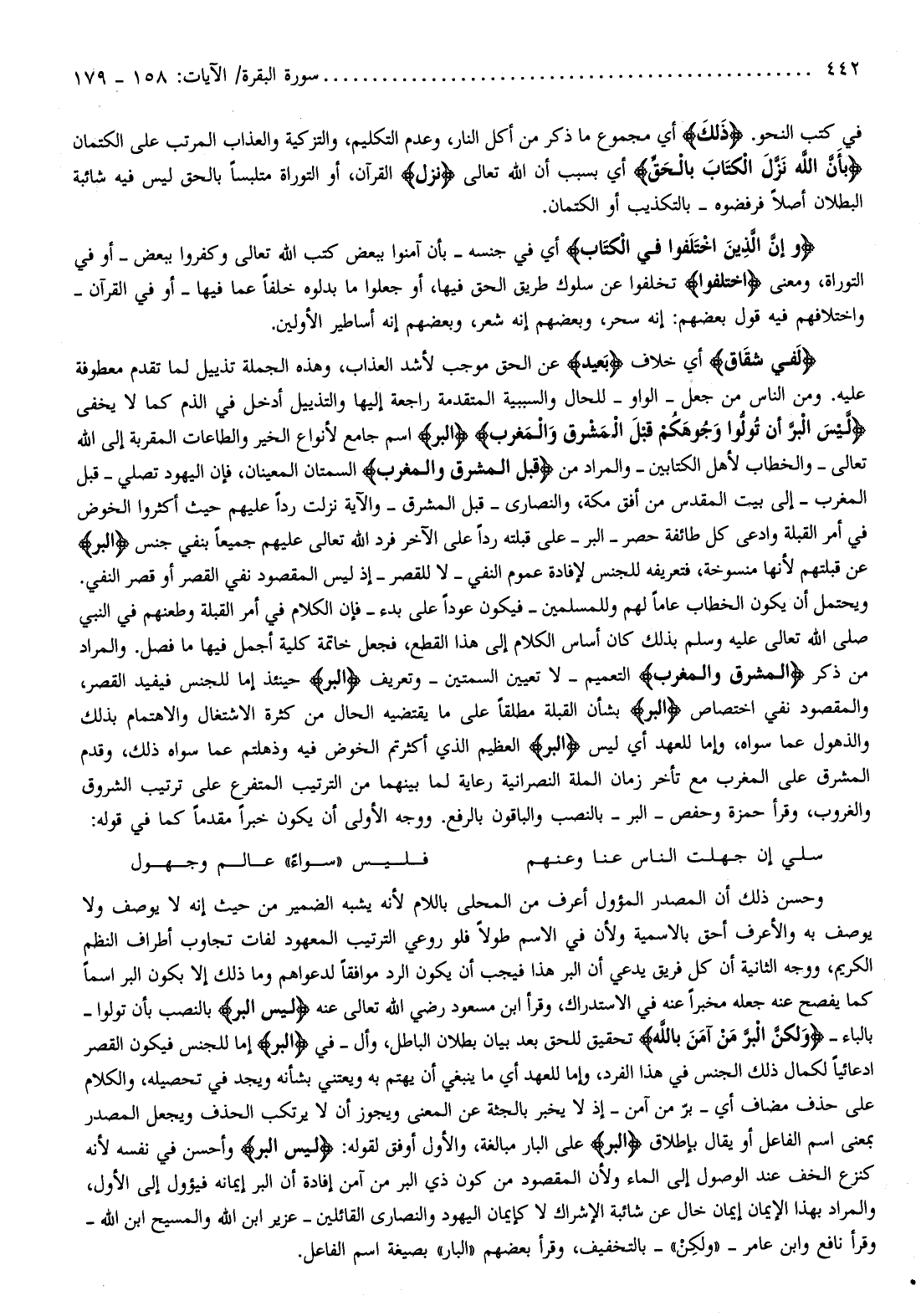 لَفِي شِقاقٍ أي خلاف بَعِيدٍ عن الحق موجب لأشد العذاب، وهذه الجملة تذييل لما تقدم معطوفة عليه. ومن الناس من جعل- الواو- للحال والسببية المتقدمة راجعة إليها والتذييل أدخل في الذم كما لا يخفى لَيْسَ الْبِرَّ أَنْ تُوَلُّوا وُجُوهَكُمْ قِبَلَ الْمَشْرِقِ وَالْمَغْرِبِ الْبِرَّ اسم جامع لأنواع الخير والطاعات المقربة إلى الله تعالى- والخطاب لأهل الكتابين- والمراد من قِبَلَ الْمَشْرِقِ وَالْمَغْرِبِ السمتان المعينان، فإن اليهود تصلي- قبل المغرب- إلى بيت المقدس من أفق مكة، والنصارى- قبل المشرق- والآية نزلت ردا عليهم حيث أكثروا الخوض في أمر القبلة وادعى كل طائفة حصر- البر- على قبلته ردا على الآخر فرد الله تعالى عليهم جميعا بنفي جنس الْبِرَّ عن قبلتهم لأنها منسوخة، فتعريفه للجنس لإفادة عموم النفي- لا للقصر- إذ ليس المقصود نفي القصر أو قصر النفي.