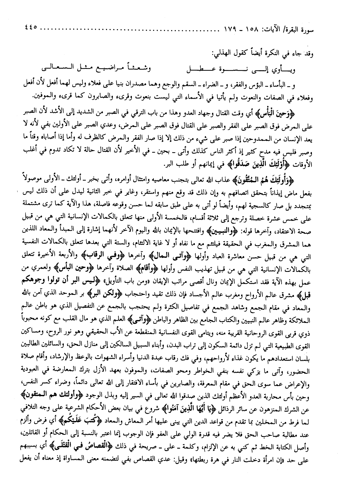 وَأُولئِكَ هُمُ الْمُتَّقُونَ عذاب الله تعالى بتجنب معاصيه وامتثال أوامره، وأتى بخبر- أولئك- الأولى موصولا بفعل ماض إيذانا بتحقق اتصافهم به وإن ذلك قد وقع منهم واستقر، وغاير في خبر الثانية ليدل على أن ذلك ليس بمتجدد بل صار كالسجية لهم، وأيضا لو أتى به على طبق سابقه لما حسن وقوعه فاصلة، هذا والآية كما ترى مشتملة على خمس عشرة خصلة وترجع إلى ثلاثة أقسام، فالخمسة الأولى منها تتعلق بالكمالات الإنسانية التي هي من قبيل صحة الاعتقاد، وآخرها قوله: وَالنَّبِيِّينَ وافتتحها بالإيمان بالله واليوم الآخر لأنهما إشارة إلى المبدأ والمعاد اللذين هما المشرق والمغرب في الحقيقة فيلتئم مع ما نفاه أو لا غاية الالتئام، والستة التي بعدها تتعلق بالكمالات النفسية التي هي من قبيل حسن معاشرة العباد وأولها وَآتَى الْمالَ وآخرها وَفِي الرِّقابِ والأربعة الأخيرة تتعلق بالكمالات الإنسانية التي هي من قبيل تهذيب النفس وأولها وَأَقامَ الصلاة وآخرها وَحِينَ الْبَأْسِ ولعمري من عمل بهذه الآية فقد استكمل الإيمان ونال أقصى مراتب الإيقان «ومن باب التأويل» لَيْسَ الْبِرَّ أَنْ تُوَلُّوا وُجُوهَكُمْ قِبَلَ مشرق عالم الأرواح ومغرب عالم الأجساد فإن ذلك تقيد واحتجاب وَلكِنَّ الْبِرَّ بر الموحد الذي آمن بالله والمعاد في مقام الجمع وشاهد الجمع في تفاصيل الكثرة ولم يحتجب بالجمع عن التفصيل الذي هو باطن عالم الملائكة وظاهر عالم النبيين والكتاب الجامع بين الظاهر والباطن وَآتَى العلم الذي هو مال القلب مع كونه محبوبا ذوي قربى القوى الروحانية القريبة منه، ويتامى القوى النفسانية المنقطعة عن الأب الحقيقي وهو نور الروح، ومساكين القوى الطبيعية التي لم تزل دائمة السكون إلى تراب البدن، وأبناء السبيل السالكين إلى منازل الحق، والسائلين الطالبين بلسان استعدادهم ما يكون غذاء لأرواحهم، وفي فك رقاب عبدة الدنيا وأسراء الشهوات بالوعظ والإرشاد، وأقام صلاة الحضور، وآتى ما يزكي نفسه بنفي الخواطر ومحو الصفات، والموفون بعهد الأزل بترك المعارضة في العبودية والإعراض عما سوى الحق في مقام المعرفة، والصابرين في بأساء الافتقار إلى الله تعالى دائما، وضراء كسر النفس، وحين بأس محاربة العدو الأعظم أولئك الذين صدقوا الله تعالى في السير إليه وبذل الوجود وَأُولئِكَ هُمُ الْمُتَّقُونَ عن الشرك المنزهون عن سائر الرذائل يا أَيُّهَا الَّذِينَ آمَنُوا شروع في بيان بعض الأحكام الشرعية على وجه التلافي لما فرط من المخلين بما تقدم من قواعد الدين التي يبنى عليها أمر المعاش والمعاد كُتِبَ عَلَيْكُمُ أي فرض وألزم عند مطالبة صاحب الحق فلا يضر فيه قدرة الولي على العفو فإن الوجوب إنما اعتبر بالنسبة إلى الحكام أو القاتلين، وأصل الكتابة الخط ثم كني به عن الإلزام، وكلمة- على- صريحة في ذلك الْقِصاصُ فِي الْقَتْلى أي بسببهم على حد «إن امرأة دخلت النار في هرة ربطتها» وقيل: عدي القصاص بفي لتضمنه معنى المساواة إذ معناه أن يفعل
