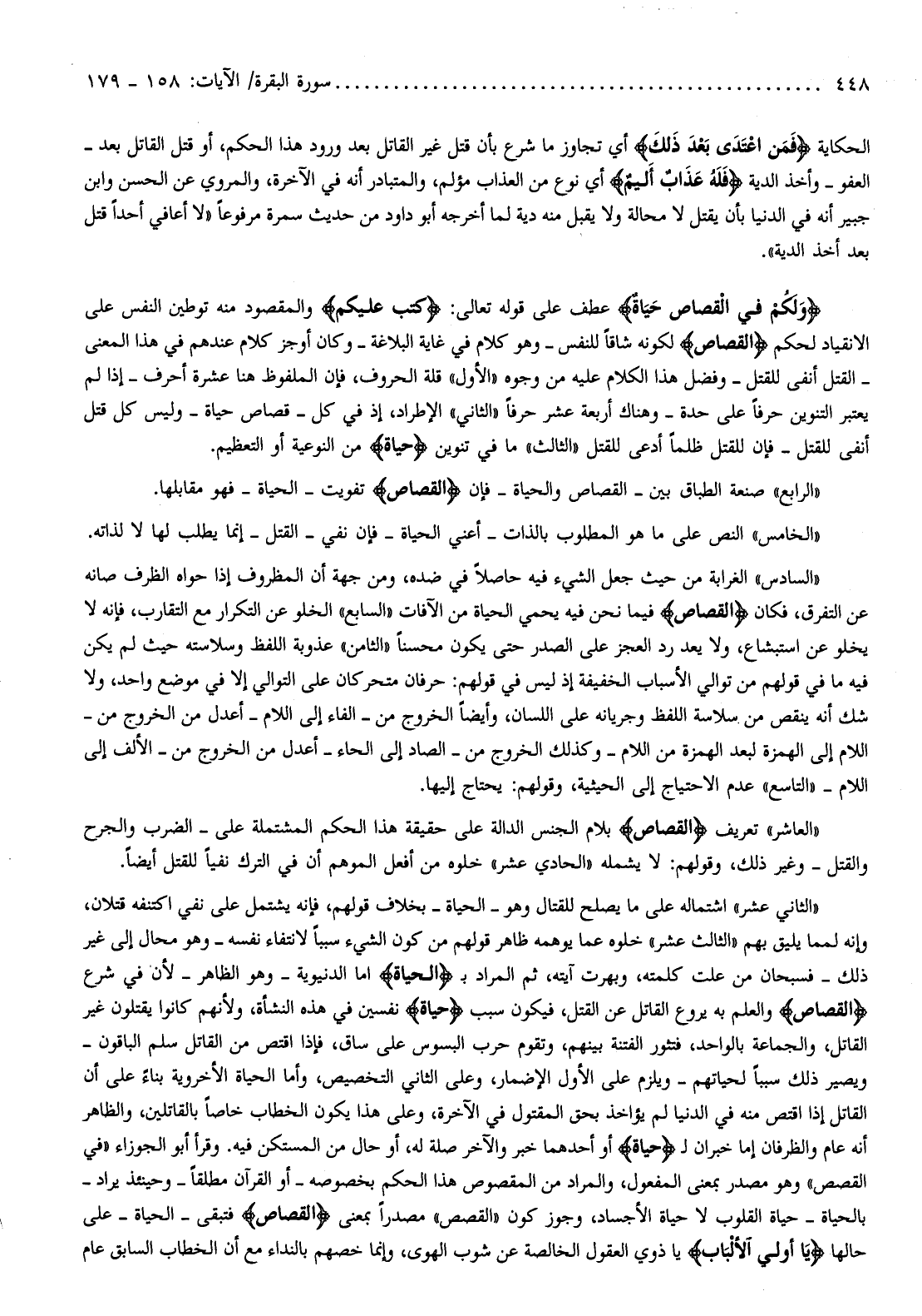وَلَكُمْ فِي الْقِصاصِ حَياةٌ عطف على قوله تعالى: كُتِبَ عَلَيْكُمُ والمقصود منه توطين النفس على الانقياد لحكم الْقِصاصِ لكونه شاقا للنفس- وهو كلام في غاية البلاغة- وكان أوجز كلام عندهم في هذا المعنى- القتل أنفى للقتل- وفضل هذا الكلام عليه من وجوه «الأول» قلة الحروف، فإن الملفوظ هنا عشرة أحرف- إذا لم يعتبر التنوين حرفا على حدة- وهناك أربعة عشر حرفا «الثاني» الإطراد، إذ في كل- قصاص حياة- وليس كل قتل أنفى للقتل- فإن للقتل ظلما أدعى للقتل «الثالث» ما في تنوين حَياةٌ من النوعية أو التعظيم.