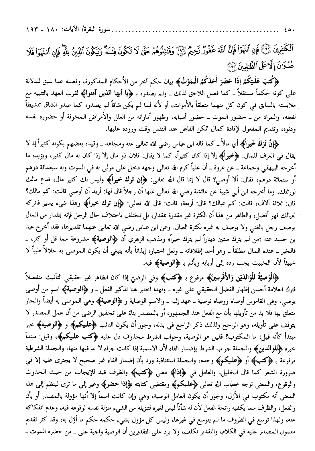 الْوَصِيَّةُ لِلْوالِدَيْنِ وَالْأَقْرَبِينَ مرفوع ب كُتِبَ وفي الرضيّ إذا كان الظاهر غير حقيقي التأنيث منفصلا فترك العلامة أحسن إظهار الفضل الحقيقي على غيره- ولهذا اختير هنا تذكير الفعل- والْوَصِيَّةُ اسم من أوصى يوصي، وفي القاموس أوصاه ووصاه توصية- عهد إليه- والاسم الوصاية والْوَصِيَّةُ وهي الموصى به أيضا والجار متعلق بها فلا بد من تأويلها بأن مع الفعل عند الجمهور، أو بالمصدر بناء على تحقيق الرضى من أن عمل المصدر لا يتوقف على تأويله، وهو الراجح ولذلك ذكر الراجع في بدله، وجوز أن يكون النائب عَلَيْكُمْ والْوَصِيَّةُ خبر مبتدأ كأنه قيل: ما المكتوب؟ فقيل هو الوصية، وجواب الشرط محذوف دل عليه كُتِبَ عَلَيْكُمْ، وقيل: مبتدأ خبره لِلْوالِدَيْنِ والجملة جواب الشرط بإضمار الفاء لأن الاسمية إذا كانت جزاء لا بد فيها منها، والجملة الشرطية مرفوعة ب كُتِبَ أو عَلَيْكُمْ وحده، والجملة استئنافية ورد بأن إضمار الفاء غير صحيح لا يجترى عليه إلا في ضرورة الشعر كما قال الخليل، والعامل في إِذا معنى كُتِبَ والظرف قيد للإيجاب من حيث الحدوث والوقوع، والمعنى توجه خطاب الله تعالى عَلَيْكُمْ ومقتضى كتابته إِذا حَضَرَ وغير إلى ما ترى لينظم إلى هذا المعنى أنه مكتوب في الأزل، وجوز أن يكون العامل الوصية، وهي وإن كانت اسما إلا أنها مؤولة بالمصدر أو بأن والفعل، والظرف مما يكفيه رائحة الفعل لأن له شأنا ليس لغيره لتنزيله من الشيء منزلة نفسه لوقوعه فيه، وعدم انفكاكه عنه، ولهذا توسع في الظروف ما لم يتوسع في غيرها، وليس كل مؤول بشيء حكمه حكم ما أوّل به، وقد كثر تقديم معمول المصدر عليه في الكلام، والتقدير تكلف، ولا يرد على التقديرين أن الوصية واجبة على- من حضره الموت-