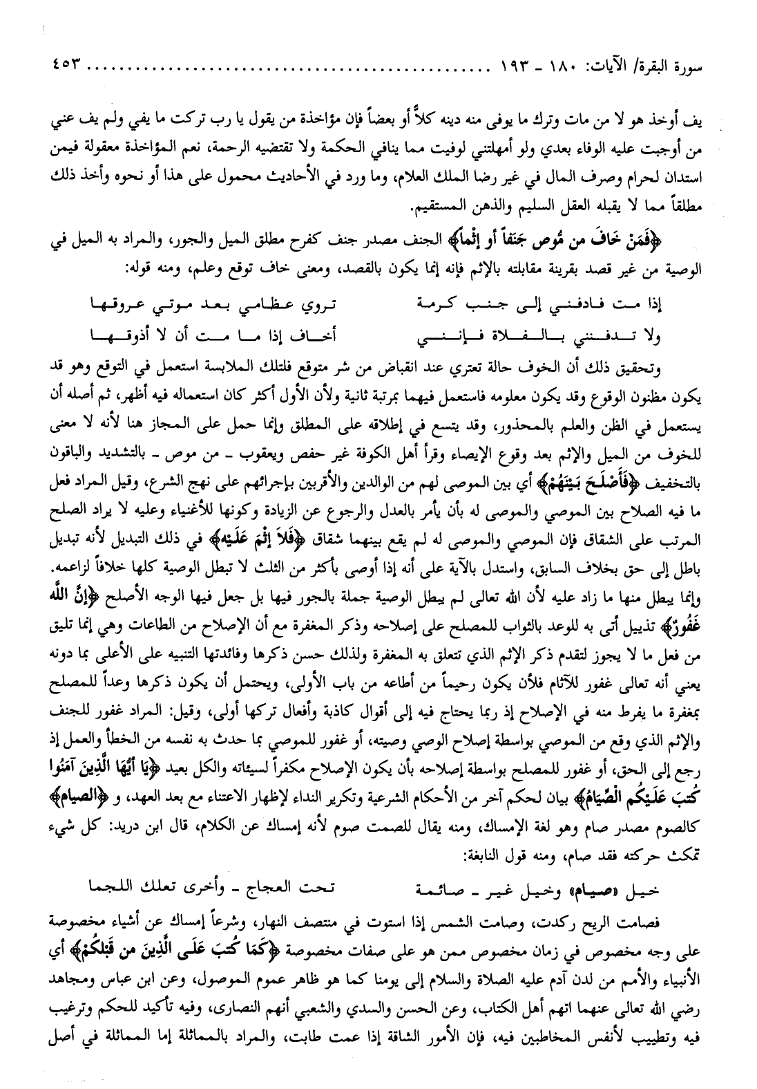 وإنما يبطل منها ما زاد عليه لأن الله تعالى لم يبطل الوصية جملة بالجور فيها بل جعل فيها الوجه الأصلح إِنَّ اللَّهَ غَفُورٌ تذييل أتى به للوعد بالثواب للمصلح على إصلاحه وذكر المغفرة مع أن الإصلاح من الطاعات وهي إنما تليق من فعل ما لا يجوز لتقدم ذكر الإثم الذي تتعلق به المغفرة ولذلك حسن ذكرها وفائدتها التنبيه على الأعلى بما دونه يعني أنه تعالى غفور للآثام فلأن يكون رحيما من أطاعه من باب الأولى، ويحتمل أن يكون ذكرها وعدا للمصلح بمغفرة ما يفرط منه في الإصلاح إذ ربما يحتاج فيه إلى أقوال كاذبة وأفعال تركها أولى، وقيل: المراد غفور للجنف والإثم الذي وقع من الموصي بواسطة إصلاح الوصي وصيته، أو غفور للموصي بما حدث به نفسه من الخطأ والعمل إذ رجع إلى الحق، أو غفور للمصلح بواسطة إصلاحه بأن يكون الإصلاح مكفرا لسيئاته والكل بعيد يا أَيُّهَا الَّذِينَ آمَنُوا كُتِبَ عَلَيْكُمُ الصِّيامُ بيان لحكم آخر من الأحكام الشرعية وتكرير النداء لإظهار الاعتناء مع بعد العهد، والصِّيامُ كالصوم مصدر صام وهو لغة الإمساك، ومنه يقال للصمت صوم لأنه إمساك عن الكلام، قال ابن دريد: كل شيء تمكث حركته فقد صام، ومنه قول النابغة: