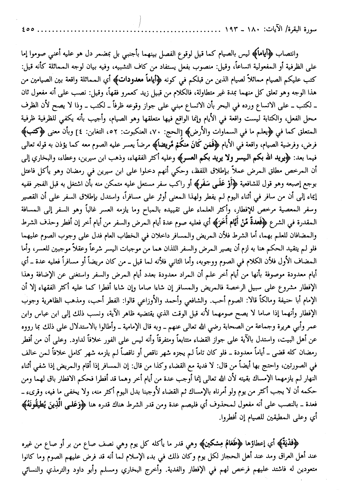 كتب عليكم الصيام مماثلا لصيام الذين من قبلكم في كونه أَيَّاماً مَعْدُوداتٍ أي المماثلة واقعة بين الصيامين من هذا الوجه وهو تعلق كل منهما بمدة غير متطاولة، فالكلام من قبيل زيد كعمرو فقها، وقيل: نصب على أنه مفعول ثان- لكتب- على الاتساع ورده في البحر بأن الاتساع مبني على جواز وقوعه ظرفا- لكتب- وذا لا يصح لأن الظرف محل الفعل، والكتابة ليست واقعة في الأيام وإنما الواقع فيها متعلقها وهو الصيام، وأجيب بأنه يكفي للظرفية ظرفية المتعلق كما في يَعْلَمُ ما فِي السَّماواتِ وَالْأَرْضِ [الحج: 70، العنكبوت: 52، التغابن: 4] وبأن معنى كُتِبَ فرض، وفرضية الصيام، واقعة في الأيام وَمَنْ كانَ مَرِيضاً مرضا يعسر عليه الصوم معه كما يؤذن به قوله تعالى فيما بعد: يُرِيدُ اللَّهُ بِكُمُ الْيُسْرَ وَلا يُرِيدُ بِكُمُ الْعُسْرَ وعليه أكثر الفقهاء، وذهب ابن سيرين، وعطاء، والبخاري إلى أن المرخص مطلق المرض عملا بإطلاق اللفظ، وحكي أنهم دخلوا على ابن سيرين في رمضان وهو يأكل فاعتل بوجع إصبعه وهو قول للشافعية أَوْ عَلى سَفَرٍ أو راكب سفر مستعل عليه متمكن منه بأن اشتغل به قبل الفجر ففيه إيماء إلى أن من سافر في أثناء اليوم لم يفطر ولهذا المعنى أوثر على مسافرا، واستدل بإطلاق السفر على أن القصير وسفر المعصية مرخص للإفطار، وأكثر العلماء على تقييده بالمباح وما يلزمه العسر غالبا وهو السفر إلى المسافة المقدرة في الشرع فَعِدَّةٌ مِنْ أَيَّامٍ أُخَرَ أي فعليه صوم عدة أيام المرض والسفر من أيام أخر إن أفطر وحذف الشرط والمضافان للعلم بهما، أما الشرط فلأن المريض والمسافر داخلان في الخطاب العام فدل على وجوب الصوم عليهما فلو لم يتقيد الحكم هنا به لزم أن يصير المرض والسفر اللذان هما من موجبات اليسر شرعا وعقلا موجبين للعسر، وأما المضاف الأول فلأن الكلام في الصوم ووجوبه، وأما الثاني فلأنه لما قيل- من كان مريضا أو مسافرا فعليه عدة- أي أيام معدودة موصوفة بأنها من أيام أخر علم أن المراد معدودة بعدد أيام المرض والسفر واستغنى عن الإضافة وهذا الإفطار مشروع على سبيل الرخصة فالمريض والمسافر إن شاءا صاما وإن شاءا أفطرا كما عليه أكثر الفقهاء إلا أن الإمام أبا حنيفة ومالكا قالا: الصوم أحب. والشافعي وأحمد والأوزاعي قالوا: الفطر أحب، ومذهب الظاهرية وجوب الإفطار وأنهما إذا صاما لا يصح صومهما لأنه قبل الوقت الذي يقتضيه ظاهر الآية، ونسب ذلك إلى ابن عباس وابن عمر وأبي هريرة وجماعة من الصحابة رضي الله تعالى عنهم- وبه قال الإمامية- وأطالوا بالاستدلال على ذلك بما رووه عن أهل البيت، واستدل بالآية على جواز القضاء متتابعا ومتفرقا وأنه ليس على الفور خلافا لداود. وعلى أن من أفطر رمضان كله قضى- أياما معدودة- فلو كان تاما لم يجزه شهر ناقص أو ناقصا لم يلزمه شهر كامل خلافا لمن خالف في الصورتين، واحتج بها أيضا من قال: لا فدية مع القضاء وكذا من قال: إن المسافر إذا أقام والمريض إذا شفي أثناء النهار لم يلزمهما الإمساك بقيته لأن الله تعالى إنما أوجب عدة من أيام أخر وهما قد أفطرا فحكم الإفطار باق لهما ومن حكمه أن لا يجب أكثر من يوم ولو أمرناه بالإمساك ثم القضاء لأوجبنا بدل اليوم أكثر منه، ولا يخفى ما فيه، وقرىء- فعدة- بالنصب على أنه مفعول لمحذوف أي فليصم عدة ومن قدر الشرط هناك قدره هنا وَعَلَى الَّذِينَ يُطِيقُونَهُ أي وعلى المطيقين للصيام إن أفطروا.
