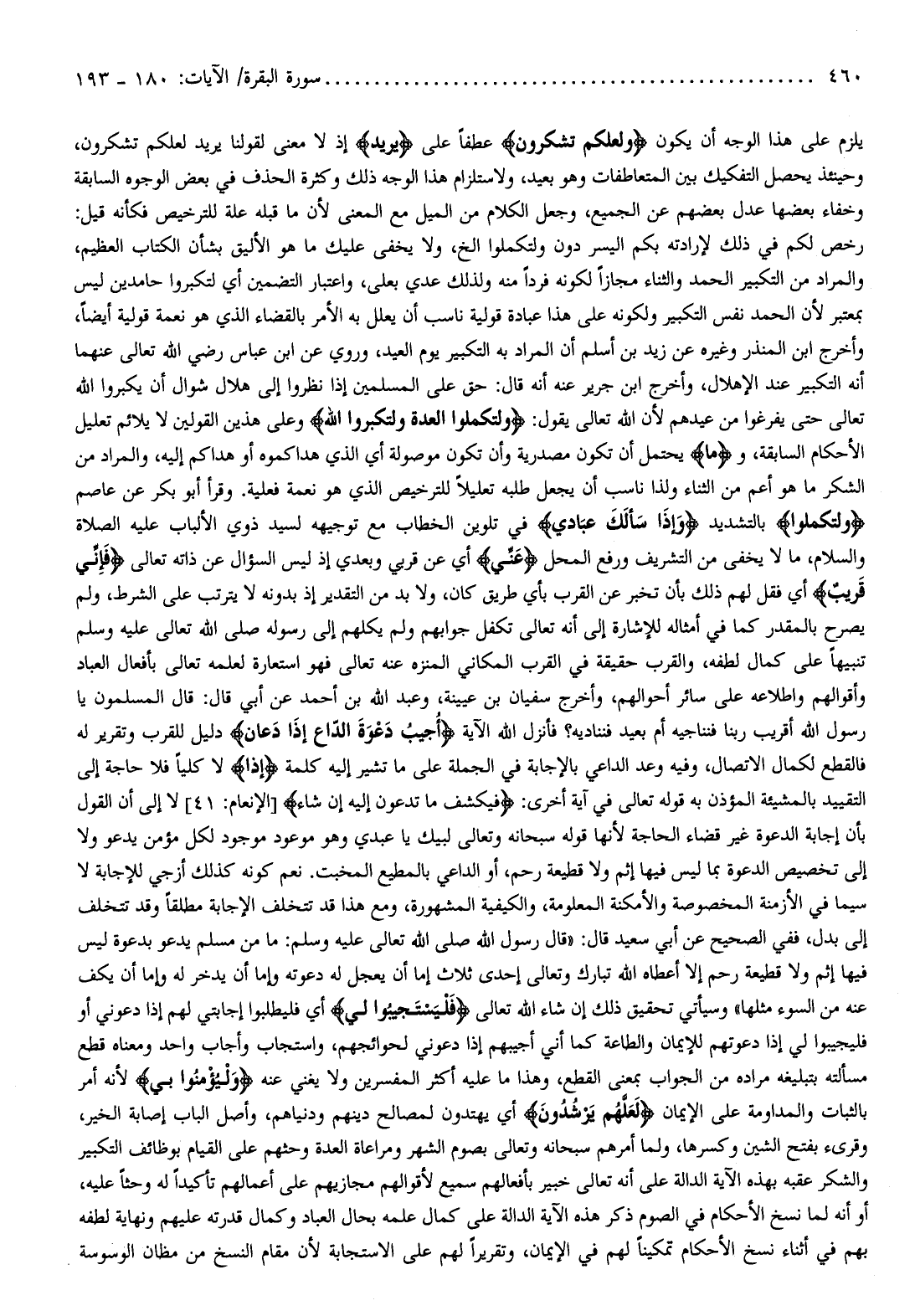 رخص لكم في ذلك لإرادته بكم اليسر دون ولتكملوا إلخ، ولا يخفى عليك ما هو الأليق بشأن الكتاب العظيم، والمراد من التكبير الحمد والثناء مجازا لكونه فردا منه ولذلك عدي بعلى، واعتبار التضمين أي لتكبروا حامدين ليس بمعتبر لأن الحمد نفس التكبير ولكونه على هذا عبادة قولية ناسب أن يعلل به الأمر بالقضاء الذي هو نعمة قولية أيضا، وأخرج ابن المنذر وغيره عن زيد بن أسلم أن المراد به التكبير يوم العيد، وروي عن ابن عباس رضي الله تعالى عنهما أنه التكبير عند الإهلال، وأخرج ابن جرير عنه أنه قال: حق على المسلمين إذا نظروا إلى هلال شوال أن يكبروا الله تعالى حتى يفرغوا من عيدهم لأن الله تعالى يقول: وَلِتُكْمِلُوا الْعِدَّةَ وَلِتُكَبِّرُوا اللَّهَ وعلى هذين القولين لا يلائم تعليل الأحكام السابقة، وما يحتمل أن تكون مصدرية وأن تكون موصولة أي الذي هداكموه أو هداكم إليه، والمراد من الشكر ما هو أعم من الثناء ولذا ناسب أن يجعل طلبه تعليلا للترخيص الذي هو نعمة فعلية. وقرأ أبو بكر عن عاصم وَلِتُكْمِلُوا بالتشديد وَإِذا سَأَلَكَ عِبادِي في تلوين الخطاب مع توجيهه لسيد ذوي الألباب عليه الصلاة والسلام، ما لا يخفى من التشريف ورفع المحل عَنِّي أي عن قربي وبعدي إذ ليس السؤال عن ذاته تعالى فَإِنِّي قَرِيبٌ أي فقل لهم ذلك بأن تخبر عن القرب بأي طريق كان، ولا بد من التقدير إذ بدونه لا يترتب على الشرط، ولم يصرح بالمقدر كما في أمثاله للإشارة إلى أنه تعالى تكفل جوابهم ولم يكلهم إلى رسوله صلى الله تعالى عليه وسلم تنبيها على كمال لطفه، والقرب حقيقة في القرب المكاني المنزه عنه تعالى فهو استعارة لعلمه تعالى بأفعال العباد وأقوالهم واطلاعه على سائر أحوالهم،