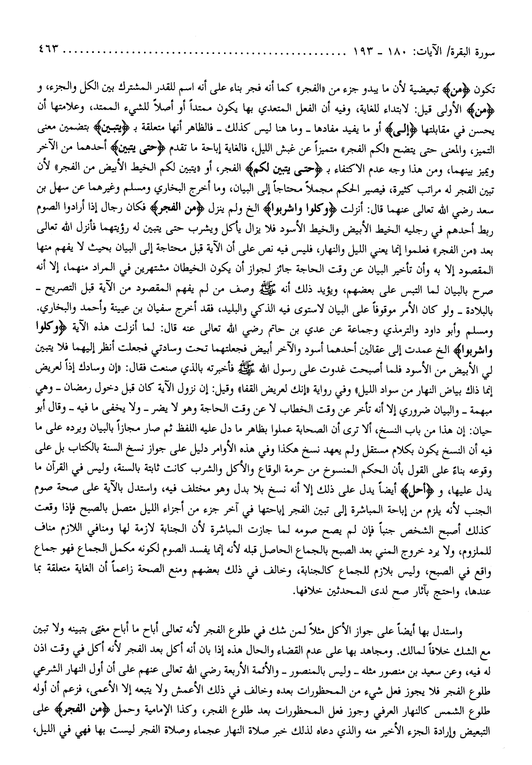 تكون مِنَ تبعيضية لأن ما يبدو جزء من «الفجر» كما أنه فجر بناء على أنه اسم للقدر المشترك بين الكل والجزء، ومِنَ الأولى قيل: لابتداء للغاية، وفيه أن الفعل المتعدي بها يكون ممتدا أو أصلا للشيء الممتد، وعلامتها أن يحسن في مقابلتها إِلى أو ما يفيد مفادها- وما هنا ليس كذلك- فالظاهر أنها متعلقة ب يَتَبَيَّنَ بتضمين معنى التميز، والمعنى حتى يتضح «لكم الفجر» متميزا عن غبش الليل، فالغاية إباحة ما تقدم حَتَّى يَتَبَيَّنَ أحدهما من الآخر ويميز بينهما، ومن هذا وجه عدم الاكتفاء ب حَتَّى يَتَبَيَّنَ لَكُمُ الفجر، أو «يتبين لكم الخيط الأبيض من الفجر» لأن تبين الفجر له مراتب كثيرة، فيصير الحكم مجملا محتاجا إلى البيان، وما أخرج البخاري ومسلم وغيرهما عن سهل بن سعد رضي الله تعالى عنهما قال: أنزلت وَكُلُوا وَاشْرَبُوا إلخ ولم ينزل مِنَ الْفَجْرِ فكان رجال إذا أرادوا الصوم ربط أحدهم في رجليه الخيط الأبيض والخيط الأسود فلا يزال يأكل ويشرب حتى يتبين له رؤيتهما فأنزل الله تعالى بعد «من الفجر» فعلموا إنما يعني الليل والنهار، فليس فيه نص على أن الآية قبل محتاجة إلى البيان بحيث لا يفهم منها المقصود إلا به وأن تأخير البيان عن وقت الحاجة جائز لجواز أن يكون الخيطان مشتهرين في المراد منهما، إلا أنه صرح بالبيان لما التبس على بعضهم، ويؤيد ذلك أنه صلّى الله عليه وسلّم وصف من لم يفهم المقصود من الآية قبل التصريح- بالبلادة- ولو كان الأمر موقوفا على البيان لاستوى فيه الذكي والبليد،