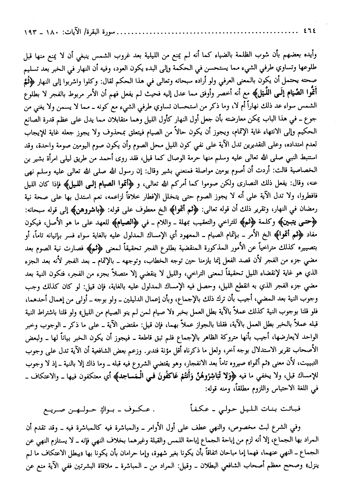 ولو قلنا باشتراط النية قبله عملا بالخبر بطل العمل بالآية، فقلنا بالجواز عملا بهما، فإن قيل: مقتضى الآية- على ما ذكر- الوجوب وخبر الواحد لا يعارضها، أجيب بأنها متروكة الظاهر بالإجماع فلم تبق قاطعة- فيجوز أن يكون الخبر بيانا لها- ولبعض الأصحاب تقرير الاستدلال بوجه آخر، ولعل ما ذكرناه أقل مؤنة فتدبر. وزعم بعض الشافعية أن الآية تدل على وجوب التبييت، لأن معنى «ثم أتموا» صيروه تاما بعد الانفجار، وهو يقتضي الشروع فيه قبله- وما ذاك إلا بالنية- إذ لا وجوب للإمساك قبل، ولا يخفي ما فيه وَلا تُبَاشِرُوهُنَّ وَأَنْتُمْ عاكِفُونَ فِي الْمَساجِدِ أي معتكفون فيها- والاعتكاف- في اللغة الاحتباس واللزوم مطلقا، ومنه قوله:
