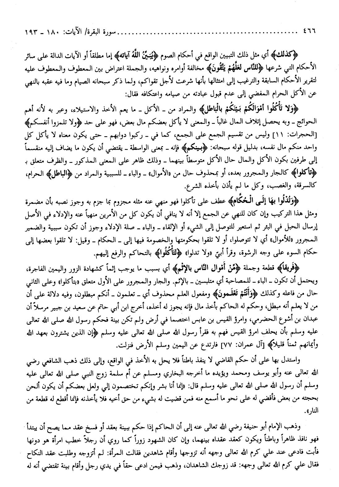 فَرِيقاً قطعة وجملة مِنْ أَمْوالِ النَّاسِ بِالْإِثْمِ أي بسبب ما يوجب إثما كشهادة الزور واليمين الفاجرة، ويحتمل أن تكون- الباء- للمصاحبة أي متلبسين- بالإثم. والجار والمجرور على الأول متعلق «بتأكلوا» وعلى الثاني حال من فاعله وكذلك وَأَنْتُمْ تَعْلَمُونَ ومفعول العلم محذوف أي- تعلمون- أنكم مبطلون، وفيه دلالة على أن من لا يعلم أنه مبطل، وحكم له الحاكم بأخذ مال فإنه يجوز له أخذه،