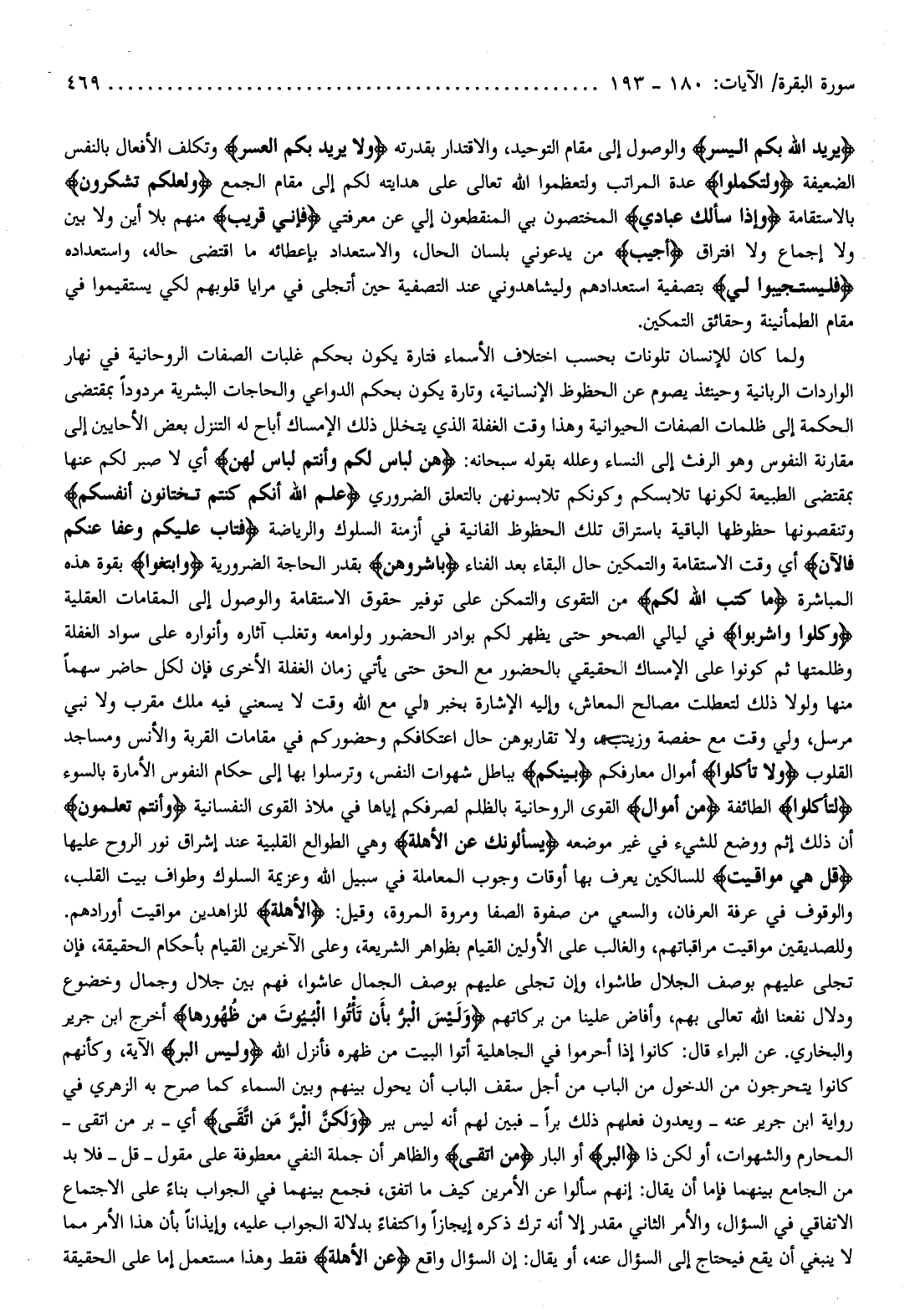 يُرِيدُ اللَّهُ بِكُمُ الْيُسْرَ والوصول إلى مقام التوحيد، والاقتدار بقدرته وَلا يُرِيدُ بِكُمُ الْعُسْرَ وتكلف الأفعال بالنفس الضعيفة وَلِتُكْمِلُوا عدة المراتب ولتعظموا الله تعالى على هدايته لكم إلى مقام الجمع وَلَعَلَّكُمْ تَشْكُرُونَ بالاستقامة وَإِذا سَأَلَكَ عِبادِي المختصون بي المنقطعون إلى عن معرفتي فَإِنِّي قَرِيبٌ منهم بلا أين ولا بين ولا إجماع ولا افتراق أُجِيبُ من يدعوني بلسان الحال، والاستعداد بإعطائه ما اقتضى حاله، واستعداده فَلْيَسْتَجِيبُوا لِي بتصفية استعدادهم وليشاهدوني عند التصفية حين أتجلى في مرايا قلوبهم لكي يستقيموا في مقام الطمأنينة وحقائق التمكين.