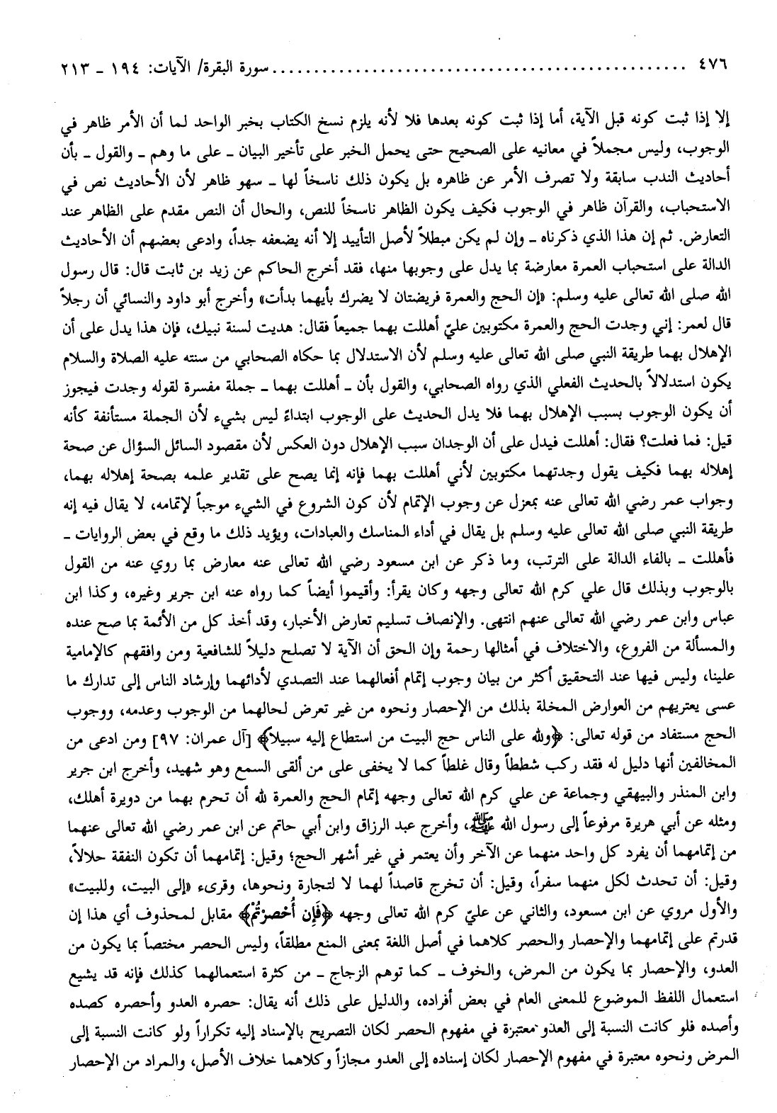 وأخرج عبد الرزاق وابن أبي حاتم عن ابن عمر رضي الله تعالى عنهما من إتمامهما أن يفرد كل واحد منهما عن الآخر وأن يعتمر في غير أشهر الحج وقيل: إتمامهما أن تكون النفقة حلالا، وقيل: أن تحدث لكل منهما سفرا، وقيل: أن تخرج قاصدا لهما لا لتجارة ونحوها، وقرىء «إلى البيت، وللبيت» والأول مروي عن ابن مسعود، والثاني عن عليّ كرم الله تعالى وجهه فَإِنْ أُحْصِرْتُمْ مقابل لمحذوف أي هذا إن قدرتم على إتمامهما والإحصار والحصر كلاهما في أصل اللغة بمعنى المنع مطلقا، وليس الحصر مختصا بما يكون من العدو، والإحصار بما يكون من المرض، والخوف- كما توهم الزجاج- من كثرة استعمالهما كذلك فإنه قد يشيع استعمال اللفظ الموضوع للمعنى العام في بعض أفراده، والدليل على ذلك أنه يقال: حصره العدو وأحصره كصده وأصده فلو كانت النسبة إلى العدو معتبرة في مفهوم الحصر لكان التصريح بالإسناد إليه تكرارا ولو كانت النسبة إلى المرض ونحوه معتبرة في مفهوم الإحصار لكان إسناده إلى العدو مجازا وكلاهما خلاف الأصل، والمراد من الإحصار