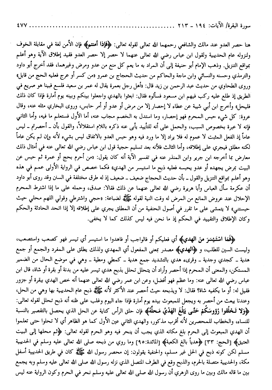 هنا حصر العدو عند مالك والشافعي رحمهما الله تعالى لقوله تعالى: فَإِذا أَمِنْتُمْ فإن الأمن لغة في مقابلة الخوف ولنزوله عام الحديبية ولقول ابن عباس رضي الله تعالى عنهما لا حصر إلا حصر العدو فقيد إطلاق الآية وهو أعلم بمواقع التنزيل. وذهب الإمام أبو حنيفة إلى أن المراد به ما يعم كل منع من عدو ومرض وغيرهما، فقد أخرج أبو داود والترمذي وحسنه والنسائي وابن ماجة والحاكم من حديث الحجاج بن عمرو «من كسر أو عرج فعليه الحج من قابل» وروى الطحاوي من حديث عبد الرحمن بن زيد قال: «أهل رجل بعمرة يقال له عمر بن سعيد فلسع فبينا هو صريع في الطريق إذ طلع عليه ركب فيهم ابن مسعود فسألوه فقال: ابعثوا بالهدي واجعلوا بينكم وبينه يوم أمارة فإذا كان ذلك فليحل» وأخرج ابن أبي شيبة عن عطاء لا إحصار إلا من مرض أو عدو أو أمر حابس، وروى البخاري مثله عنه، وقال عروة: كل شيء حبس المحرم فهو إحصار، وما استدل به الخصم مجاب عنه، أما الأول فستعلم ما فيه، وأما الثاني فإنه لا عبرة بخصوص السبب، والحمل على أنه للتأييد يأبى عنه ذكره باللام استقلالا، والقول بأن- أحصرتم- ليس عاما إذ الفعل المثبت لا عموم له فلا يراد إلا ما ورد فيه وهو حبس العدو بالاتفاق ليس بشيء لأنه وإن لم يكن عاما لكنه مطلق فيجري على إطلاقه، وأما الثالث فلأنه بعد تسليم حجية قول ابن عباس رضي الله تعالى عنه في أمثال ذلك معارض بما أخرجه ابن جرير وابن المنذر عنه في تفسير الآية أنه كان يقول: «من أحرم بحج أو عمرة ثم حبس عن البيت بمرض يجهده أو عدو يحبسه فعليه ذبح ما استيسر من الهدي» فكما خصص في الرواية الأولى عمم في هذه وهو أعلم بمواقع التنزيل والقول- بأن حديث الحجاج ضعيف- ضعيف إذ له طرق مختلفة في السنن وقد روى أبو داود أن عكرمة سأل العباس وأبا هريرة رضي الله تعالى عنهما عن ذلك فقالا: صدق، وحمله على ما إذا اشترط المحرم الإحلال عند عروض المانع من المرض له وقت النية