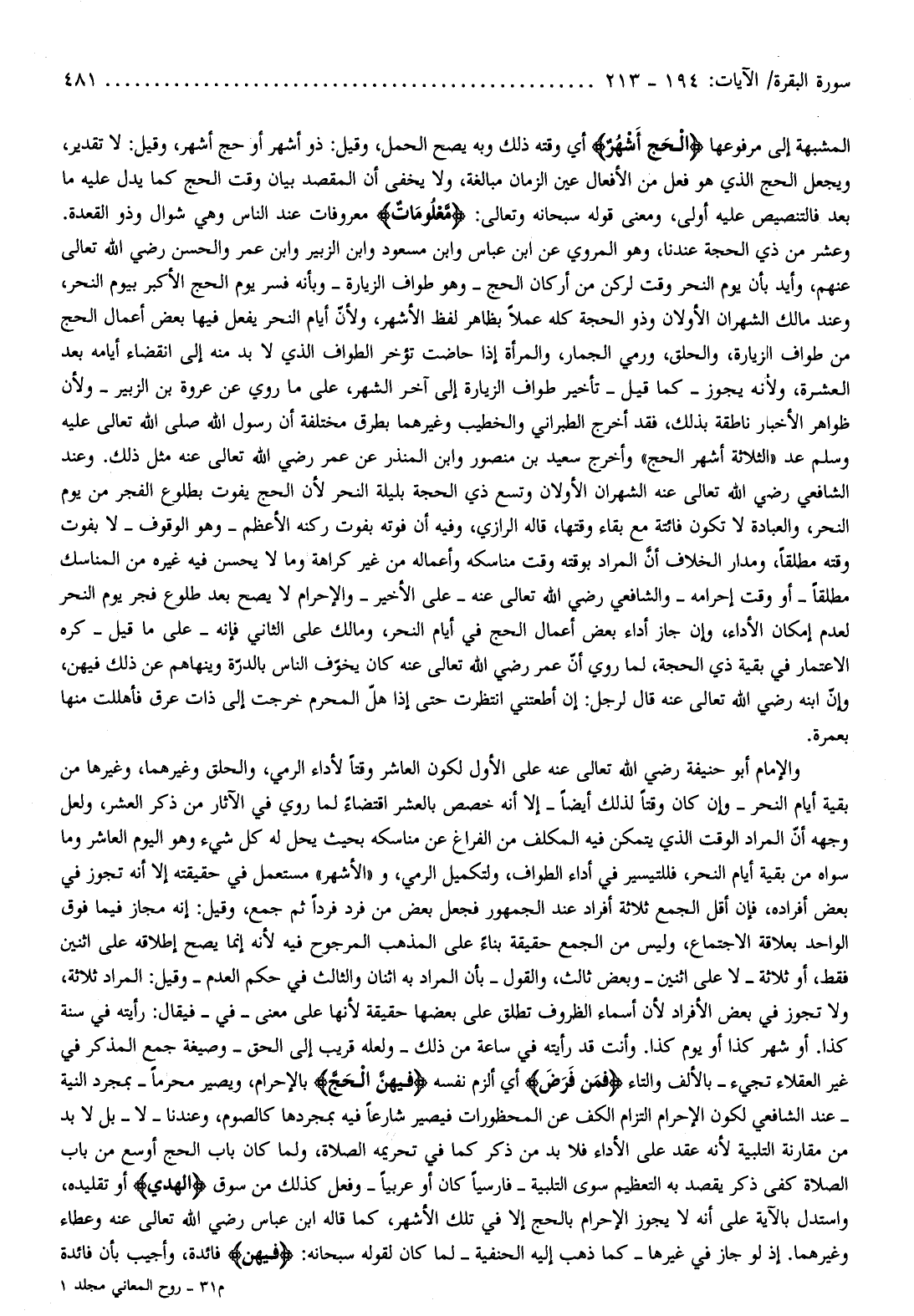 وعشر من ذي الحجة عندنا، وهو المروي عن ابن عباس وابن مسعود وابن الزبير وابن عمر والحسن رضي الله تعالى عنهم، وأيد بأن يوم النحر وقت لركن من أركان الحج- وهو طواف الزيارة- وبأنه فسر يوم الحج الأكبر بيوم النحر، وعند مالك الشهران الأولان وذو الحجة كله عملا بظاهر لفظ الأشهر، ولأنّ أيام النحر يفعل فيها بعض أعمال الحج من طواف الزيارة، والحلق، ورمي الجمار، والمرأة إذا حاضت تؤخر الطواف الذي لا بد منه إلى انقضاء أيامه بعد العشرة، ولأنه يجوز- كما قيل- تأخير طواف الزيارة إلى آخر الشهر، على ما روي عن عروة بن الزبير- ولأن ظواهر الأخبار ناطقة بذلك،