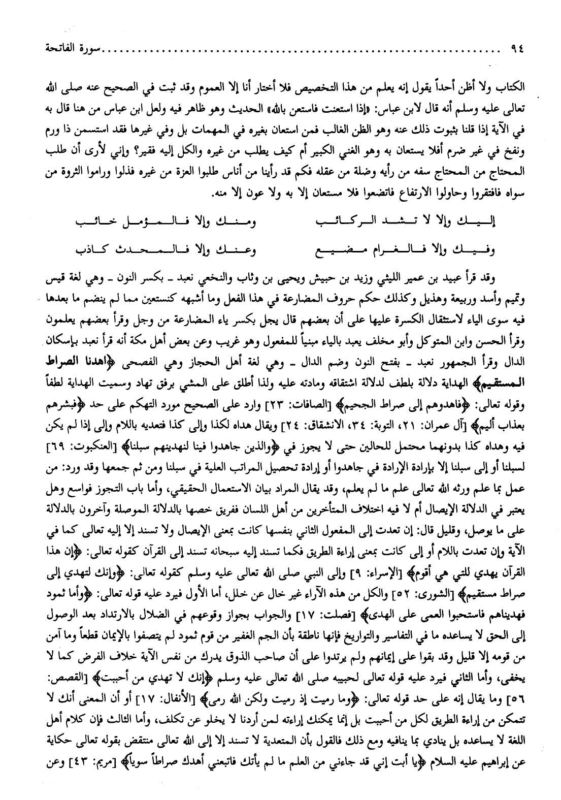 وهو ظاهر فيه ولعل ابن عباس من هنا قال به في الآية إذا قلنا بثبوت ذلك عنه وهو الظن الغالب فمن استعان بغيره في المهمات بل وفي غيرها فقد استسمن ذا ورم ونفخ في غير ضرم أفلا يستعان به وهو الغني الكبير أم كيف يطلب من غيره والكل إليه فقير؟ وإني لأرى أن طلب المحتاج من المحتاج سفه من رأيه وضلة من عقله فكم قد رأينا من أناس طلبوا العزة من غيره فذلوا وراموا الثروة من سواه فافتقروا وحاولوا الارتفاع فاتضعوا فلا مستعان إلا به ولا عون إلا منه.