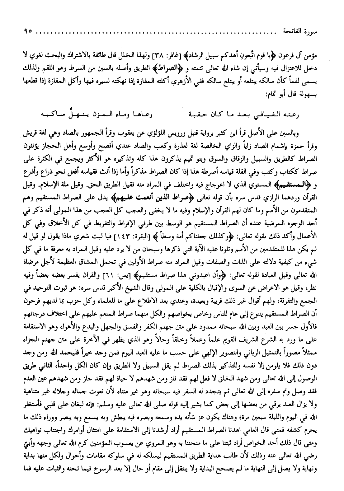 وهناك يكون عز شأنه يده وسمعه وبصره فبه يبطش وبه يسمع وبه يبصر ووراء ذلك ما يحرم كشفه فمتى قال العامي اهدنا الصراط المستقيم أراد أرشدنا إلى الاستقامة على امتثال أوامرك واجتناب نواهيك ومتى قال ذلك أحد الخواص أراد ثبتنا على ما منحتنا به وهو المروي عن يعسوب المؤمنين كرم الله تعالى وجهه وأبيّ رضي الله تعالى عنه وذلك لأن طالب هداية الطريق المستقيم ليسلكه له في سلوكه مقامات وأحوال ولكل منها بداية ونهاية ولا يصل إلى النهاية ما لم يصحح البداية ولا ينتقل إلى مقام أو حال إلا بعد الرسوخ فيما تحته والثبات عليه فما