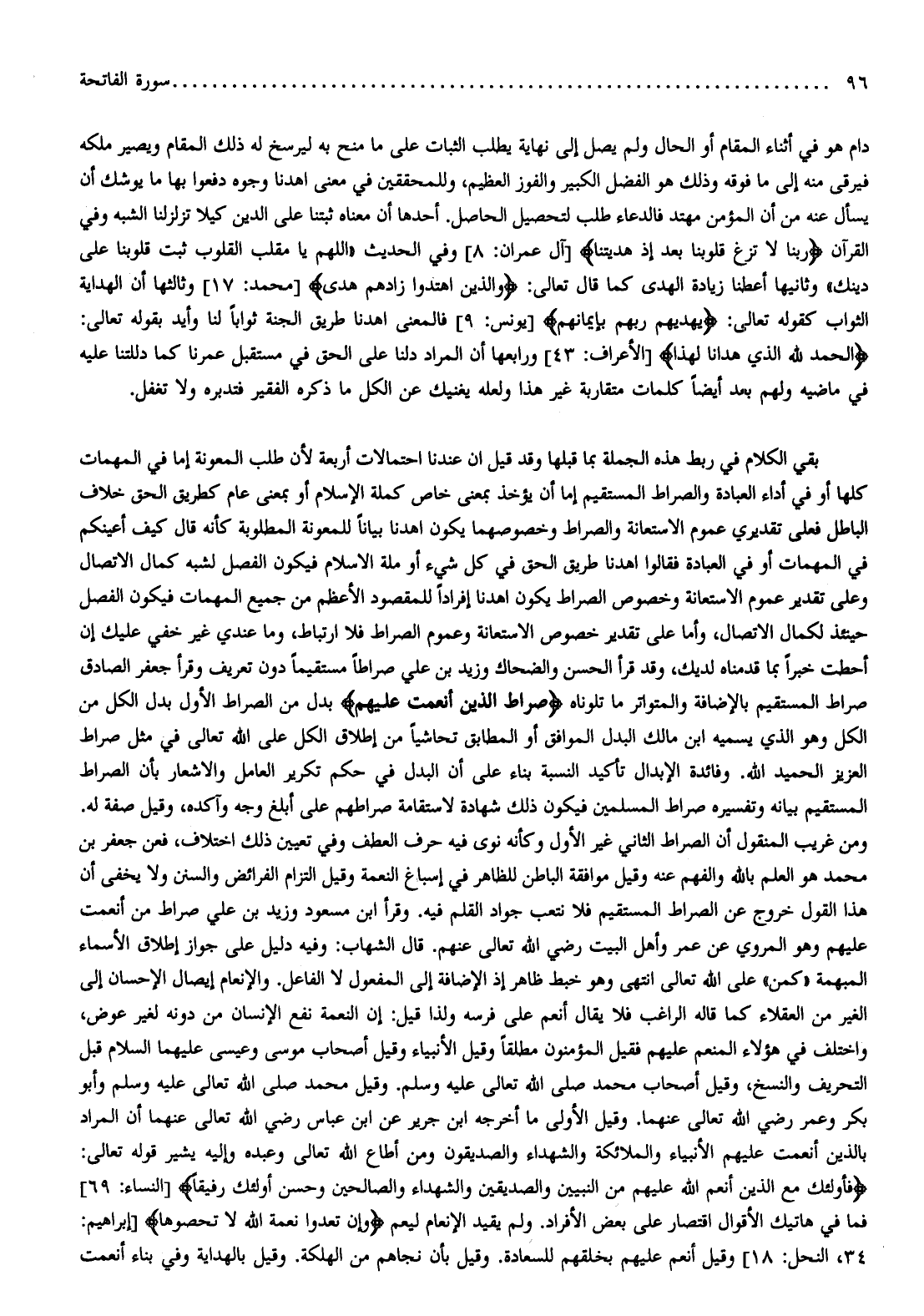فَأُولئِكَ مَعَ الَّذِينَ أَنْعَمَ اللَّهُ عَلَيْهِمْ مِنَ النَّبِيِّينَ وَالصِّدِّيقِينَ وَالشُّهَداءِ وَالصَّالِحِينَ وَحَسُنَ أُولئِكَ رَفِيقاً [النساء: 69] فما في هاتيك الأقوال اقتصار على بعض الأفراد. ولم يقيد الإنعام ليعم وَإِنْ تَعُدُّوا نِعْمَةَ اللَّهِ لا تُحْصُوها [إبراهيم: