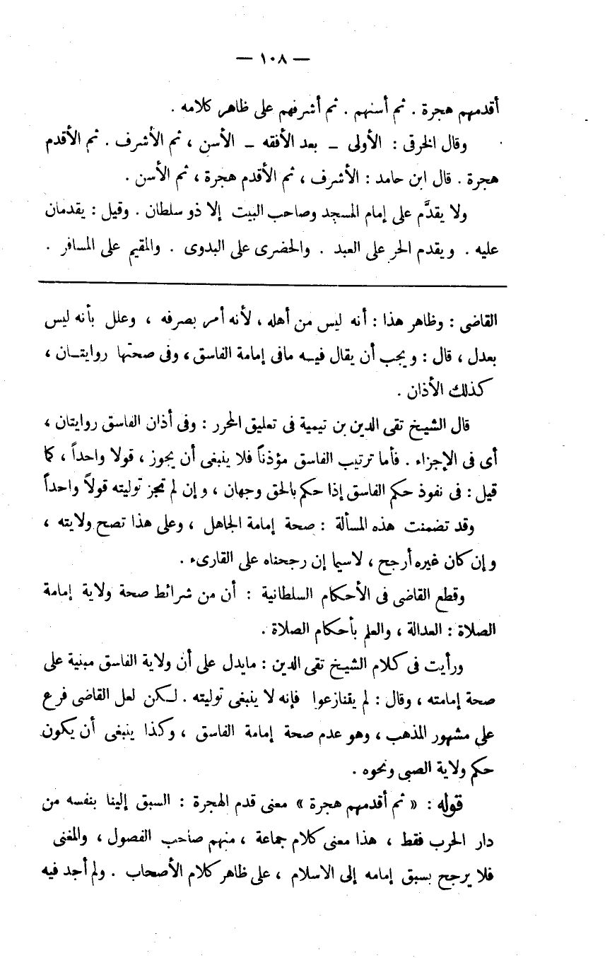 قوله: "ثم أقدمهم هجرة" معنى قدم الهجرة السبق إلينا بنفسه من دار الحرب فقط هذا معنى كلام جماعة منهم صاحب الفصول والمغني فلا يرجح بسبق إمامه إلى الاسلام على ظاهر كلام الأصحاب ولم أجد فيه