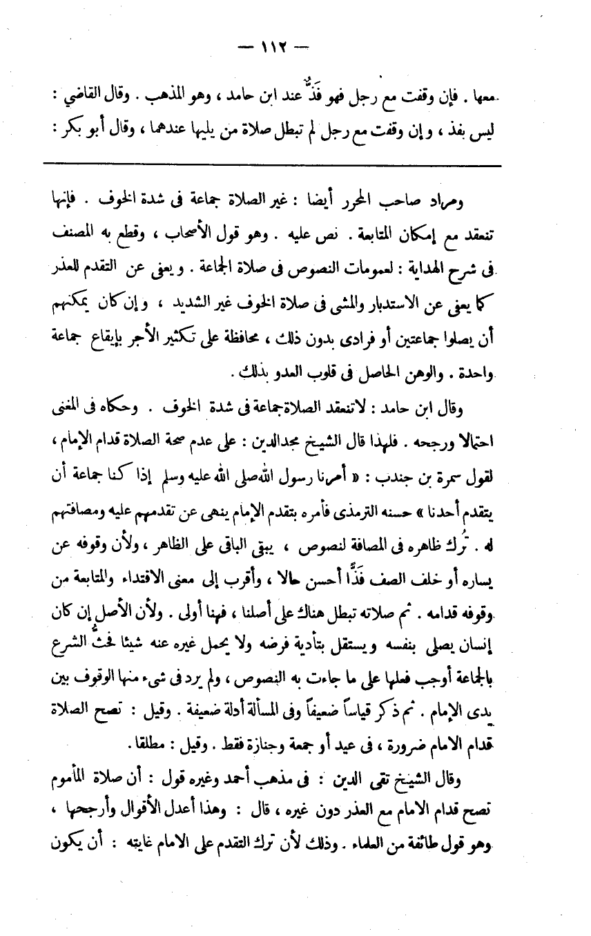 وقال ابن حامد لا تنعقد الصلاة جماعة في شدة الخوف وحكاه في المغني احتمالا ورجحه فلهذا قال الشيخ مجد الدين على عدم صحة الصلاة قدام الإمام لقول سمرة بن جندب " أمرنا رسول الله صلى الله عليه وسلم إذا كنا جماعة أن يتقدم أحدنا " حسنه الترمذي فأمره بتقدم الإمام ينهى عن تقدمهم عليه ومصافتهم له ترك ظاهره في المصافة لنصوص يبقى الباقي على الظاهر ولأن وقوفه عن يساره أو خلف الصف فذا أحسن حالا وأقرب إلى معنى الاقتداء والمتابعة من وقوفه قدامه ثم صلاته تبطل هناك على أصلنا فهنا أولى ولأن الأصل إن كان إنسان يصلي بنفسه ويستقل بتأدية فرضه ولا يحمل غيره عنه شيئا فحث الشرع بالجماعة أوجب فعلها على ما جاءت به النصوص ولم يرد في شيء منها الوقوف بين يدي الإمام ثم ذكر قياسا ضعيفا وفي المسألة أدلة ضعيفة وقيل: تصح الصلاة قدام الإمام ضرورة في عيد أو جمعة وجنازة فقط وقيل: مطلقا.