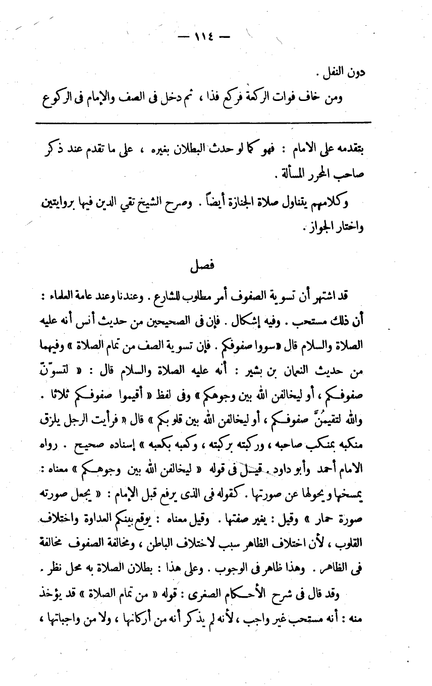 قد اشتهر أن تسوية الصفوف أمر مطلوب للشارع وعندنا وعند عامة العلماء أن ذلك مستحب وفيه إشكال فإن في الصحيحين من حديث أنس أنه عليه الصلاة والسلام قال: " سووا صفوفكم فإن تسوية الصف من تمام الصلاة" وفيهما من حديث النعمان بن بشير أنه عليه الصلاة والسلام قال " لتسون صفوفكم أو ليخالفن الله بين وجوهكم " وفي لفظ أقيموا صفوفكم ثلاثا والله لتقيمن صفوفكم أو ليخالفن الله بين قلوبكم قال فرأيت الرجل يلزق منكبه بمنكب صاحبه وركبته بركبته وكعبه بكعبه إسناده صحيح رواه الإمام أحمد وأبو داود قيل في قوله " ليخالفن الله بين وجوهكم " معناه يمسخها ويحولها عن صورتها كقوله في الذي يرفع قبل الإمام: " يجعل صورته صورة حمار " وقيل: يغير صفتها وقيل: معناه يوقع بينكم العداوة واختلاف القلوب لأن اختلاف الظاهر سبب لاختلاف الباطن ومخالفة الصفوف مخالفة في الظاهر وهذا ظاهر في الوجوب وعلى هذا بطلان الصلاة به محل نظر.