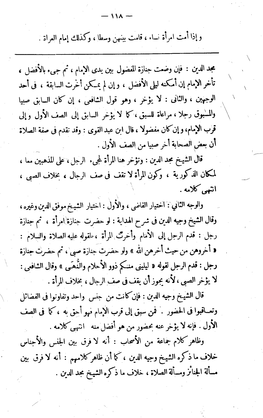 قال الشيخ مجد الدين وتؤخر هنا المرأة لمجيء الرجل على المذهبين معا لمكان الذكورية وكون المرأة لا تقف في صف الرجال بخلاف الصبي انتهى كلامه.