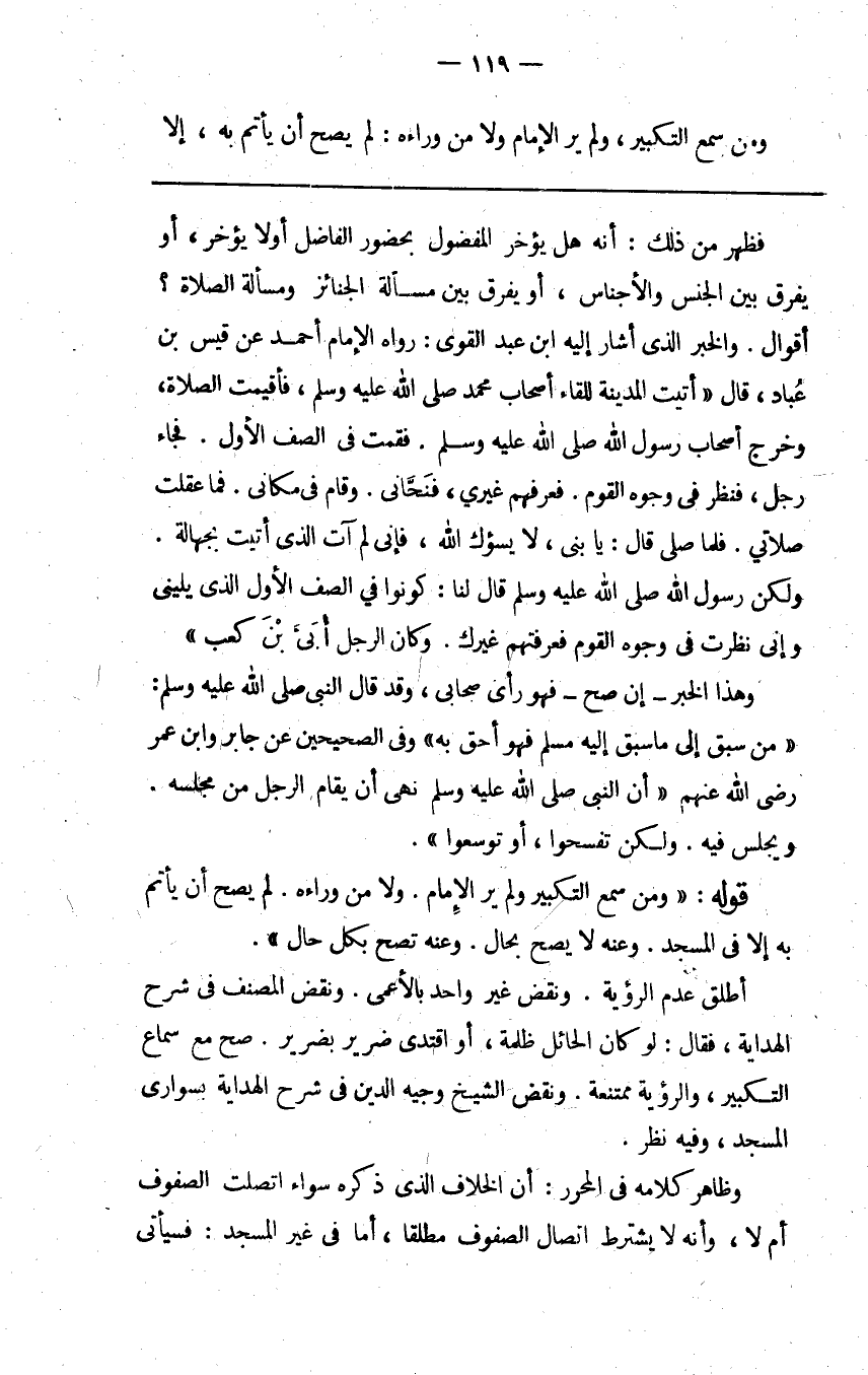 فظهر من ذلك أنه هل يؤخر المفضول بحضور الفاضل أولا يؤخر أو يفرق بين الجنس والأجناس أو يفرق بين مسألة الجنائز ومسألة الصلاة أقوال والخبر الذي أشار إليه ابن عبد القوي رواه الإمام أحمد عن قيس بن عباد قال أتيت المدينة للقاء أصحاب محمد صلى الله عليه وسلم فأقيمت الصلاة وخرج أصحاب رسول الله صلى الله عليه وسلم فقمت في الصف الأول فجاء رجل فنظر في وجوه القوم فعرفهم غيري فنحاني وقام في مكاني فما عقلت صلاتي فلما صلى قال يا بني لا يسؤك الله فإني لم آت الذي أتيت بجهالة ولكن رسول الله صلى الله عليه وسلم قال لنا: " كونوا في الصف الأول الذي يليني وإني نظرت في وجوه القوم فعرفتهم غيرك وكان الرجل أبي بن كعب ".