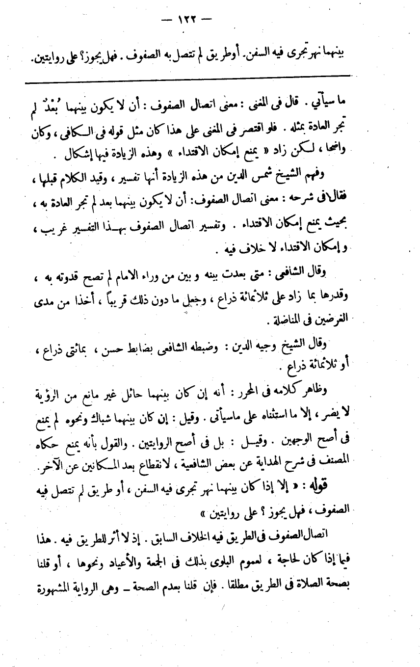 قوله: "إلا إذا كان بينهما نهر تجري فيه السفن أو طريق لم تتصل فيه الصفوف فهل يجوز على روايتين".